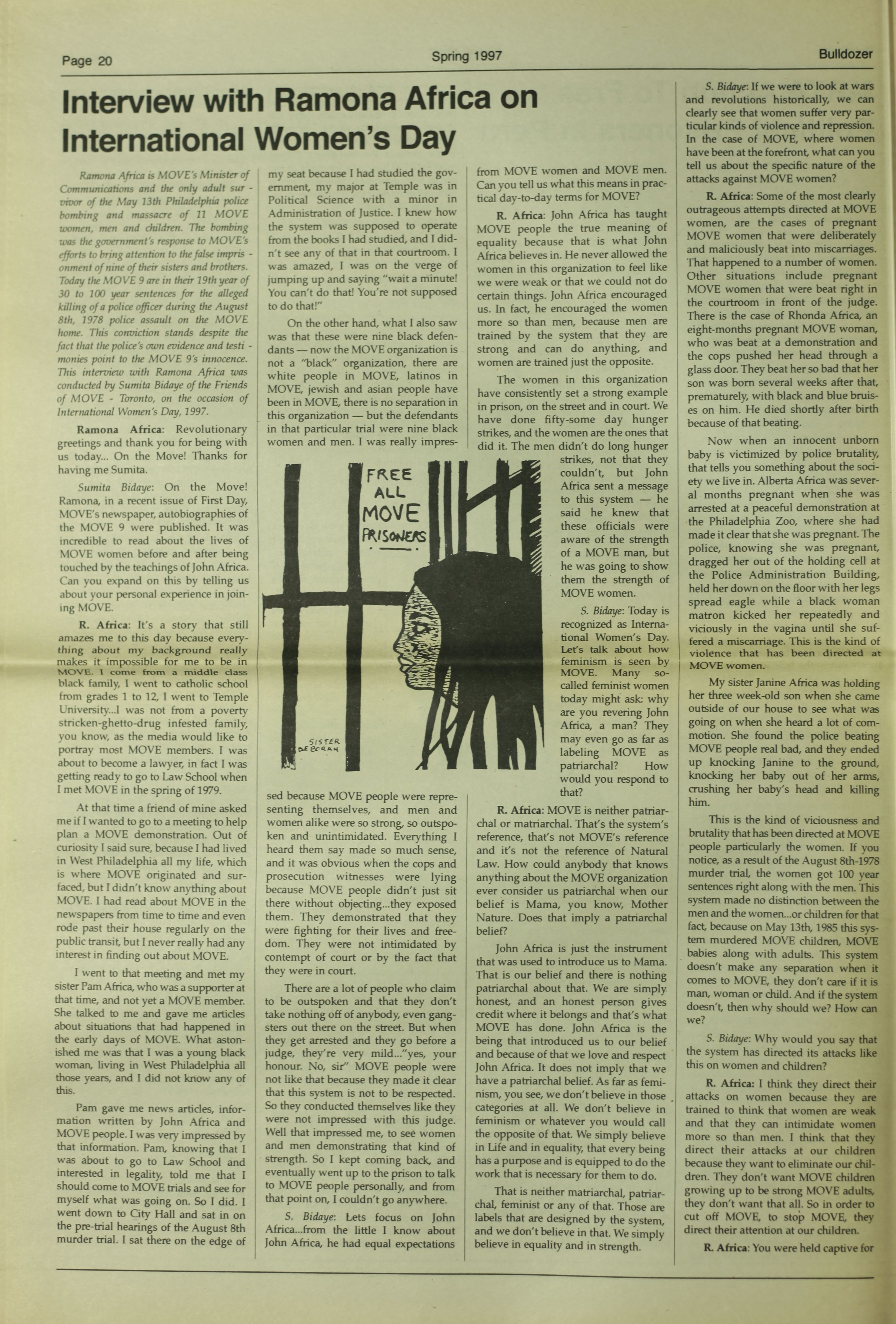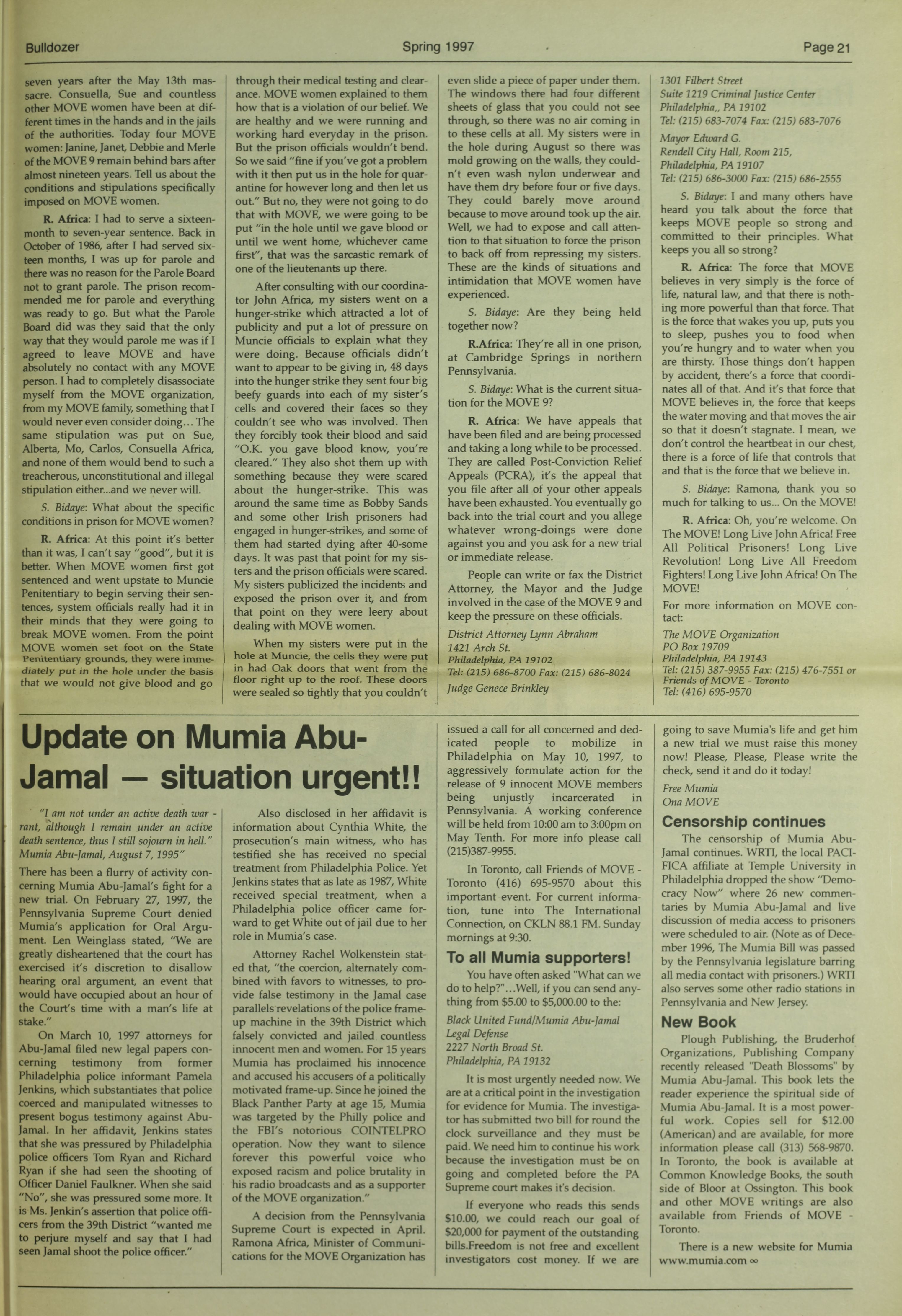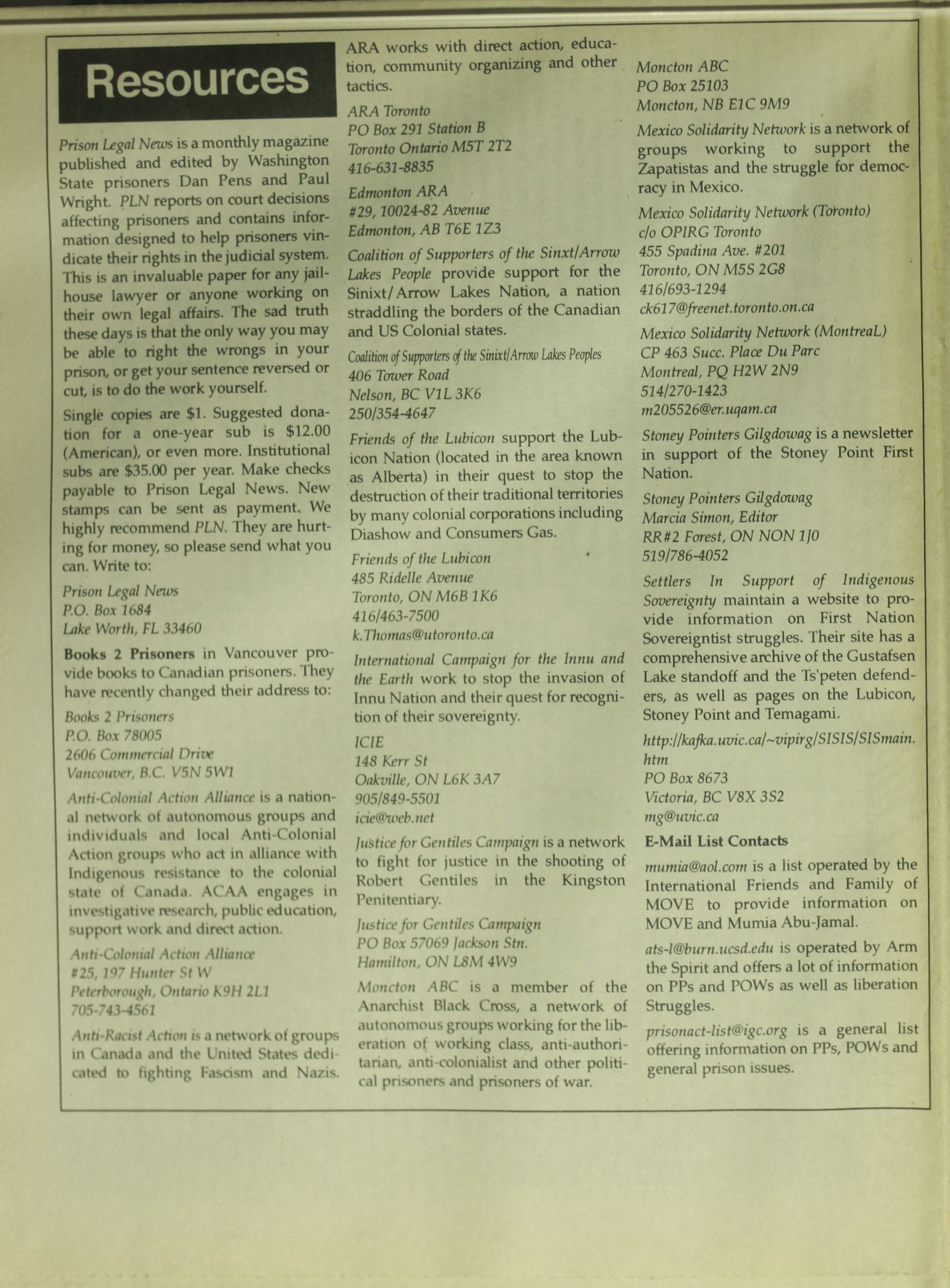 An anarchist publication from Toronto made to support prisoners in various penal institutions. It began in 1980 and featured articles, letters, art, poetry etc. by prisoners and ex-prisoners. By Spring 1997 it had incorporated another journal called the Prison News Service and began to focus more on justice-related issues in Canada, namely: prisons, local jails, refugee detention centres, and First Nations self-determination. In this issue: "Real terrorists at Gustafsen Lake exposed"; "Introduction to the first issue"; "Bruce Clark under legal attack in B.C."; "Free Wolverine"; "Canadian women's prison system still around for 21st century"; "Millhaven riots"; "Statement by women prisoners at P4W"; "Bill 105 - out of the frying pan, into the fire"; "Remember Edmund Wai Hong Yu!"; "The wolf at the door: rent-a-cops could get search and seizure powers"; "Improper interrogation administered by cops"; "Safer cutting"; "Charges dismissed by Crown during the Stoney Point Trials"; "Voices are heard against systemic racism"; "Privatization: hellbound train"; "The contradictions of Commissions"; "The "Danger to the Public" law: a dangerous injustice"; "Together we shall overcome!"; "Nigerian refugee detained in Canada: appeal for help"; "Refugees in detention"; "Another face of neo-liberalism: drug trafficking and commercial banks"; "All too familiar: sexual exploitation in U.S. women's prisons"; "Seaton House no refuge for the homeless"; "Call for action on the youth corrections system"; "Peltier update"; "Staying active on the outside: an interview with Dacajewiah"; "Starvation and torture in Joyceville"; "Norma Jean Croy is free!!"; "Project Another Chance"; "Another Waco? Or First nations revolution? The situation at Big Mountain"; "Collins Bay - not all mediums are created"; "MRTA action to free political prisoners in Peru"; "Interview with Ramona Africa on International Women's Day"; "Update on Mumia Abu-Jamal - situation urgent!!"; "Racism vs. kkkolonialism"; [Book review of] The slammer: the crisis in Canada's prison system by Kevin Marron; Resources.