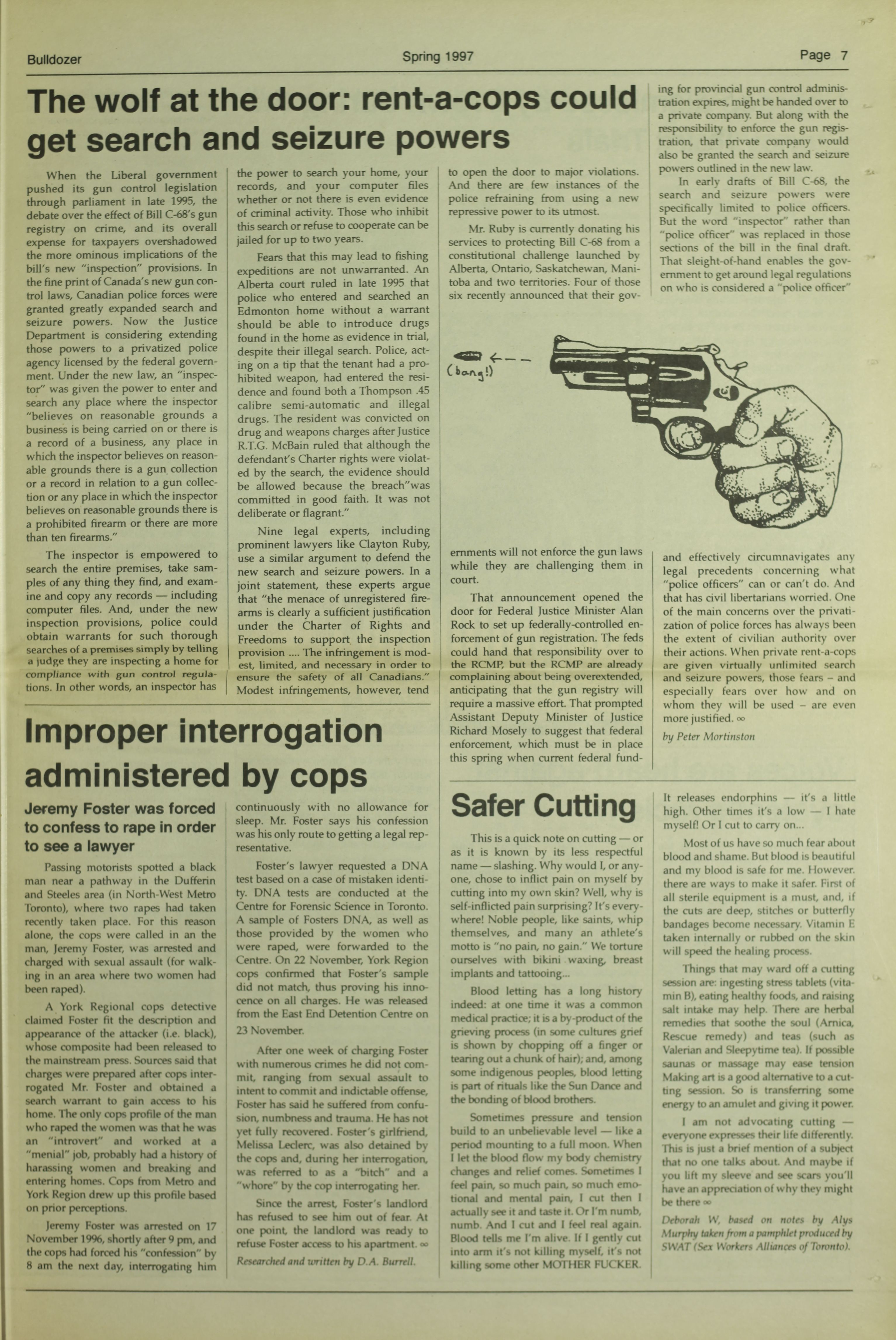 An anarchist publication from Toronto made to support prisoners in various penal institutions. It began in 1980 and featured articles, letters, art, poetry etc. by prisoners and ex-prisoners. By Spring 1997 it had incorporated another journal called the Prison News Service and began to focus more on justice-related issues in Canada, namely: prisons, local jails, refugee detention centres, and First Nations self-determination. In this issue: "Real terrorists at Gustafsen Lake exposed"; "Introduction to the first issue"; "Bruce Clark under legal attack in B.C."; "Free Wolverine"; "Canadian women's prison system still around for 21st century"; "Millhaven riots"; "Statement by women prisoners at P4W"; "Bill 105 - out of the frying pan, into the fire"; "Remember Edmund Wai Hong Yu!"; "The wolf at the door: rent-a-cops could get search and seizure powers"; "Improper interrogation administered by cops"; "Safer cutting"; "Charges dismissed by Crown during the Stoney Point Trials"; "Voices are heard against systemic racism"; "Privatization: hellbound train"; "The contradictions of Commissions"; "The "Danger to the Public" law: a dangerous injustice"; "Together we shall overcome!"; "Nigerian refugee detained in Canada: appeal for help"; "Refugees in detention"; "Another face of neo-liberalism: drug trafficking and commercial banks"; "All too familiar: sexual exploitation in U.S. women's prisons"; "Seaton House no refuge for the homeless"; "Call for action on the youth corrections system"; "Peltier update"; "Staying active on the outside: an interview with Dacajewiah"; "Starvation and torture in Joyceville"; "Norma Jean Croy is free!!"; "Project Another Chance"; "Another Waco? Or First nations revolution? The situation at Big Mountain"; "Collins Bay - not all mediums are created"; "MRTA action to free political prisoners in Peru"; "Interview with Ramona Africa on International Women's Day"; "Update on Mumia Abu-Jamal - situation urgent!!"; "Racism vs. kkkolonialism"; [Book review of] The slammer: the crisis in Canada's prison system by Kevin Marron; Resources.