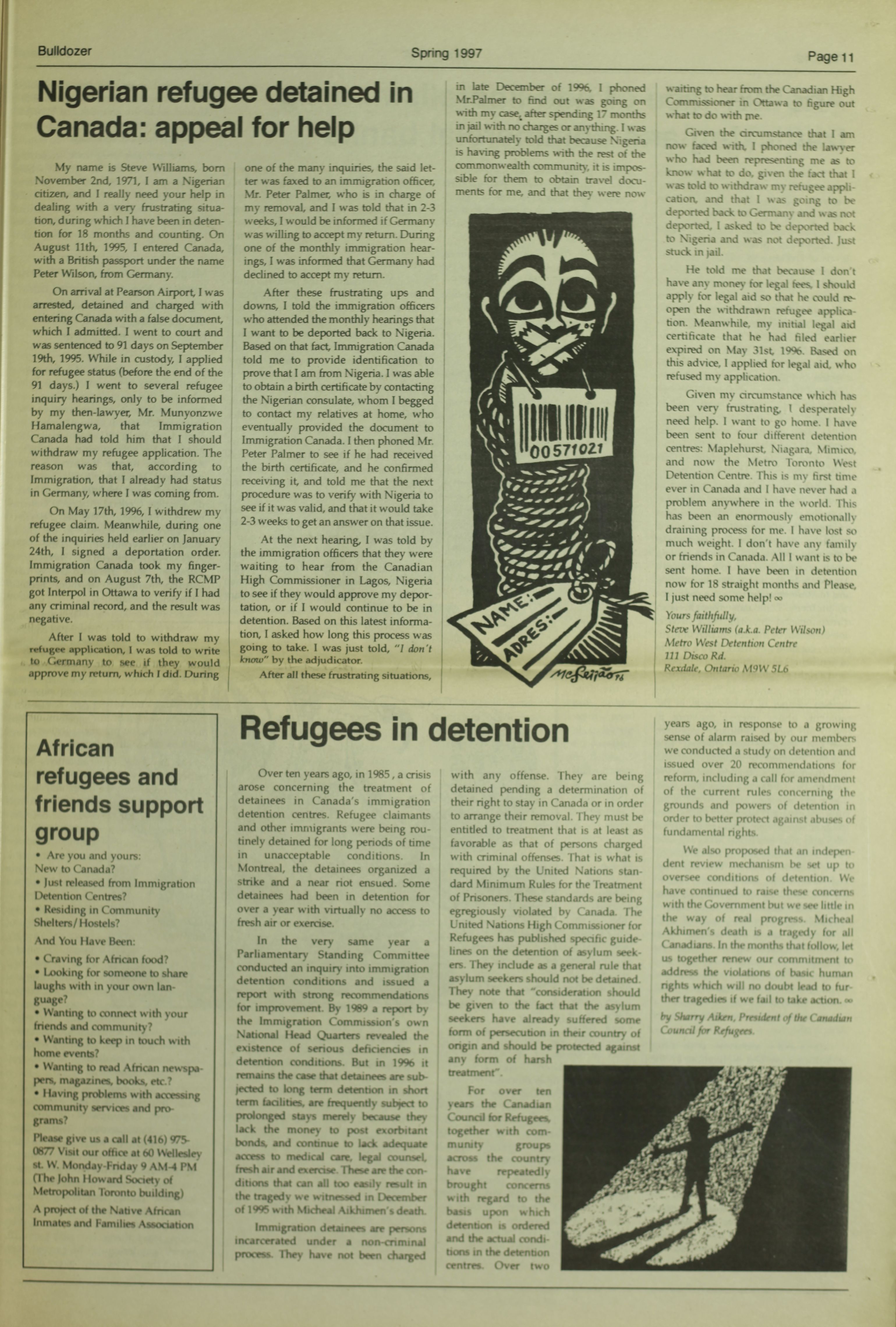 An anarchist publication from Toronto made to support prisoners in various penal institutions. It began in 1980 and featured articles, letters, art, poetry etc. by prisoners and ex-prisoners. By Spring 1997 it had incorporated another journal called the Prison News Service and began to focus more on justice-related issues in Canada, namely: prisons, local jails, refugee detention centres, and First Nations self-determination. In this issue: "Real terrorists at Gustafsen Lake exposed"; "Introduction to the first issue"; "Bruce Clark under legal attack in B.C."; "Free Wolverine"; "Canadian women's prison system still around for 21st century"; "Millhaven riots"; "Statement by women prisoners at P4W"; "Bill 105 - out of the frying pan, into the fire"; "Remember Edmund Wai Hong Yu!"; "The wolf at the door: rent-a-cops could get search and seizure powers"; "Improper interrogation administered by cops"; "Safer cutting"; "Charges dismissed by Crown during the Stoney Point Trials"; "Voices are heard against systemic racism"; "Privatization: hellbound train"; "The contradictions of Commissions"; "The "Danger to the Public" law: a dangerous injustice"; "Together we shall overcome!"; "Nigerian refugee detained in Canada: appeal for help"; "Refugees in detention"; "Another face of neo-liberalism: drug trafficking and commercial banks"; "All too familiar: sexual exploitation in U.S. women's prisons"; "Seaton House no refuge for the homeless"; "Call for action on the youth corrections system"; "Peltier update"; "Staying active on the outside: an interview with Dacajewiah"; "Starvation and torture in Joyceville"; "Norma Jean Croy is free!!"; "Project Another Chance"; "Another Waco? Or First nations revolution? The situation at Big Mountain"; "Collins Bay - not all mediums are created"; "MRTA action to free political prisoners in Peru"; "Interview with Ramona Africa on International Women's Day"; "Update on Mumia Abu-Jamal - situation urgent!!"; "Racism vs. kkkolonialism"; [Book review of] The slammer: the crisis in Canada's prison system by Kevin Marron; Resources.