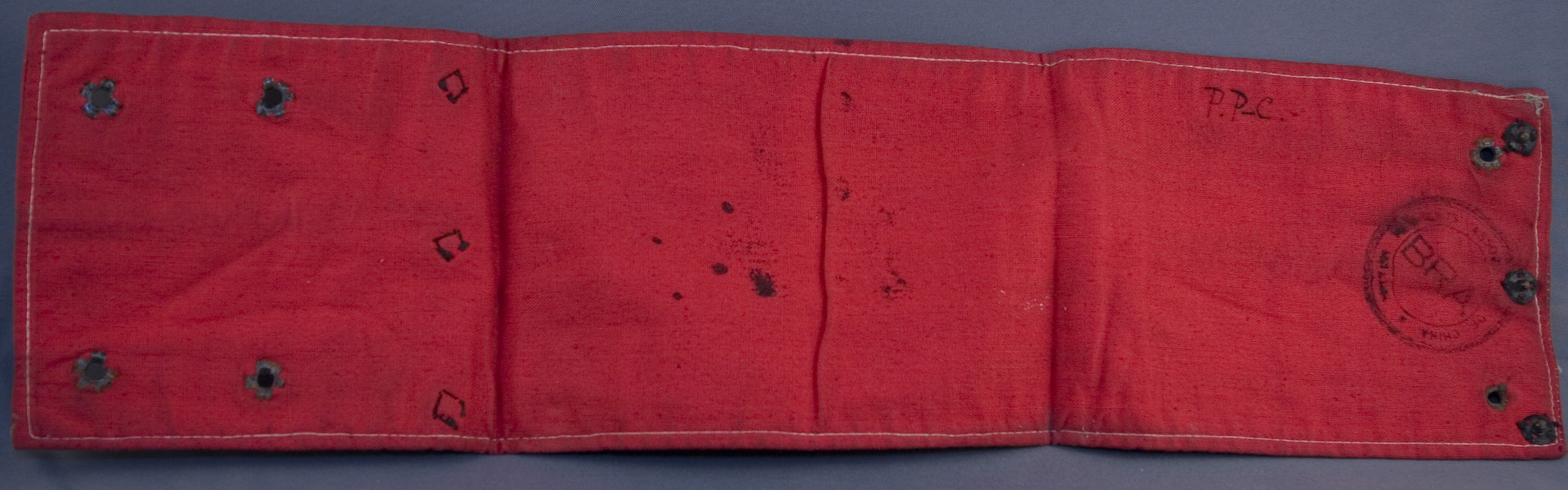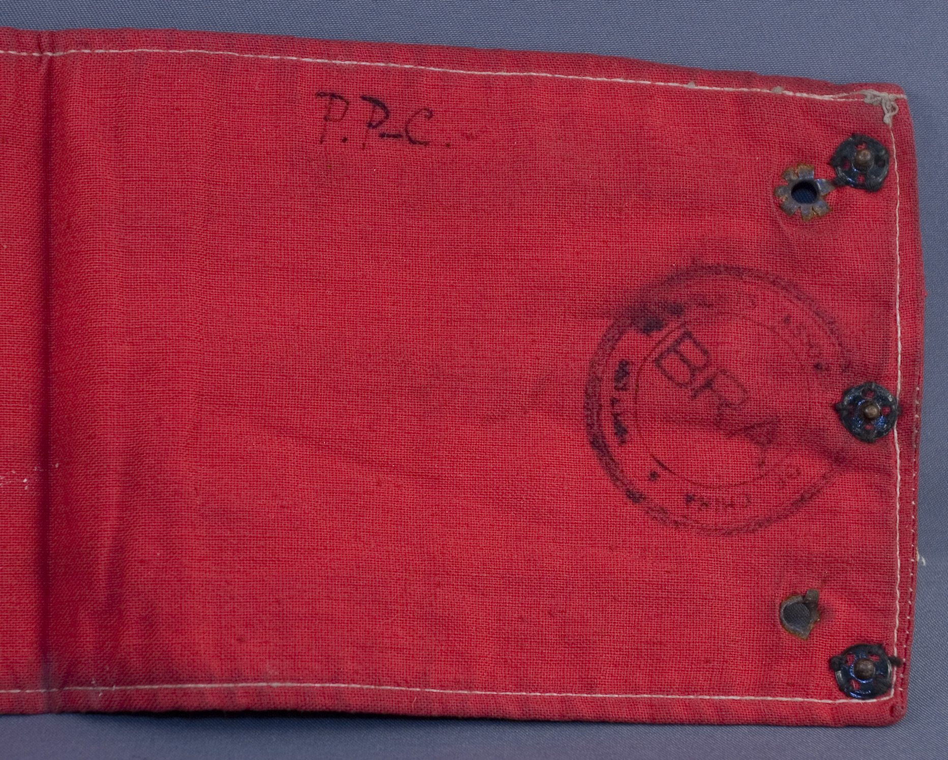 A red cotton armband numbered B2268 which was used by Peggy Pemberton Carter. 'BRA British Residents Association of China' is stamped inside the armband indicating that it was issued by BRA on behalf of the Japanese, during World War Two. Peggy's initials "P. P-C" are handwritten inside the armband.