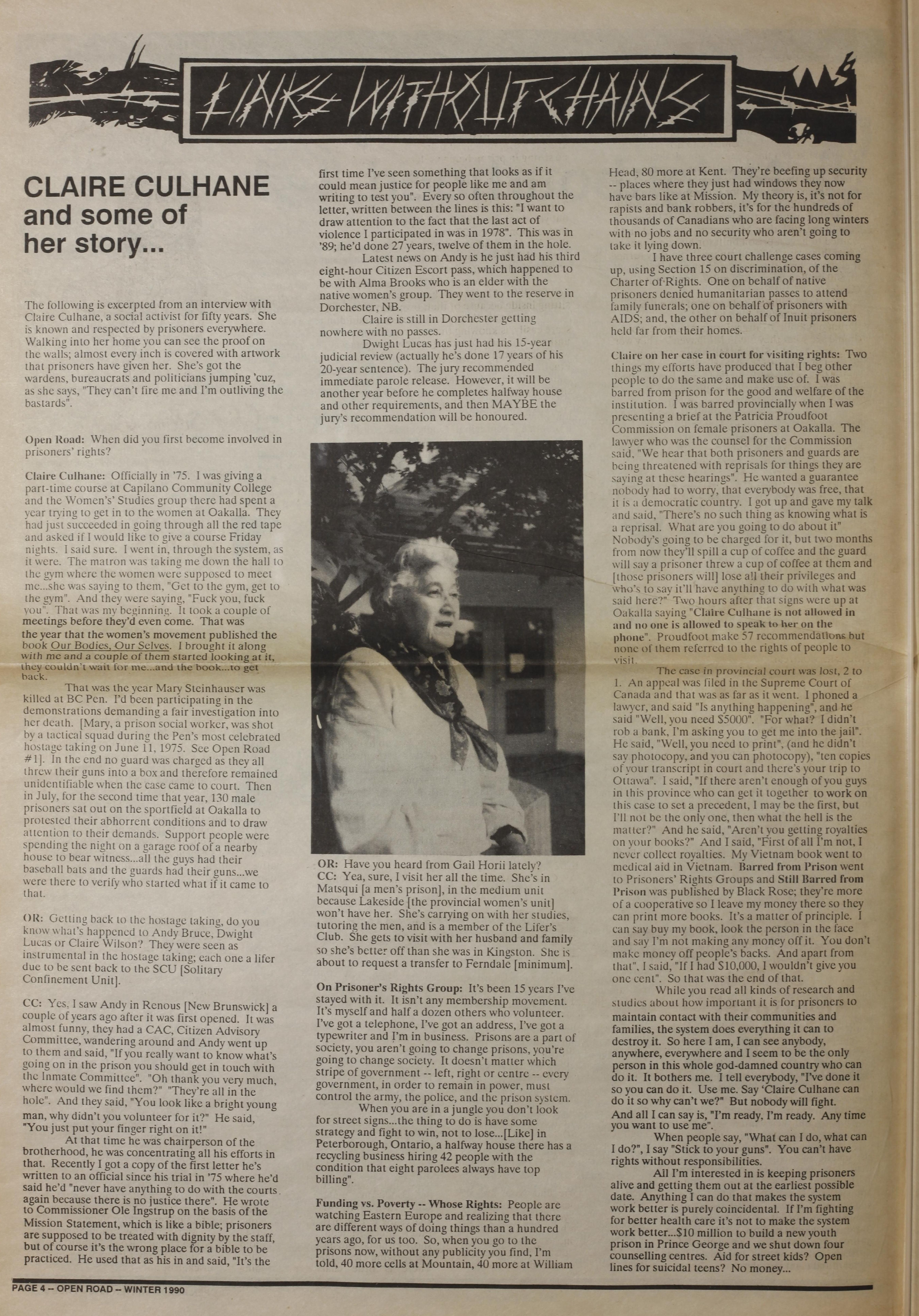 In this issue: "Once more, the five"; Bonanno & Stasi"; "Innu beat the rap"; "Statement to the International Tribunal on Political Prisoners and Pows". First People. "Indigenous rights" by James Nyugh. Community Action. "How green is my neighbourhood" by Spud Durutti. Links without chains. "Clair Culhane and some of her story..."; "Doing solitary in Brazil"; "In honour of Chief Sitting Bull"; "Free the Murrays!". "Beyond feminism: anarchism & human freedom" by L. Susan Brown. [Centre section on housing]. "Meanwhile in Poland" by Sarah Orlowski. "Theatre of the absurd" by Bob Graham. "Rock & Roll & Resistance". Book Reviews. On the Road. Letters.
