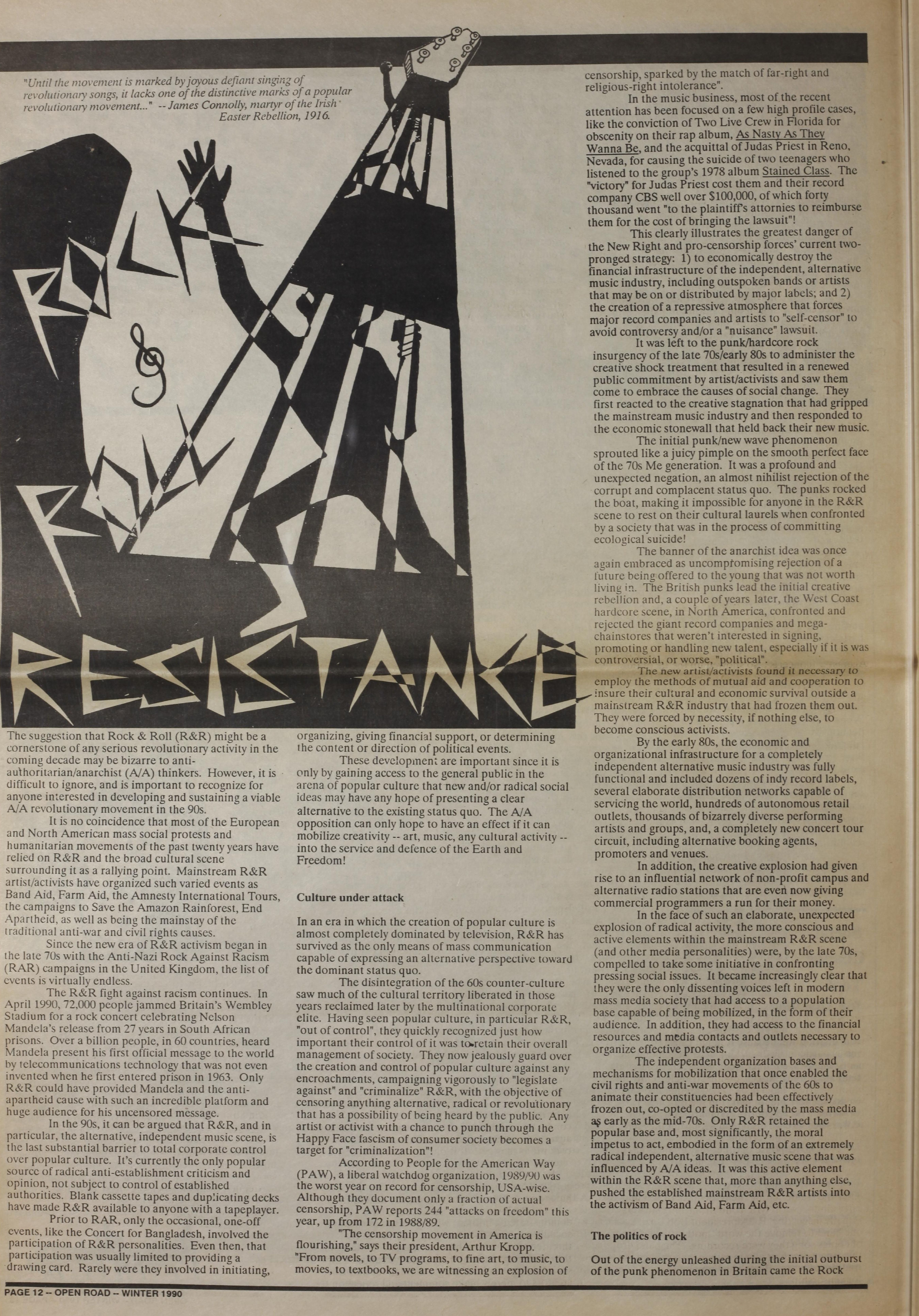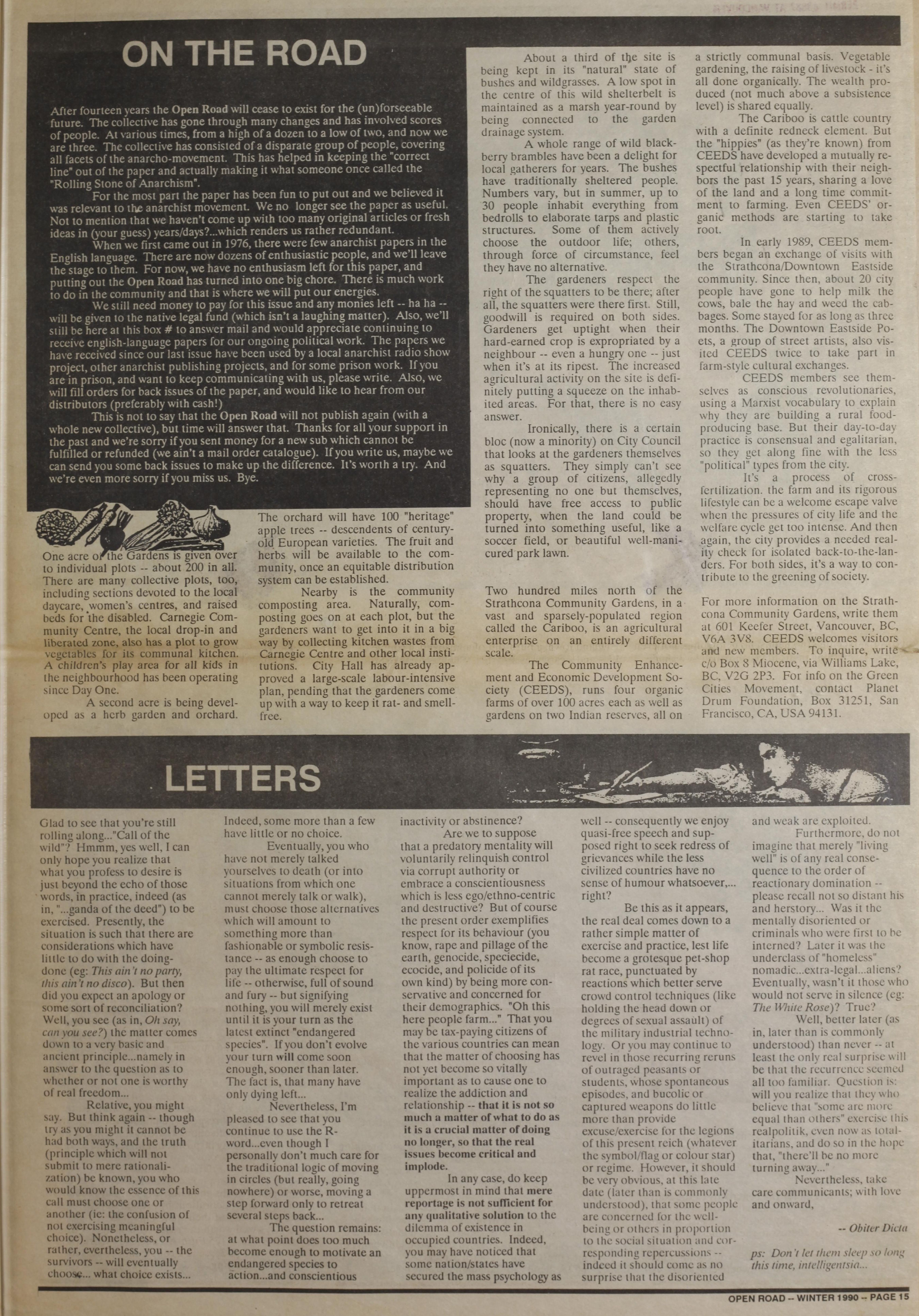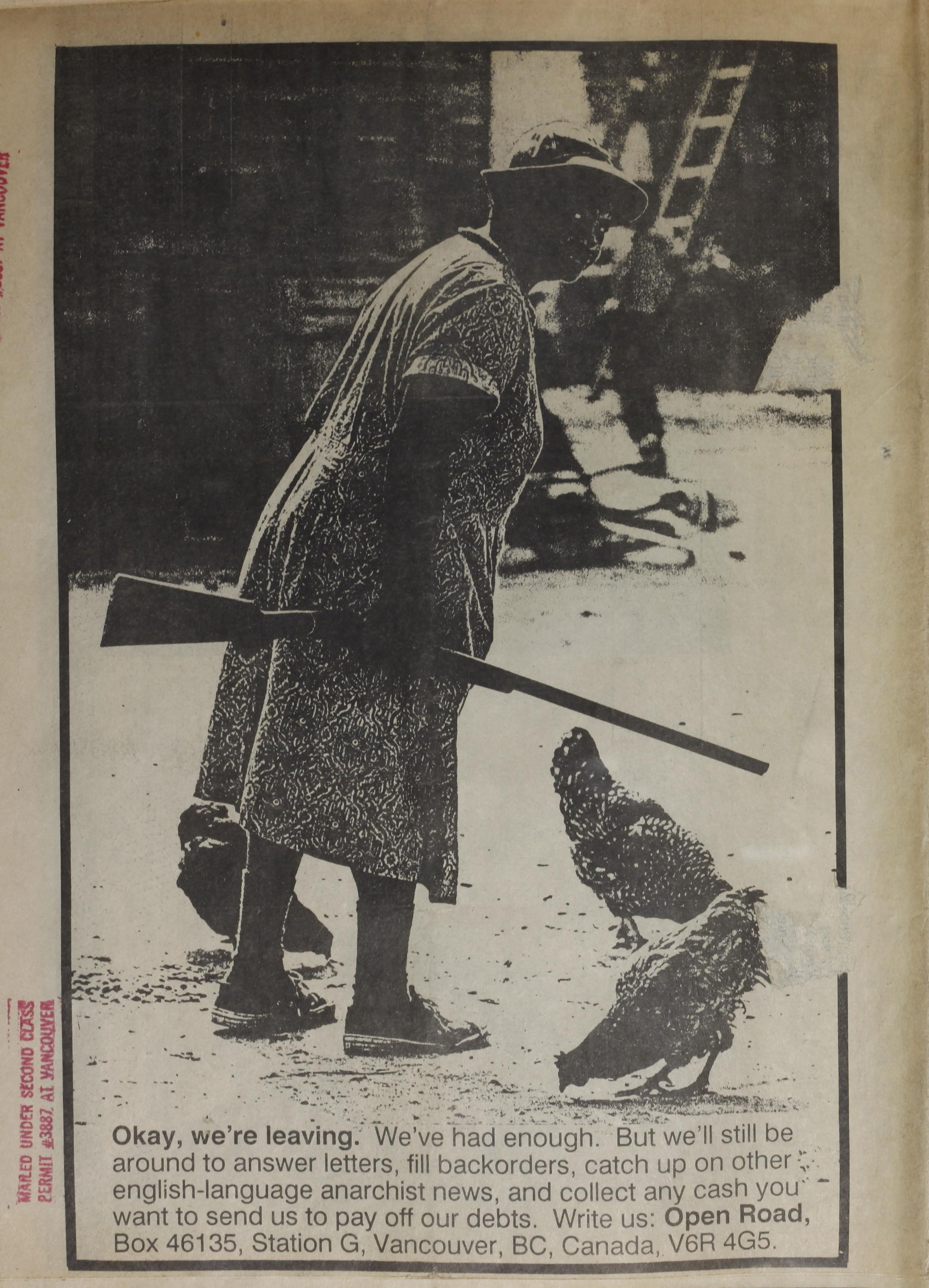 An anarchist publication produced in Vancouver, British Columbia focused on the international spectrum of anarchist and anti-authoritarian activities around popular struggles and social problems. This is the last issue, "after fourteen years the Open road will cease to exist for the (un)forseeable future. The collective has gone through many changes and has involved scores of people. At various times, from a high of a dozen to a low of two, and now we are three. The collective has consisted of a disparate group of people, covering all facets of the anarcho-movement. This has helped in keeping the correct line out of the paper and actually making it what someone once called the 'Rolling Stone of Anarchism".