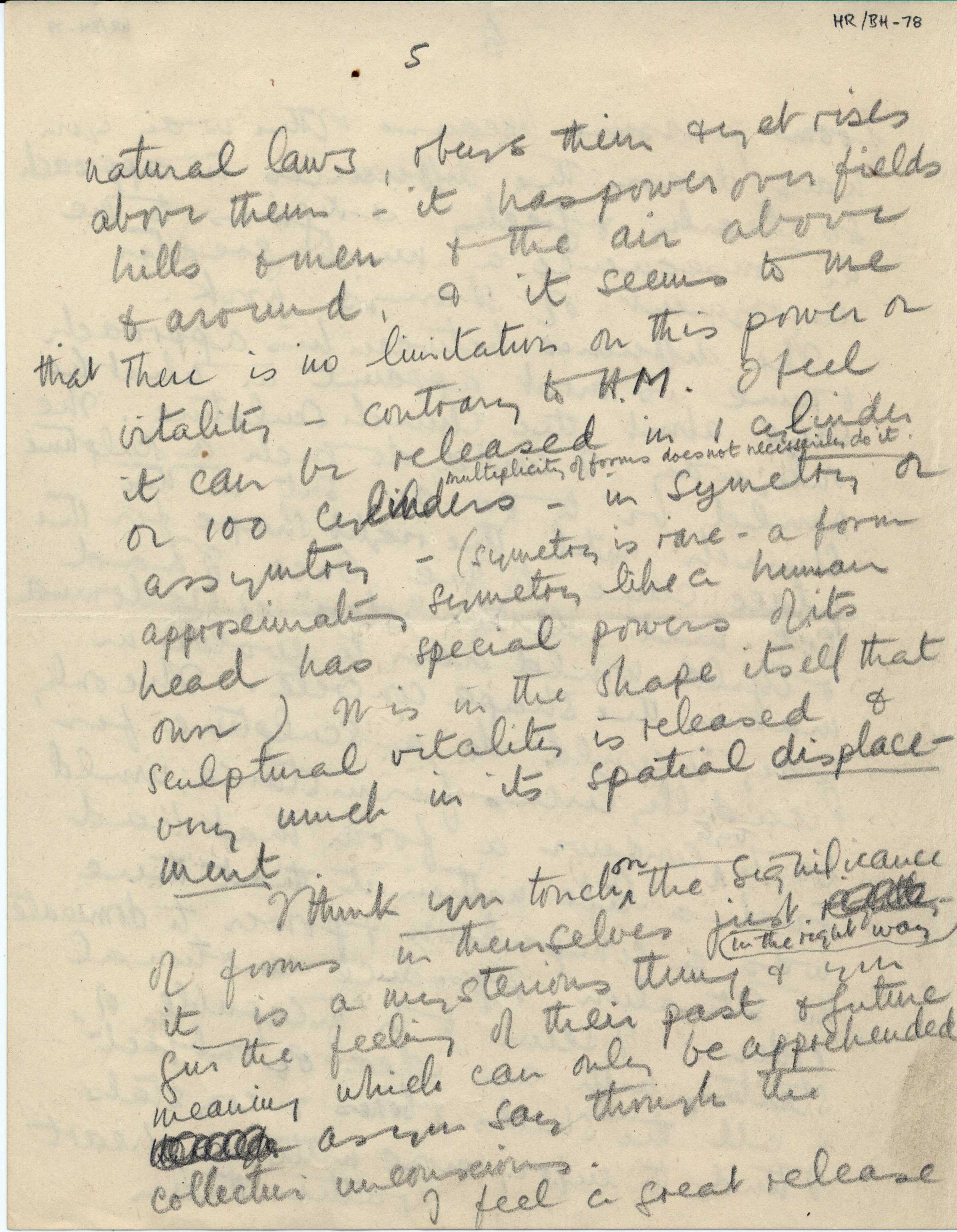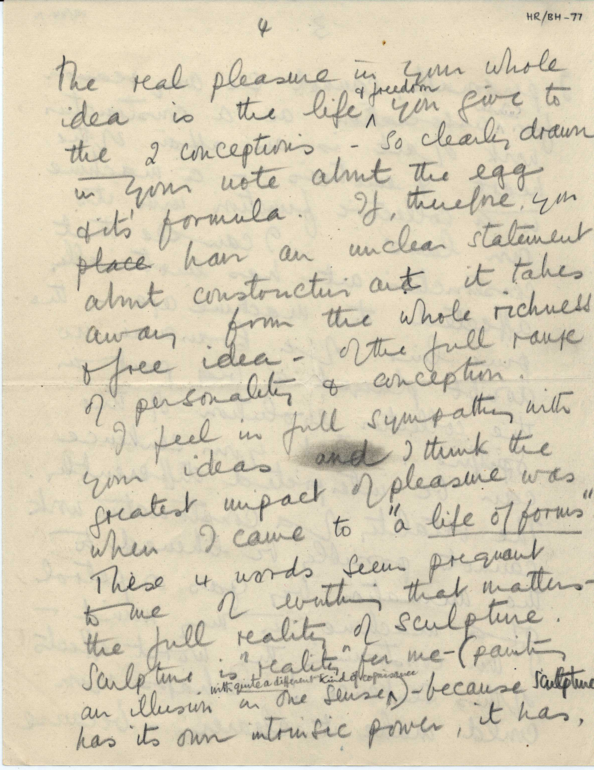 Part of a collection of letters to Sir Herbert Read from Dame Barbara Hepworth (English artist and sculptor and, along with Read, a member of the modern art movement Unit One founded by Paul Nash), that span the time period of 1940 to 1965 and discuss their artistic and literary endeavors, philosophical and political views, and personal lives. Hepworth compares Read's comments on constructive art and the machine and uses sculpture for her examples.