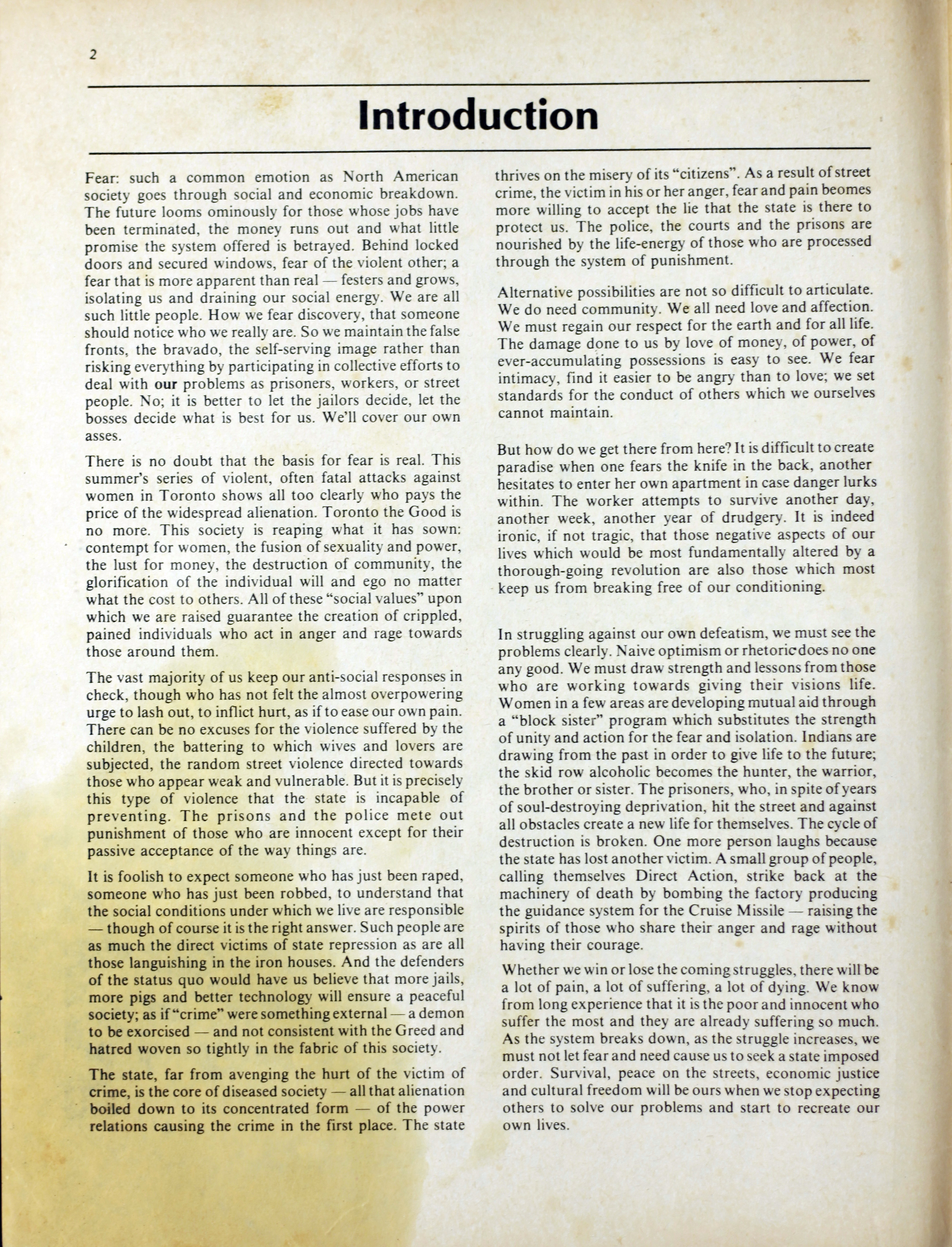 An anarchist publication from Toronto made to support prisoners in various penal institutions. It began in 1980 and featured articles, letters, art, poetry etc. by prisoners and ex-prisoners. By Spring 1997 it had incorporated another journal called the Prison News Service and began to focus more on justice-related issues in Canada, namely: prisons, local jails, refugee detention centres, and First Nations self-determination. In this issue: "Introduction"; "Ode to an ex-con's wife" [poem] by Pep Murray; "Money"; "Bruising the cruise"; "Apologies but few regrets"; "April is the cruellest time"; "Just-us in the heart of America - the trial of Mumia-Abu Jamal"; "Jamal's statement"; "Archimbault agony"; "Tempered by torment"; "Is there life after prison?"; "Domestic violence"; "The heart is strong"; "The great white hope"; "They got movin' on"; "Walla Walla intolerable"; ""Na-kaa-ch-wee-toa unaweep""; "Spirit in the iron houses"; "Who is Brownbear?"; "Gary Butler speaks"; "Thunder in the Papa Sapa"; "Reflections on my past"