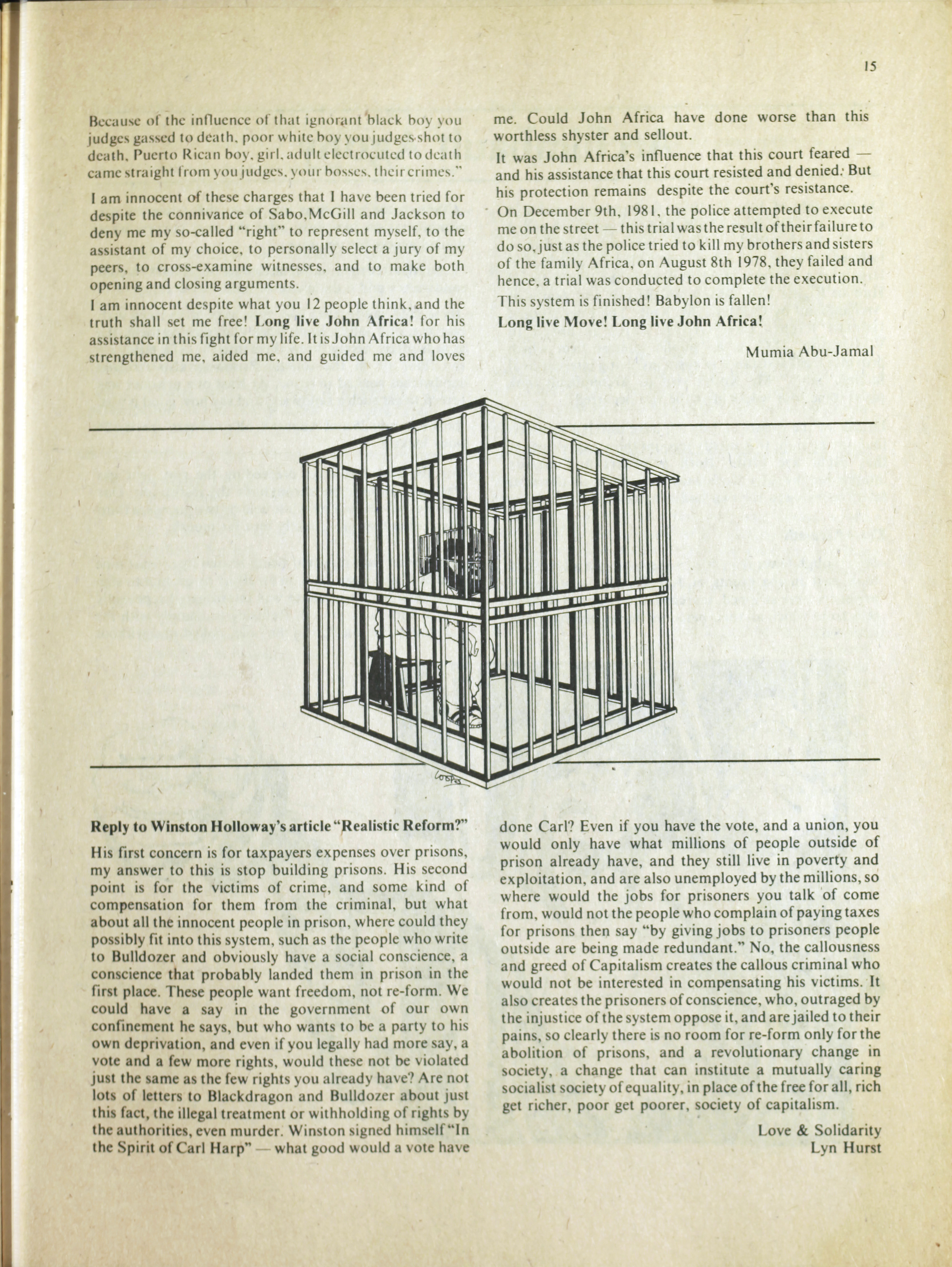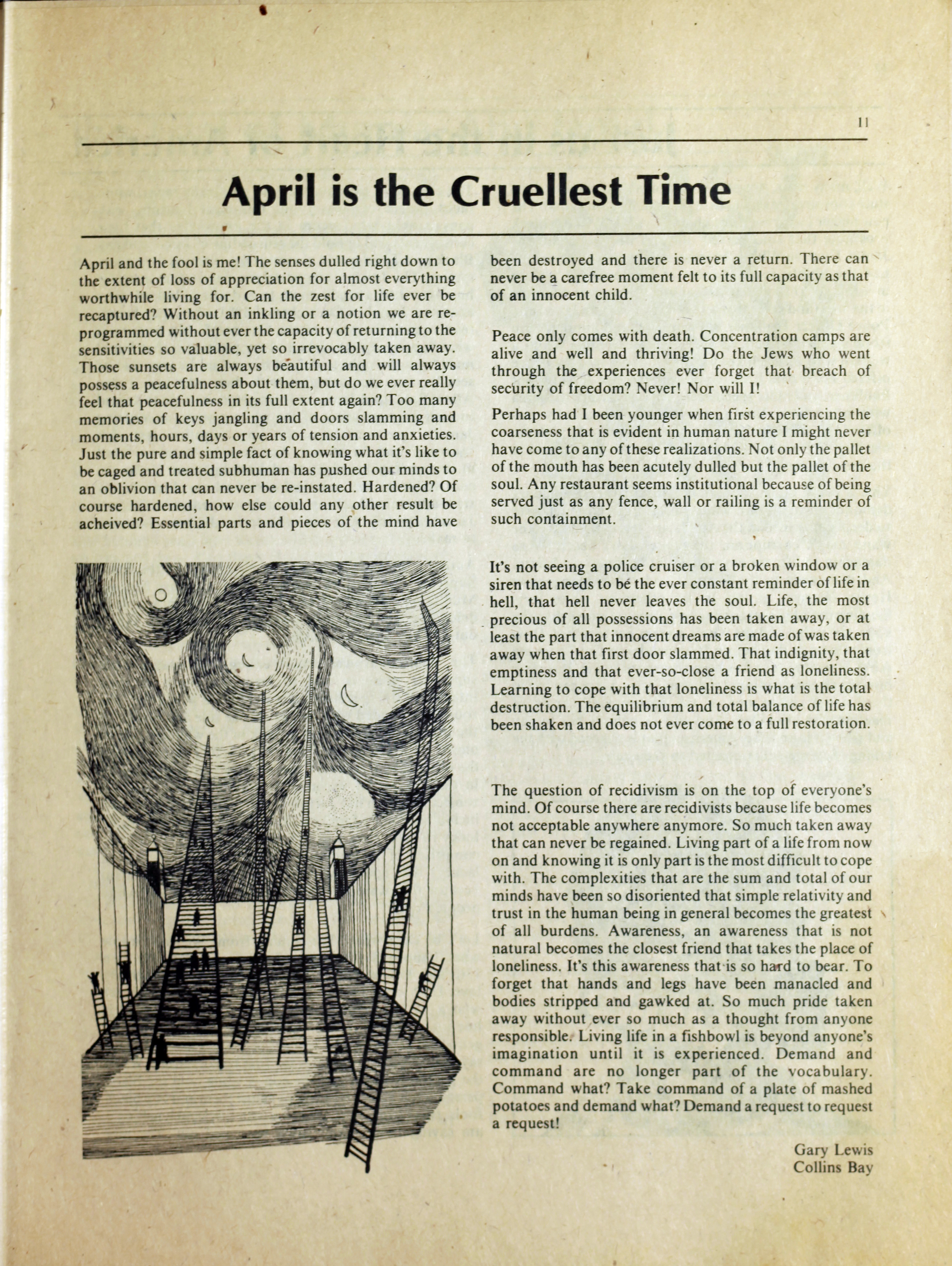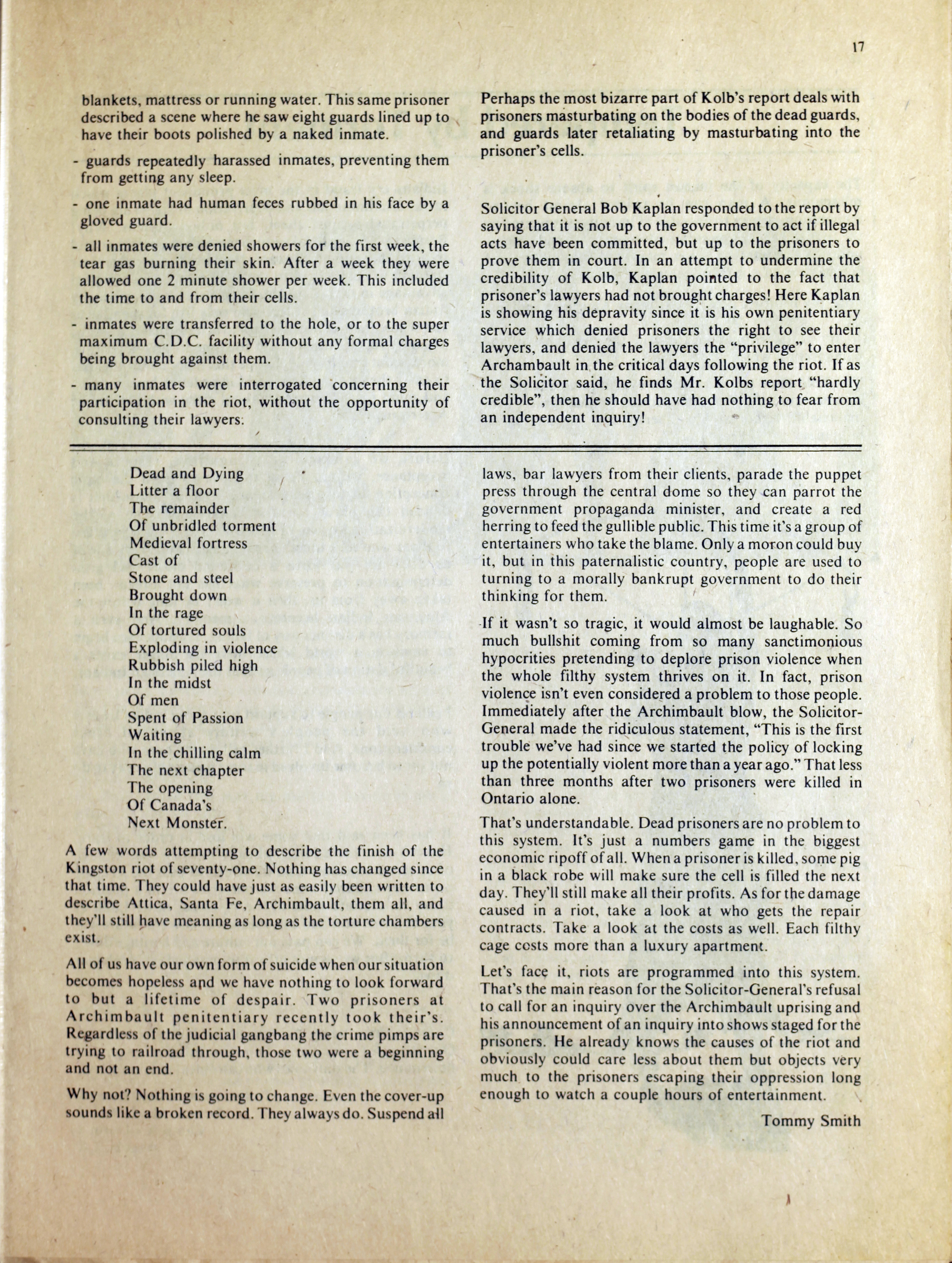 An anarchist publication from Toronto made to support prisoners in various penal institutions. It began in 1980 and featured articles, letters, art, poetry etc. by prisoners and ex-prisoners. By Spring 1997 it had incorporated another journal called the Prison News Service and began to focus more on justice-related issues in Canada, namely: prisons, local jails, refugee detention centres, and First Nations self-determination. In this issue: "Introduction"; "Ode to an ex-con's wife" [poem] by Pep Murray; "Money"; "Bruising the cruise"; "Apologies but few regrets"; "April is the cruellest time"; "Just-us in the heart of America - the trial of Mumia-Abu Jamal"; "Jamal's statement"; "Archimbault agony"; "Tempered by torment"; "Is there life after prison?"; "Domestic violence"; "The heart is strong"; "The great white hope"; "They got movin' on"; "Walla Walla intolerable"; ""Na-kaa-ch-wee-toa unaweep""; "Spirit in the iron houses"; "Who is Brownbear?"; "Gary Butler speaks"; "Thunder in the Papa Sapa"; "Reflections on my past"
