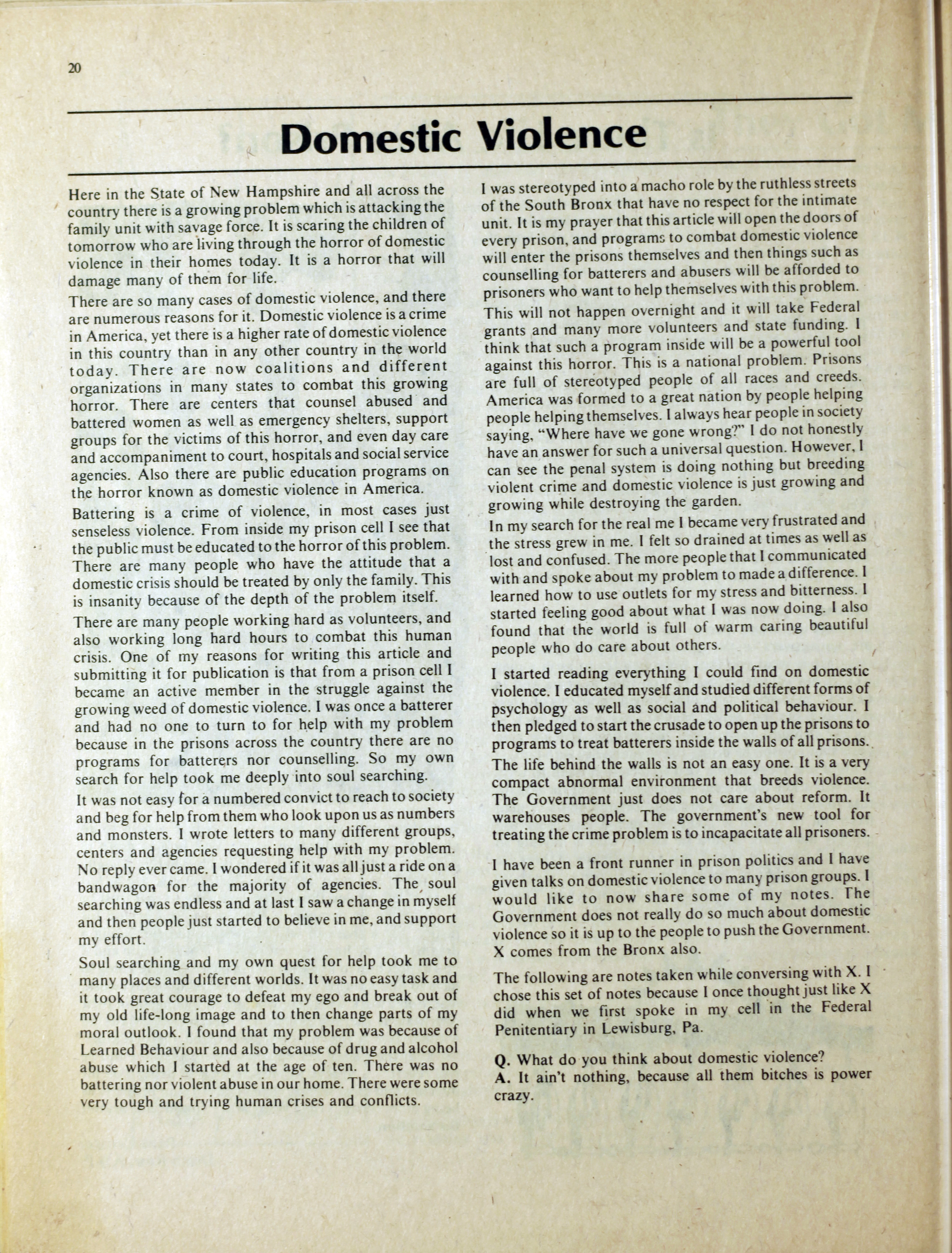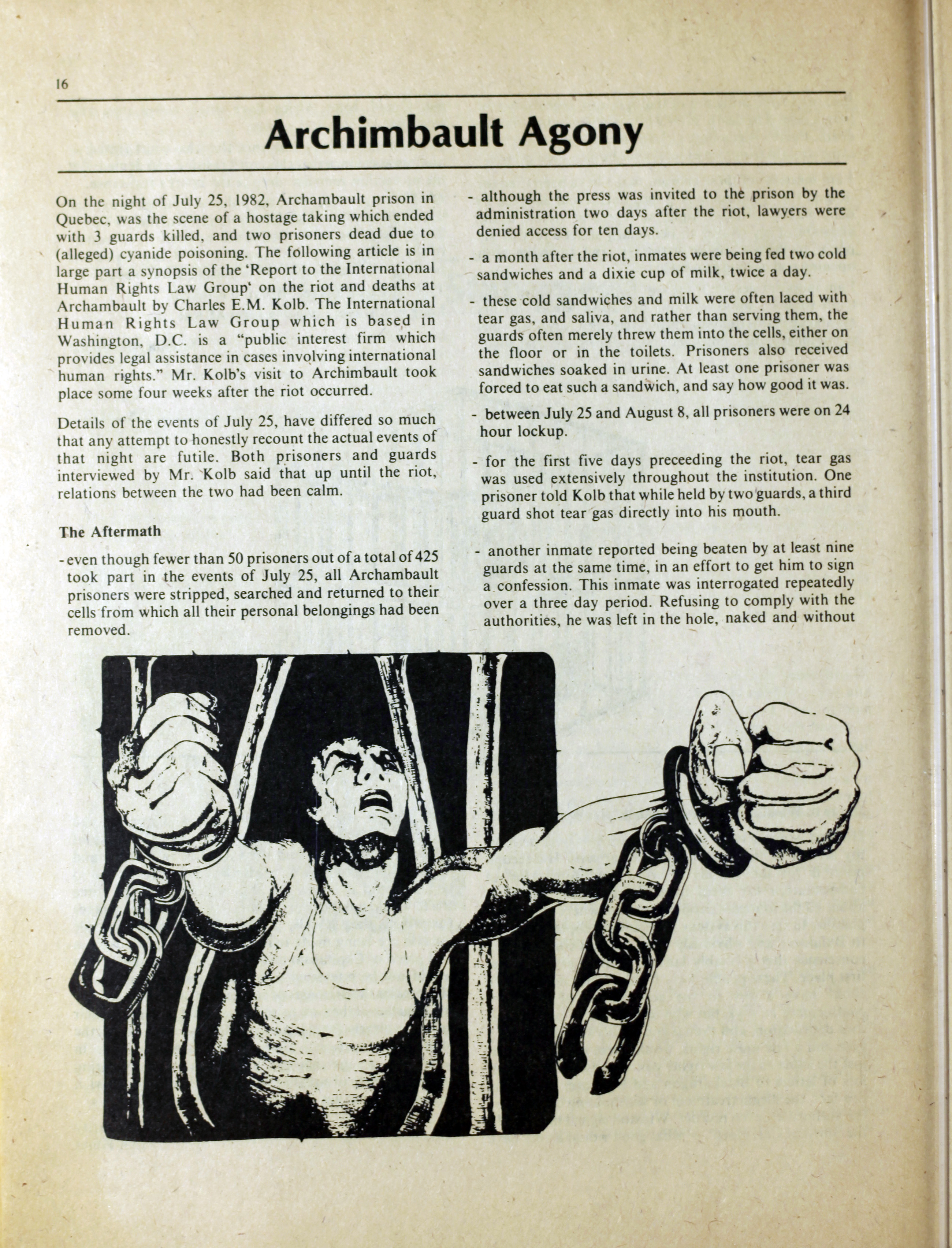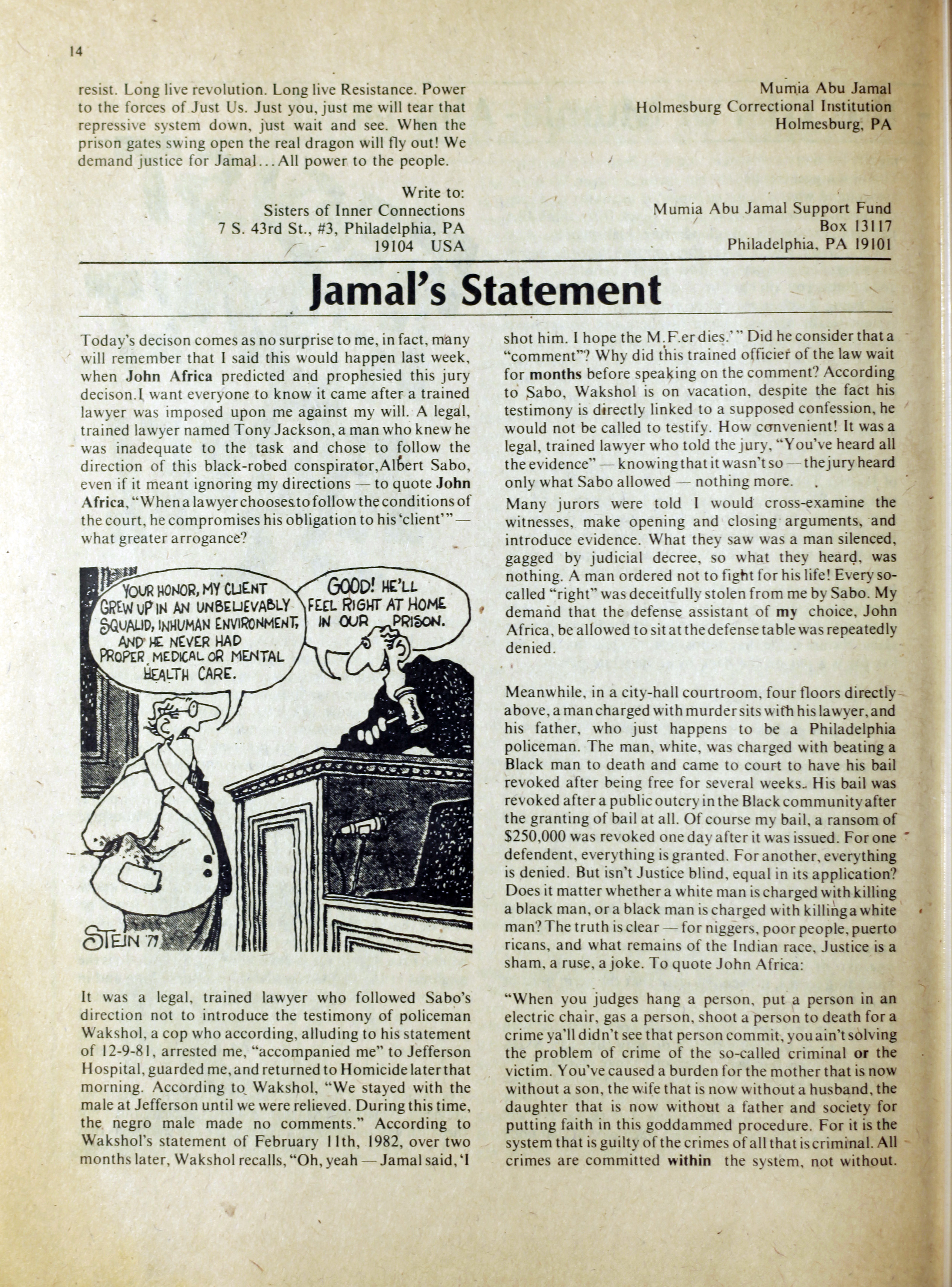 An anarchist publication from Toronto made to support prisoners in various penal institutions. It began in 1980 and featured articles, letters, art, poetry etc. by prisoners and ex-prisoners. By Spring 1997 it had incorporated another journal called the Prison News Service and began to focus more on justice-related issues in Canada, namely: prisons, local jails, refugee detention centres, and First Nations self-determination. In this issue: "Introduction"; "Ode to an ex-con's wife" [poem] by Pep Murray; "Money"; "Bruising the cruise"; "Apologies but few regrets"; "April is the cruellest time"; "Just-us in the heart of America - the trial of Mumia-Abu Jamal"; "Jamal's statement"; "Archimbault agony"; "Tempered by torment"; "Is there life after prison?"; "Domestic violence"; "The heart is strong"; "The great white hope"; "They got movin' on"; "Walla Walla intolerable"; ""Na-kaa-ch-wee-toa unaweep""; "Spirit in the iron houses"; "Who is Brownbear?"; "Gary Butler speaks"; "Thunder in the Papa Sapa"; "Reflections on my past"