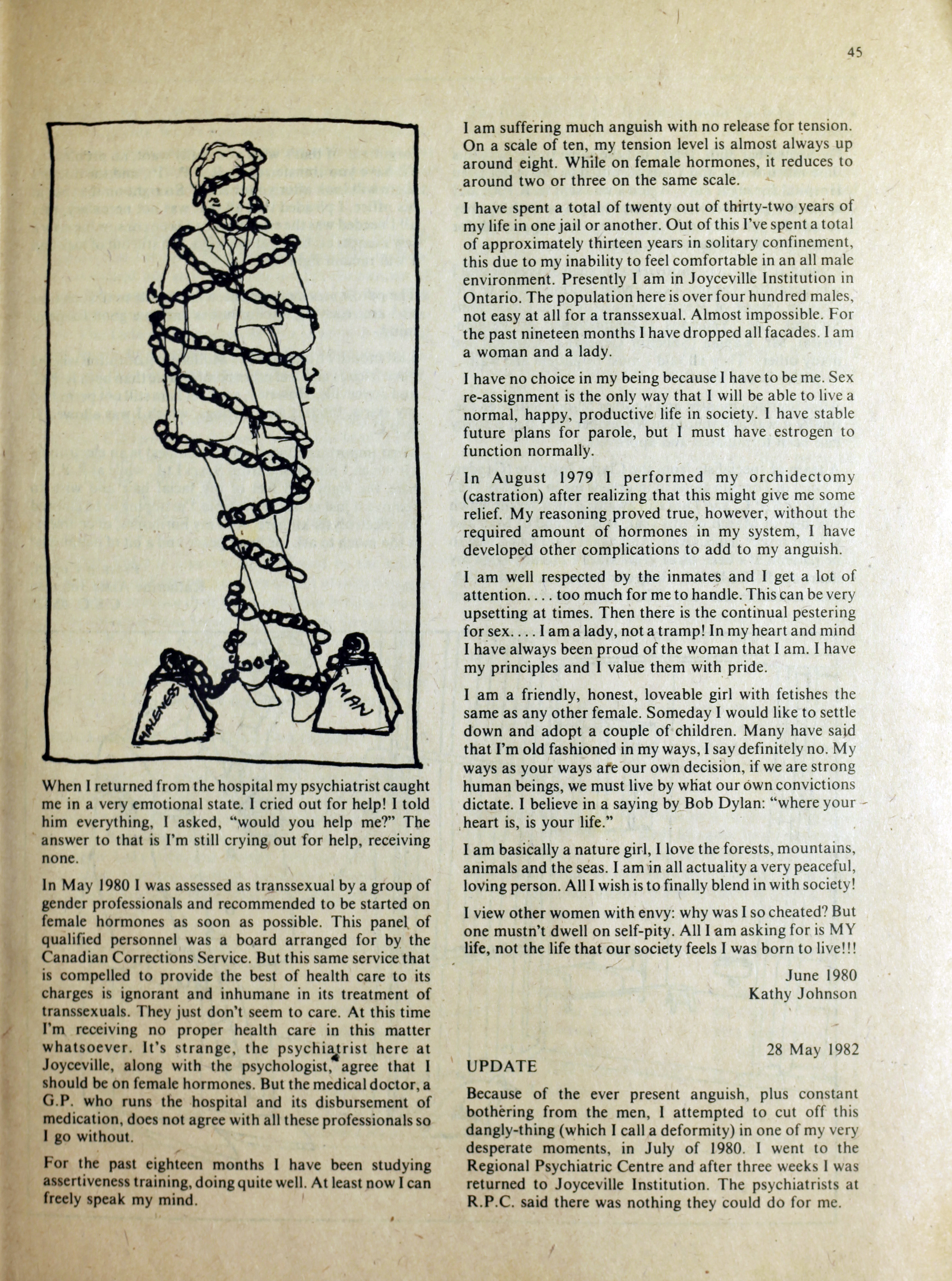 An anarchist publication from Toronto made to support prisoners in various penal institutions. It began in 1980 and featured articles, letters, art, poetry etc. by prisoners and ex-prisoners. By Spring 1997 it had incorporated another journal called the Prison News Service and began to focus more on justice-related issues in Canada, namely: prisons, local jails, refugee detention centres, and First Nations self-determination. In this issue: "Introduction"; "Ode to an ex-con's wife" [poem] by Pep Murray; "Money"; "Bruising the cruise"; "Apologies but few regrets"; "April is the cruellest time"; "Just-us in the heart of America - the trial of Mumia-Abu Jamal"; "Jamal's statement"; "Archimbault agony"; "Tempered by torment"; "Is there life after prison?"; "Domestic violence"; "The heart is strong"; "The great white hope"; "They got movin' on"; "Walla Walla intolerable"; ""Na-kaa-ch-wee-toa unaweep""; "Spirit in the iron houses"; "Who is Brownbear?"; "Gary Butler speaks"; "Thunder in the Papa Sapa"; "Reflections on my past"