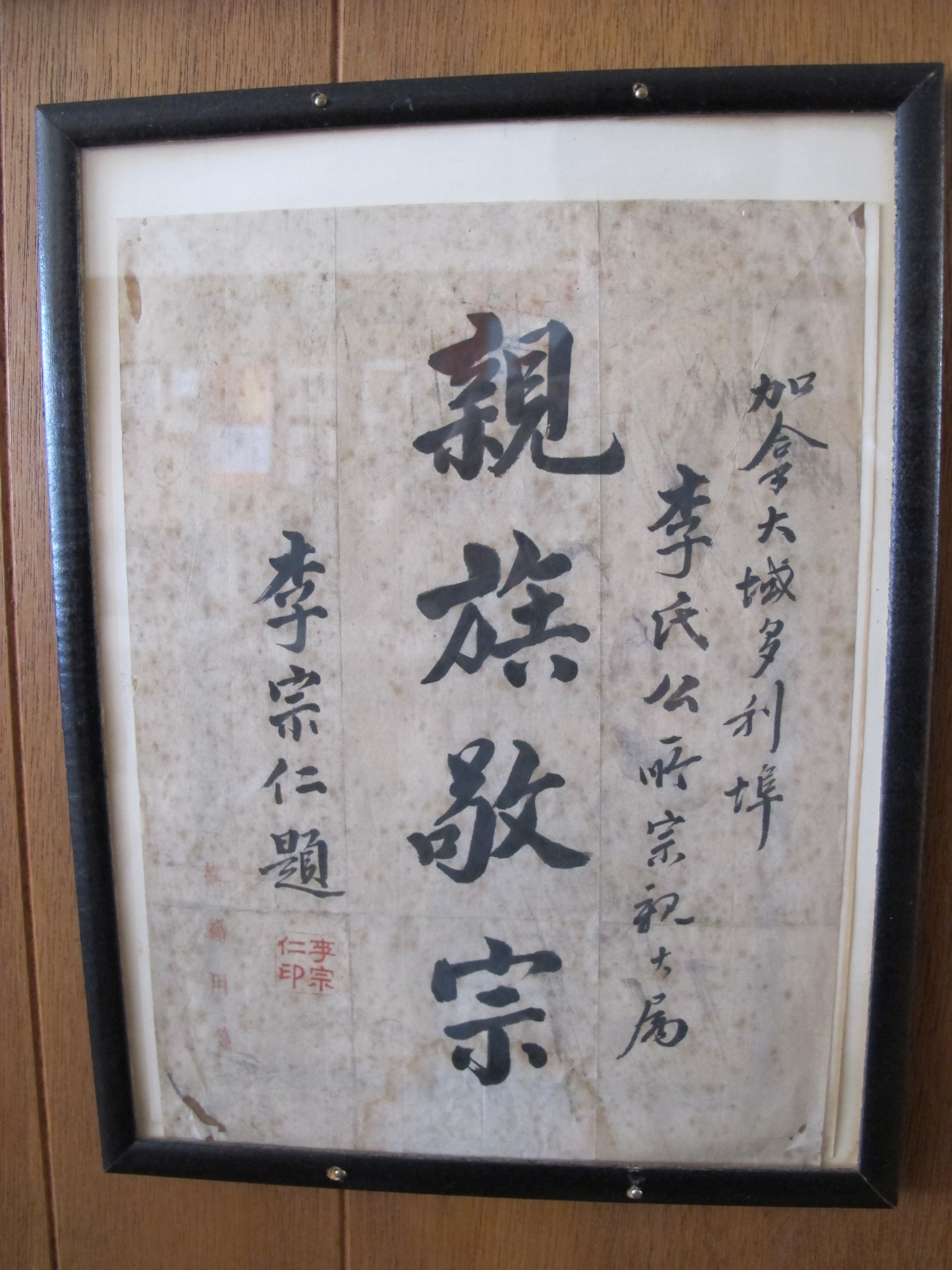 Framed calligraphy written by Li Zongren (who was the acting president of the Republic of China from 1949-1950). Hung on the wall inside the meeting hall of the Lee Association (614 Fisgard Street, Victoria, B.C.). Meaning "Befriend your fellow clansmen and respect your ancestry". Taken on June 11, 2011.