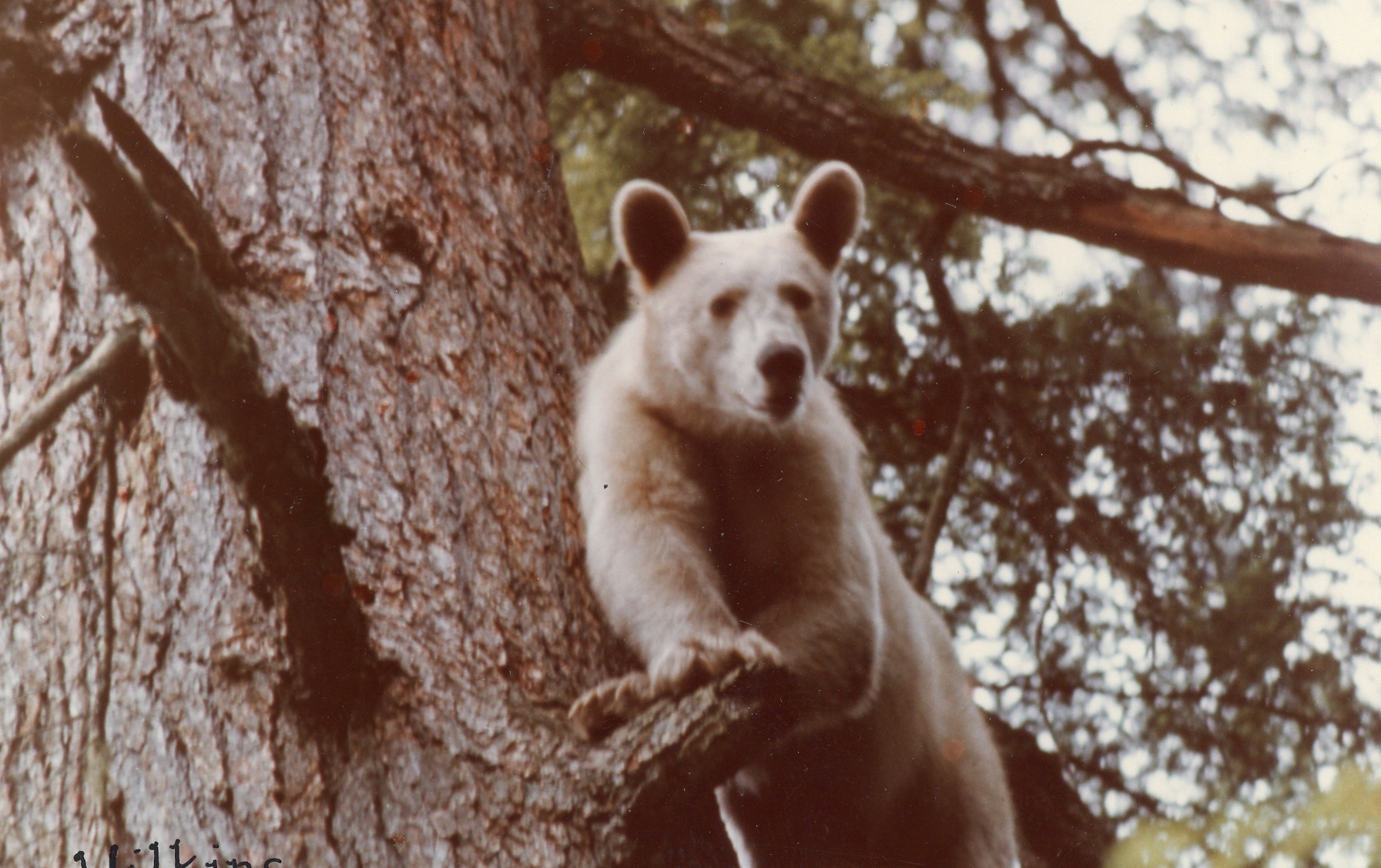 Looking up at a cream-coloured Kermode bear in a tree in Terrace.