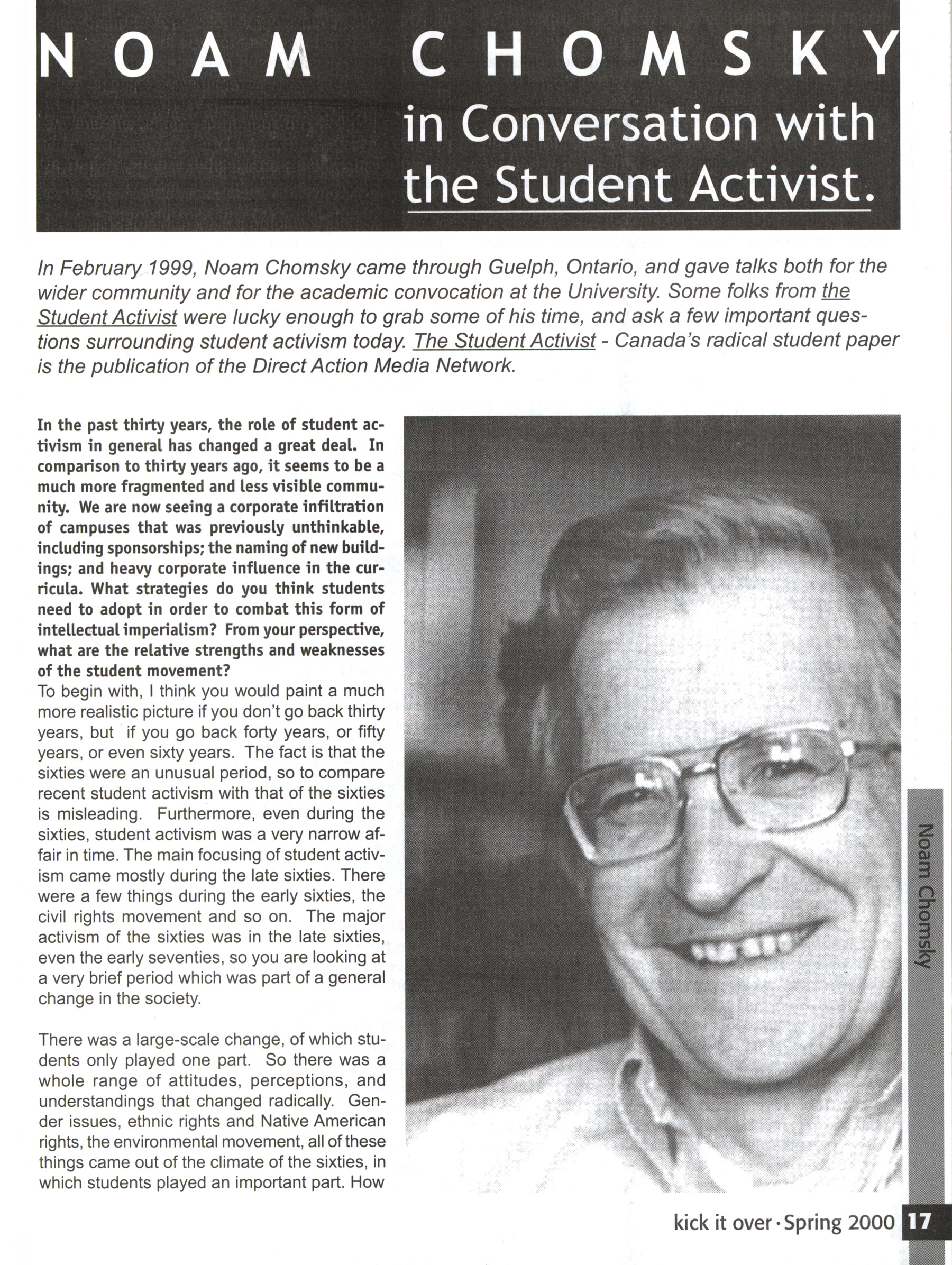 A social anarchist and anti-authoritarian quarterly publication. In this issue: Lorenzo Kom'Boa Ervin on black autonomy and revolution, Noam Chomsky on student activism, Caldwell First Nation, Nietzsche, anarchism and history, Vancouver Five, Reflections on Seattle, Council communism.
