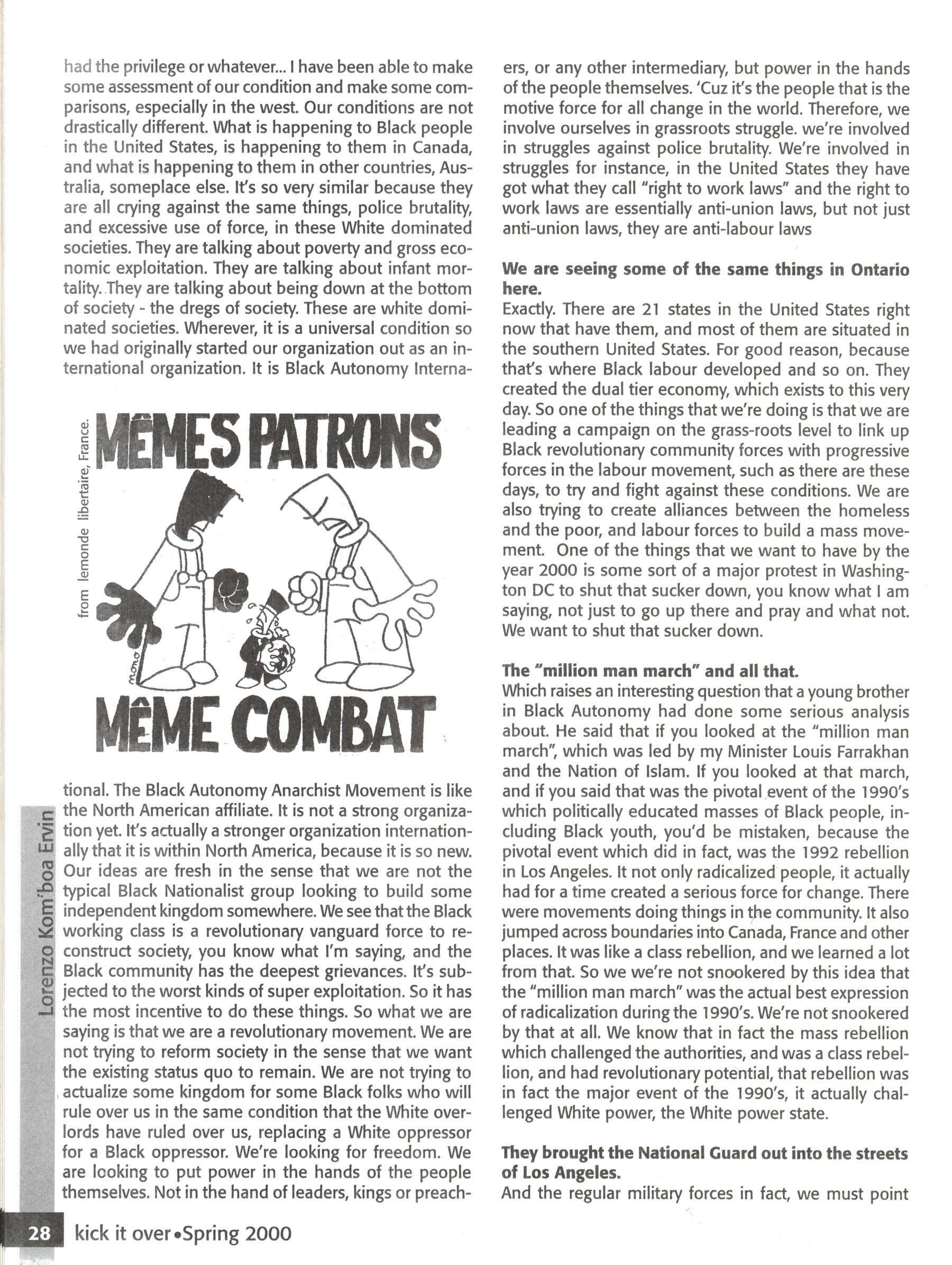 A social anarchist and anti-authoritarian quarterly publication. In this issue: Lorenzo Kom'Boa Ervin on black autonomy and revolution, Noam Chomsky on student activism, Caldwell First Nation, Nietzsche, anarchism and history, Vancouver Five, Reflections on Seattle, Council communism.