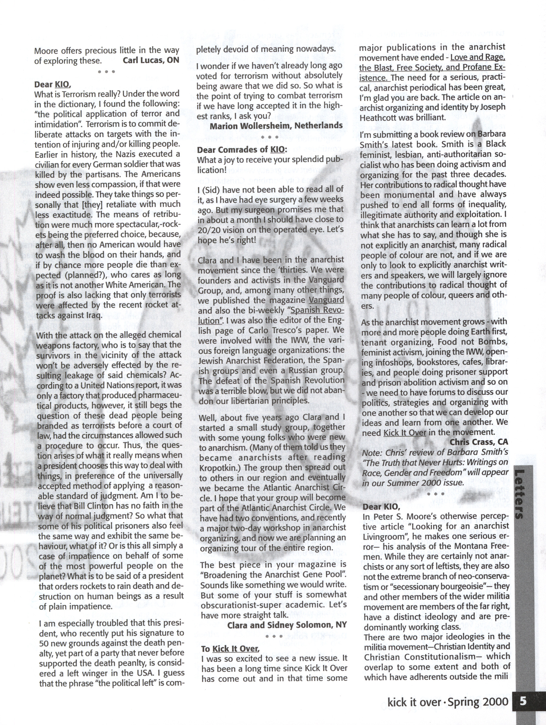 A social anarchist and anti-authoritarian quarterly publication. In this issue: Lorenzo Kom'Boa Ervin on black autonomy and revolution, Noam Chomsky on student activism, Caldwell First Nation, Nietzsche, anarchism and history, Vancouver Five, Reflections on Seattle, Council communism.