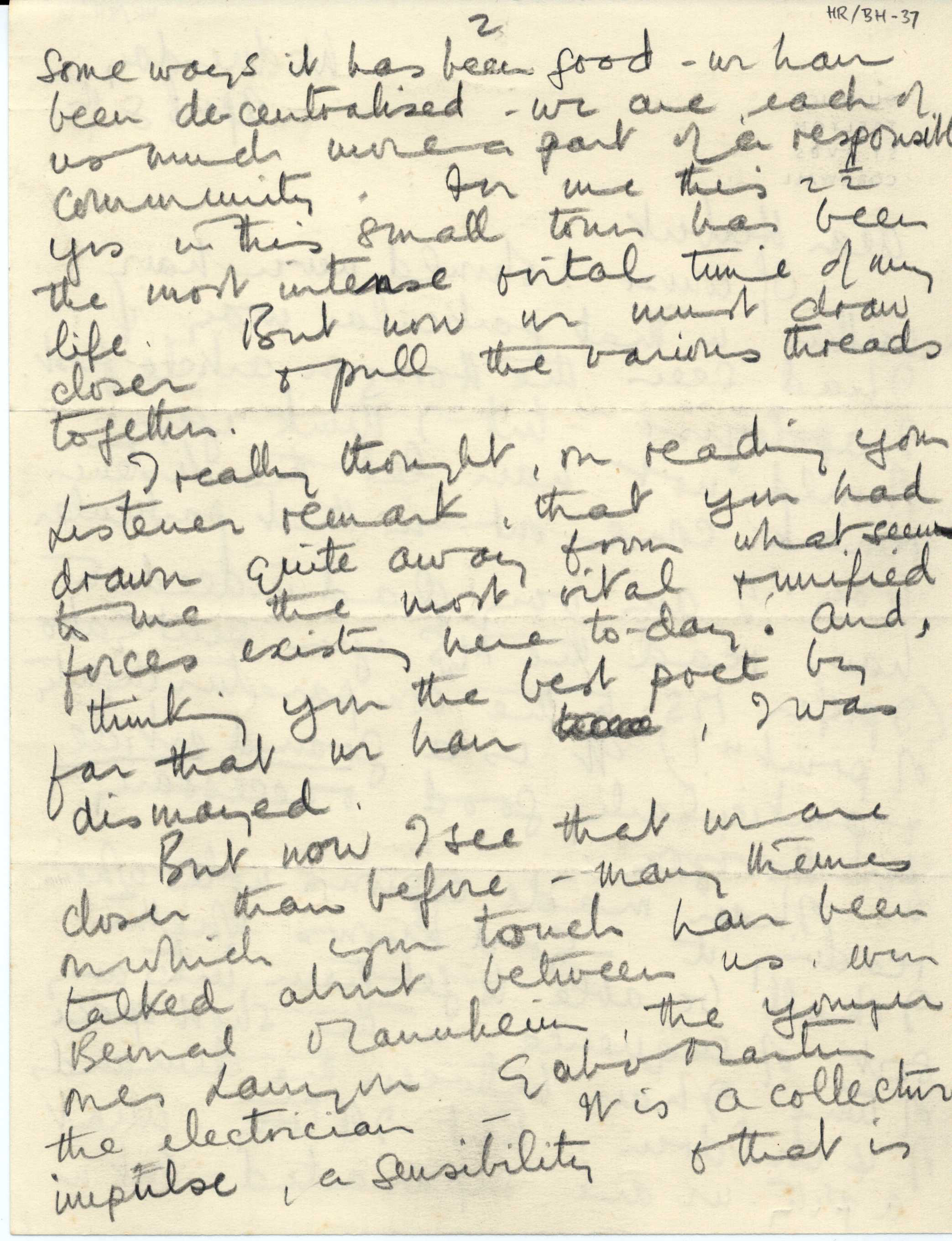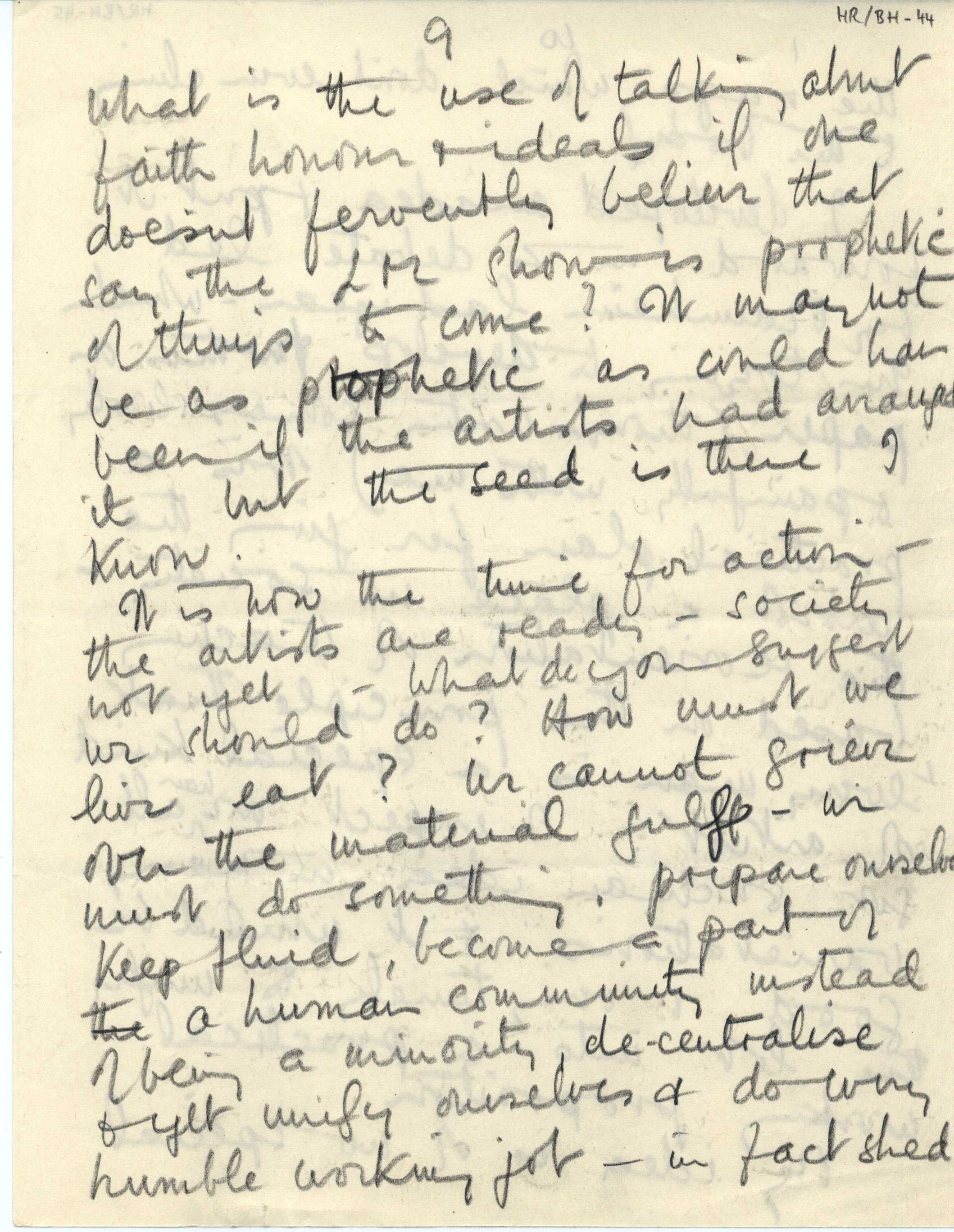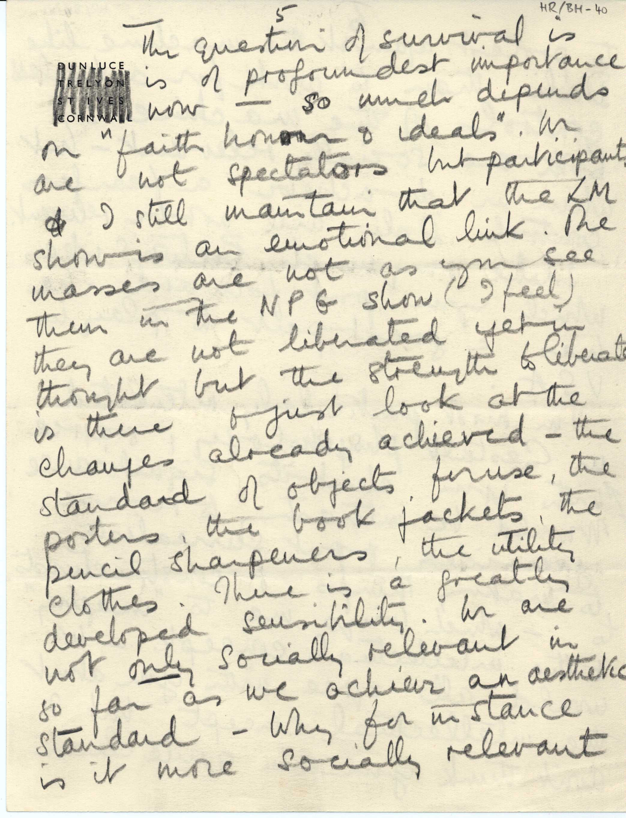 Part of a collection of letters to Sir Herbert Read from Dame Barbara Hepworth (English artist and sculptor and, along with Read, a member of the modern art movement Unit One founded by Paul Nash), that span the time period of 1940 to 1965 and discuss their artistic and literary endeavors, philosophical and political views, and personal lives. Hepworth comments on Read's article for Horizon: A Review of Literature and Art magazine.