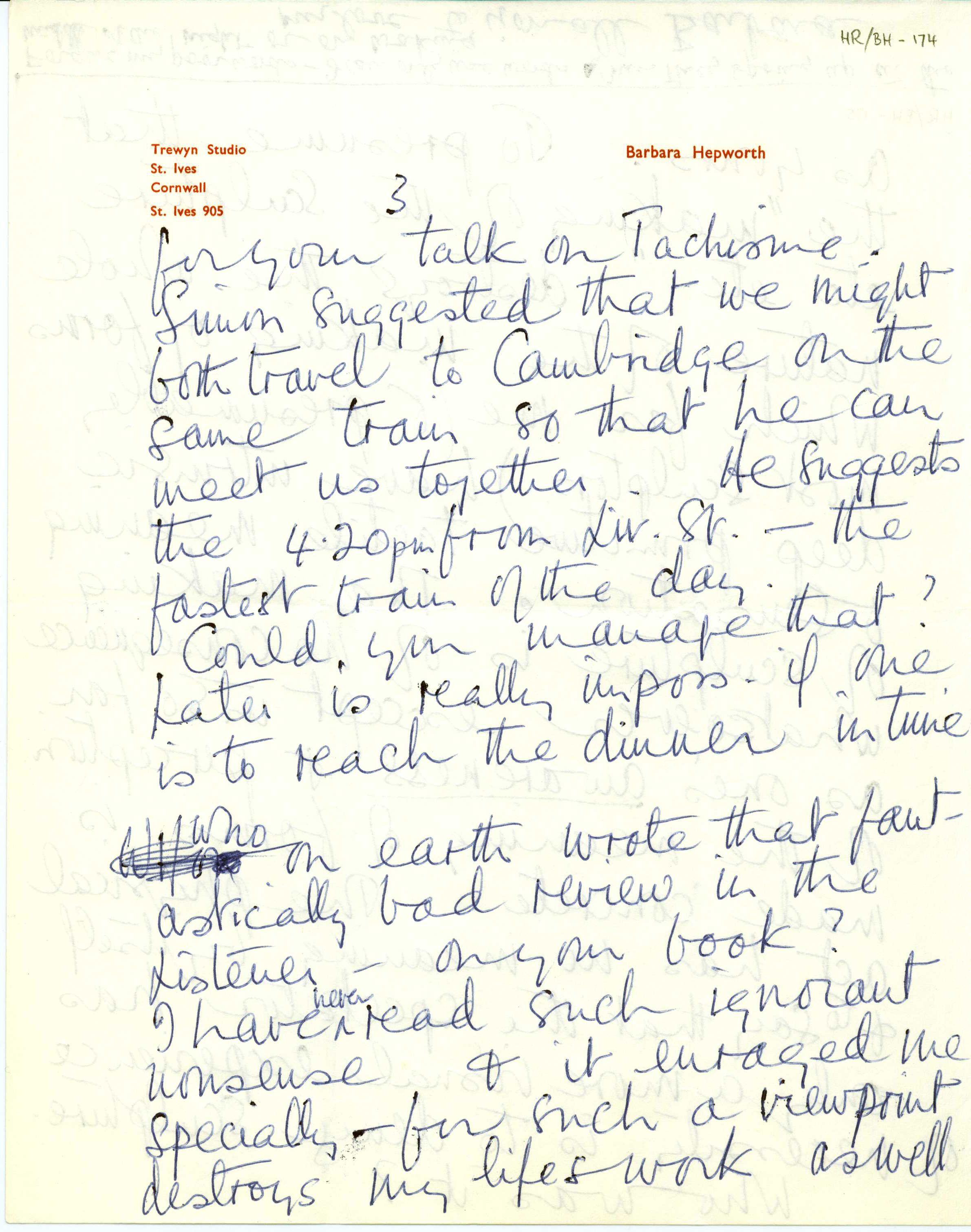 Part of a collection of letters to Sir Herbert Read from Dame Barbara Hepworth (English artist and sculptor and, along with Read, a member of the modern art movement Unit One founded by Paul Nash), that span the time period of 1940 to 1965 and discuss their artistic and literary endeavors, philosophical and political views, and personal lives. Notes a bad review of Read's book published in The Listener magazine.