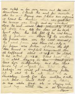 A letter from Mary Barrow to her father-in-law Valentine E. Barrow, March 9, 1918. Mary and her husband Frederick Lyon lived at 19, Westholme Road, Golders Green in London, and Mary wrote the letter after a bomb fell near their home. Biography: Frederick Lyon Barrow enlisted in September 1914, and served in the 9th Battalion in England in the C.A.P.C. (Canadian Army Pay Corps), stationed in London. Mary Hutton Barrow was born in England in 1893 and emigrated to Edmonton, Canada. She died in 1965. During the First World War she volunteered extensively for the Red Cross, St. John Ambulance, wartime canteen, etc. Her brother, Jack Hutton, enlisted and died during the war. Frederick Barrow was born in 1894 in England and immigrated to Edmonton with his parents. He served with the Canadian forces oversees from 1914 to 1920. After the war he became an Adjustment Officer with the Great War Veterans' Association and Canadian Legion, and later became the first Departmental Secretary of the Department of Veterans Affairs. He gave extensive evidence before the Federal Special Committee on Returned Soldiers' Problems. He died in 1979. Frederick and Mary had one daughter, Valentine Kathleen, who was a member of the RCAF women’s division, and later became a librarian at the University of Guelph. Frederick and Mary traveled extensively and visited about 40 countries.