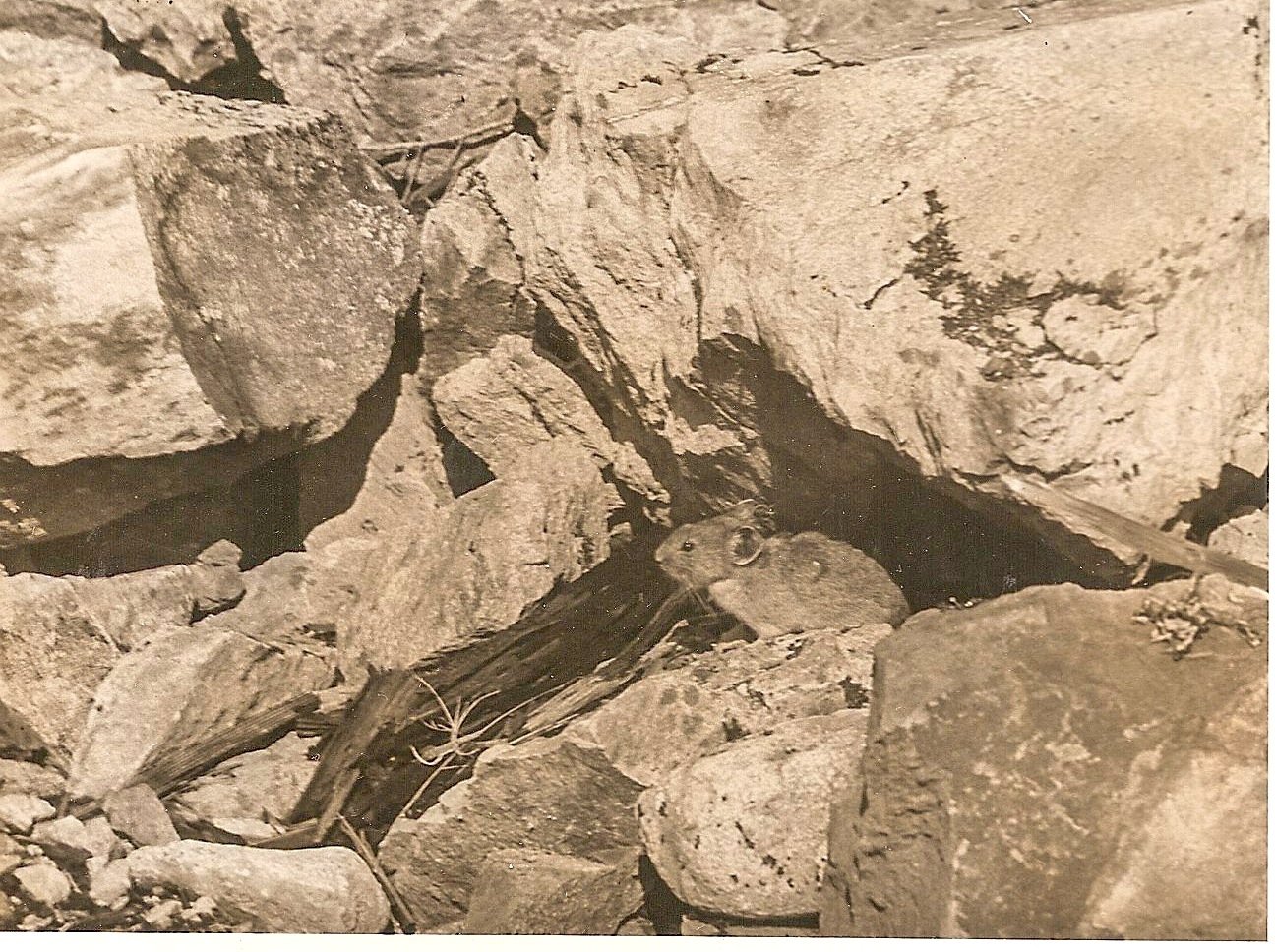 Side view of an American pika (Ochotona princeps brunnescens) sitting among rocks.