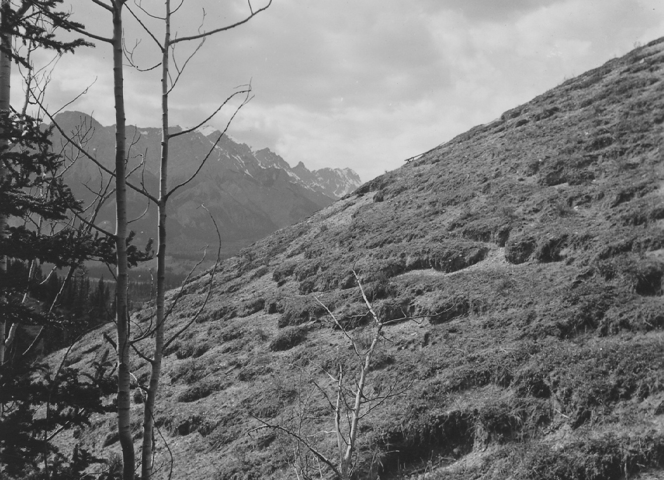 Erosion of grassland on the slope of a mounatin due to grazing by sheep.
