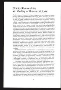 In March 1987 a Shinto shrine was opened in the Japanese Garden at the Art Gallery of Greater Victoria. This publication provides background information and a description of the shrine. Selected bibliography included. Designed by James Bennett and printed by Morriss Printing Company Ltd. Victoria British Columbia. Translation: Jack Guthrie (French) and Michiko Warkentyne (Japanese).