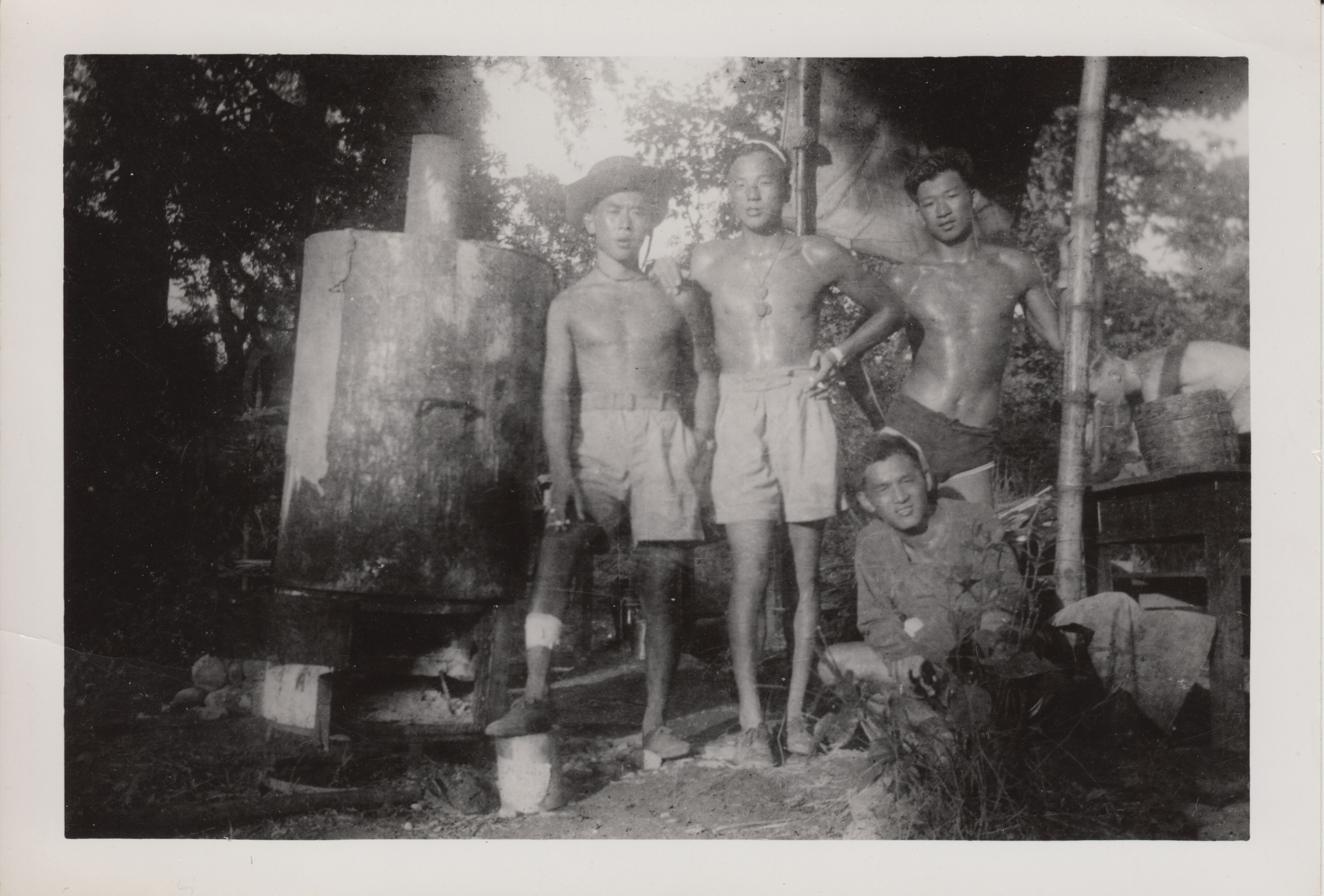 Shows Victor Wong and three of his comrades in India. During the World War II, more than 600 Chinese Canadians volunteered to fight for Canada. They became part of an elite unit known as the Special Force 136 of the Special Operations Executive (SOE) and the South East Asia Combat (SEAC) under Lord Mountbatten.