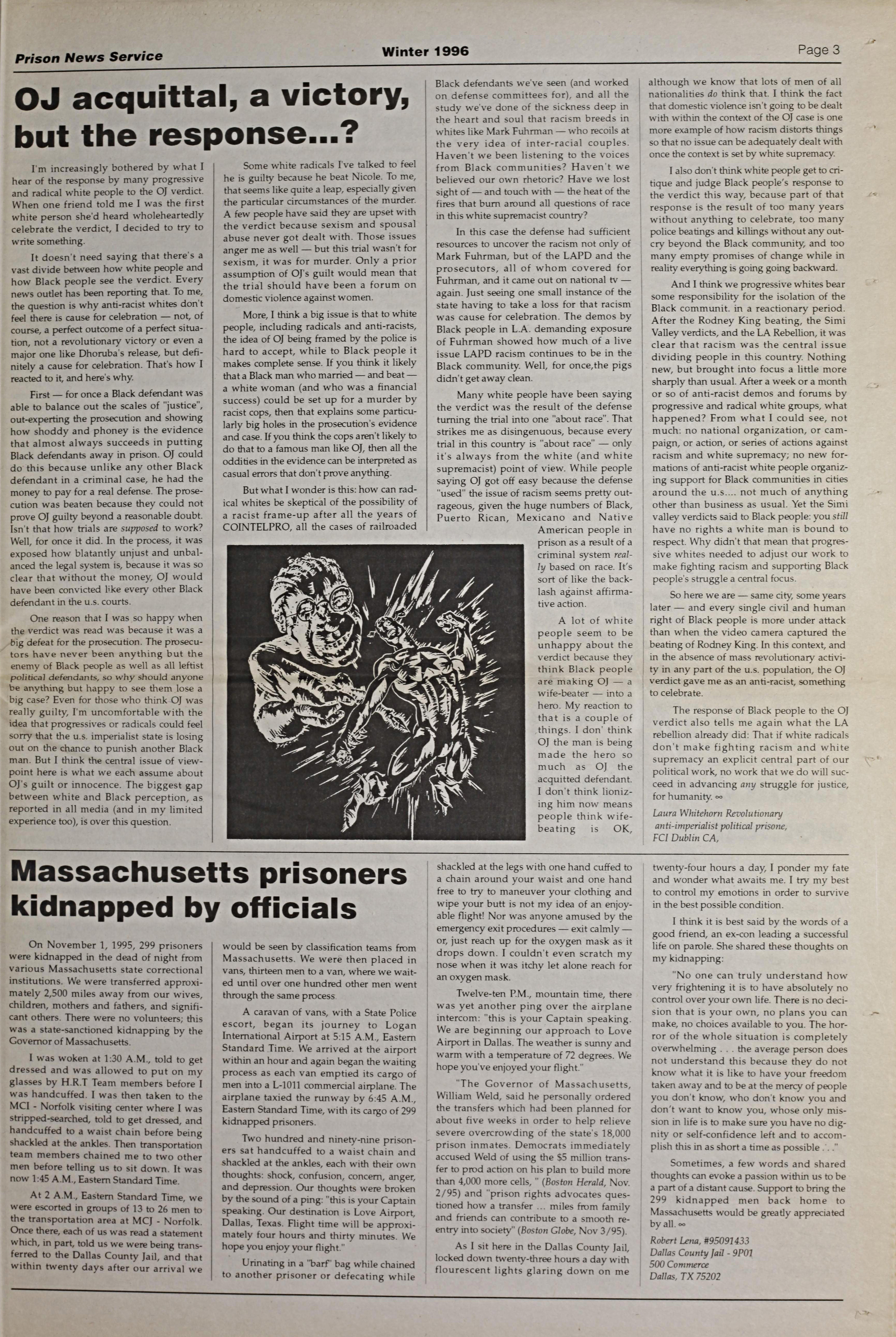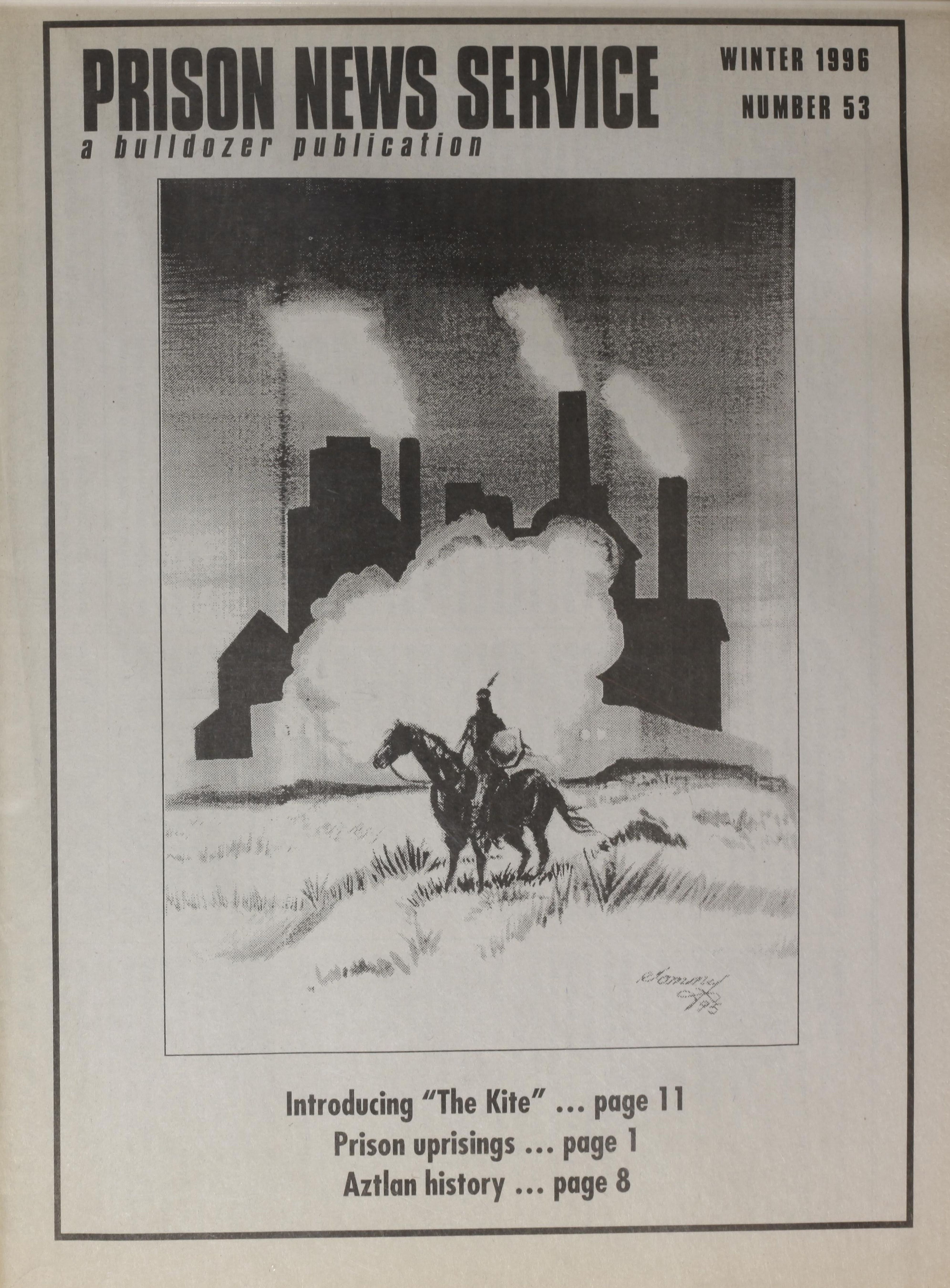 PNS editor: Bulldozer Collective. Articles include: "The October uprisings - shaking the foundations"; "A call to action on control units"; "Letter campaign for Peltier in Canada"; Dozer notes; "OJ acquittal, a victory, but the response...?"; "Massachusetts prisoners kidnapped by officials"; "Ohio update - Perotti wins in court"; "Islam does uphold women"; "Experimental food substance Vita Pro being used illeagally"; "Jackson ABC raided, 3 arrested"; "The Eugene Britt case: who is responsible?"; "ACA notice"; "Murder by any otehr name"; "Iron House Drum : The Mestizo-Mexicano-Apache Indian history revisited by Luis V. Rodriguez"; "Close observations from "close management" down Florida way"; "SHU prisoners in Indiana, wake-up"; "When the heat is on - silence is golden"; "Update on telephone lawsuit". The Kite: Community justice issues news, information and analysis (v.1, #. 1). "Prison for Women inquiry ends" by Gail Stoddart; "Gentles case appeal"; "Criminal libel case" by Jen Metcalfe; "Toronto Don Jail prisoners refused legal aid"; "Carmeta Gentles speaks"; "Delays claim life of Nigerian refugee"; "Police shooting death of Tommy Barnett"; Copwatch; "Report finds systemic racism in Ontario justice system" by Tariq Hassan-Gordon; Resources; "Prisoners win right to vote in federal elections" by Michael King; "Special handling units ruled lawful" by Michael King; Unjustified detention and deportation" by Tariq Hassan-Gordon; "Victory for psychiatric survivors" by Jennifer Chambers; "Campaign to support women facing deportation" by Lincoln Depradine; "Watching the watchdogs" by Sunday Harrison; "Hate groups and white supremacist governments target native nations" remarks by Kahn-Tineta Horn. [end of The Kite] "Assata i was in chains"; "A message to the Crips and Bloods and all of my bruthaz and sistaz"; "Political prisoners and the million man march"; "Political prisons, political prisoners and political prison policies"; Links without chains; "Book planned of New Afrikan prisoner writings"; National Incarcerated Muslim Network; ""Come clean" and "Response": a dialogue towards understanding"; Resources.