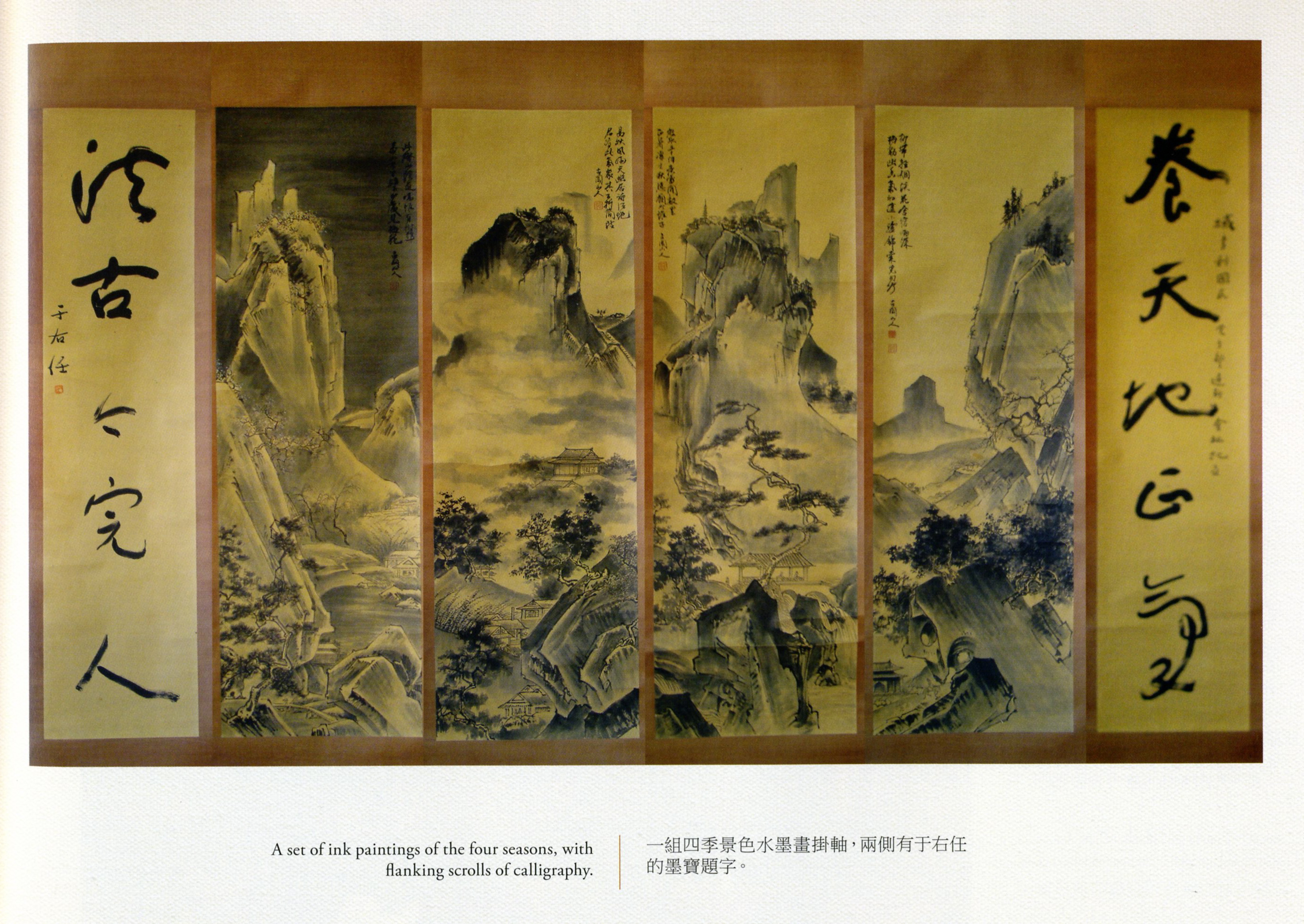 Shows a set of Chinese ink paintings of the four seasons with flanking scrolls of calligraphy by Yu Youren. Yu Youren (于右任, 1879 – 1964) was an educator, scholar, calligrapher, and politician in the Republic of China.