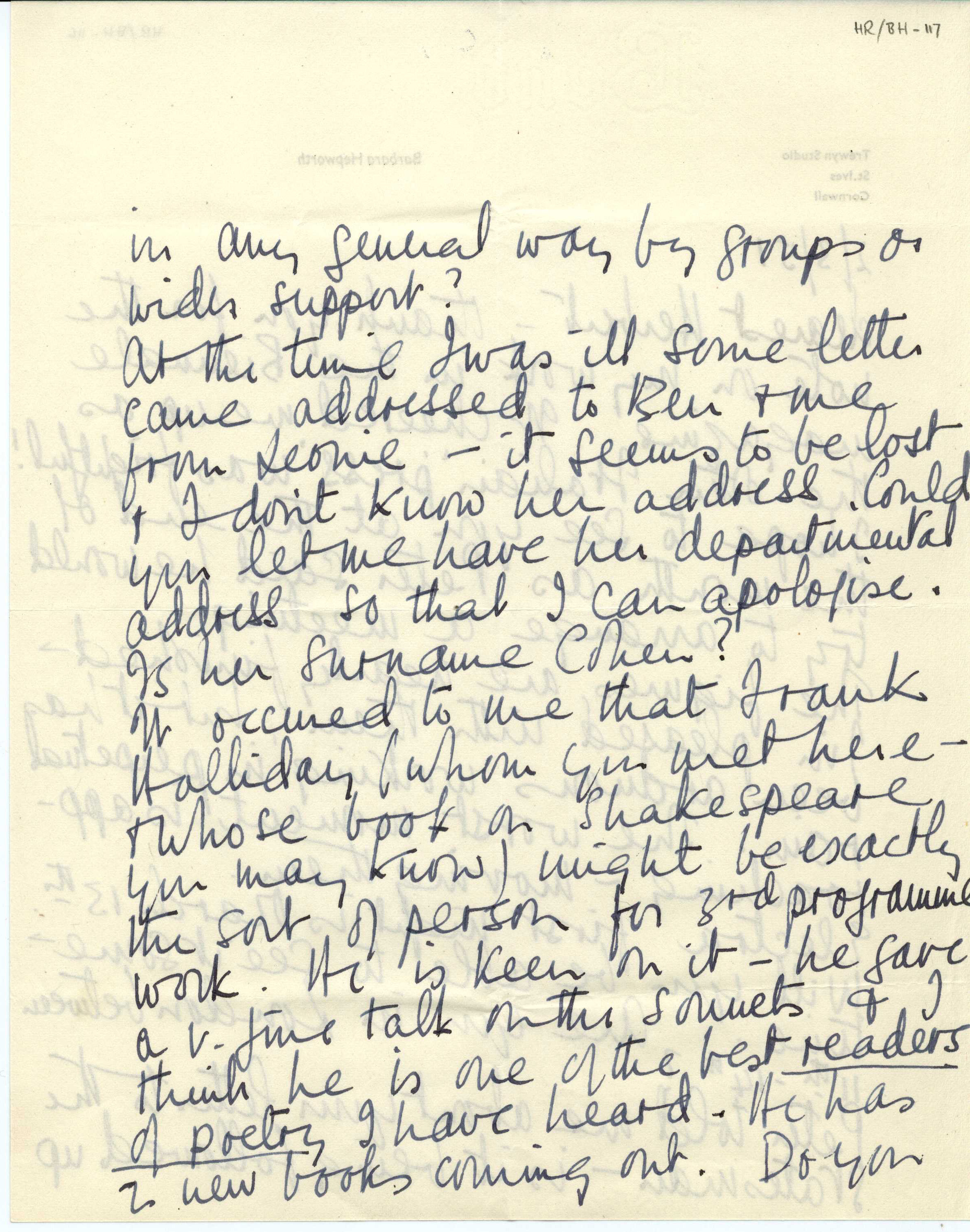 Part of a collection of letters to Sir Herbert Read from Dame Barbara Hepworth (English artist and sculptor and, along with Read, a member of the modern art movement Unit One founded by Paul Nash), that span the time period of 1940 to 1965 and discuss their artistic and literary endeavors, philosophical and political views, and personal lives. Frank Halliday, historian, is mentioned.
