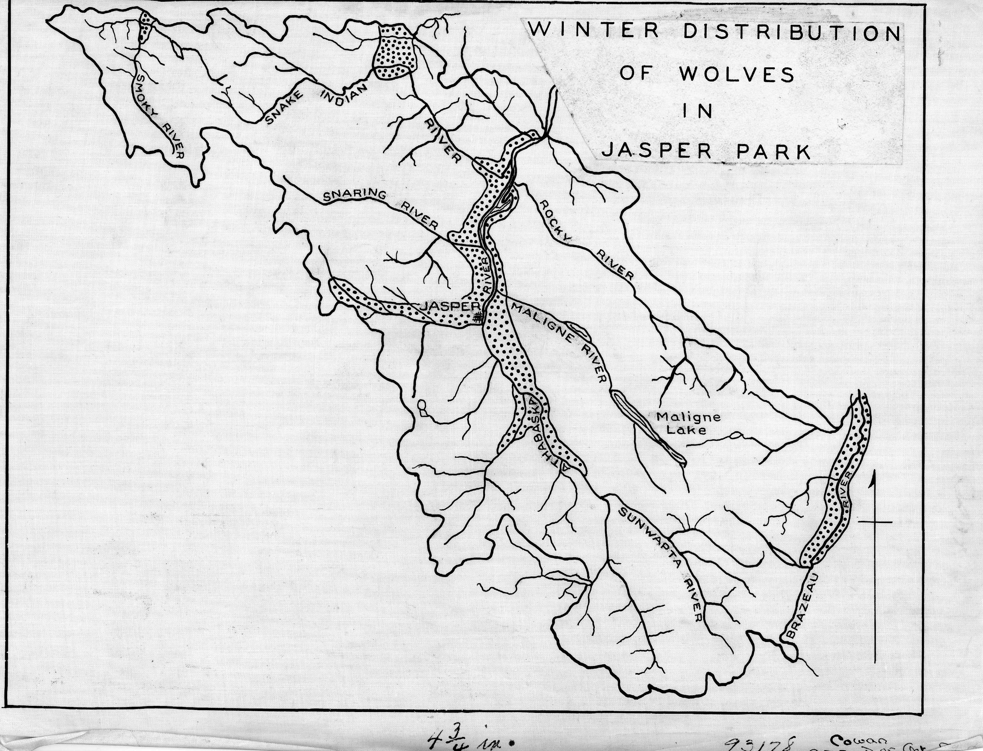 Map from Ian McTaggart-Cowan's publication showing the winter distribution of wolves in Jasper Park.