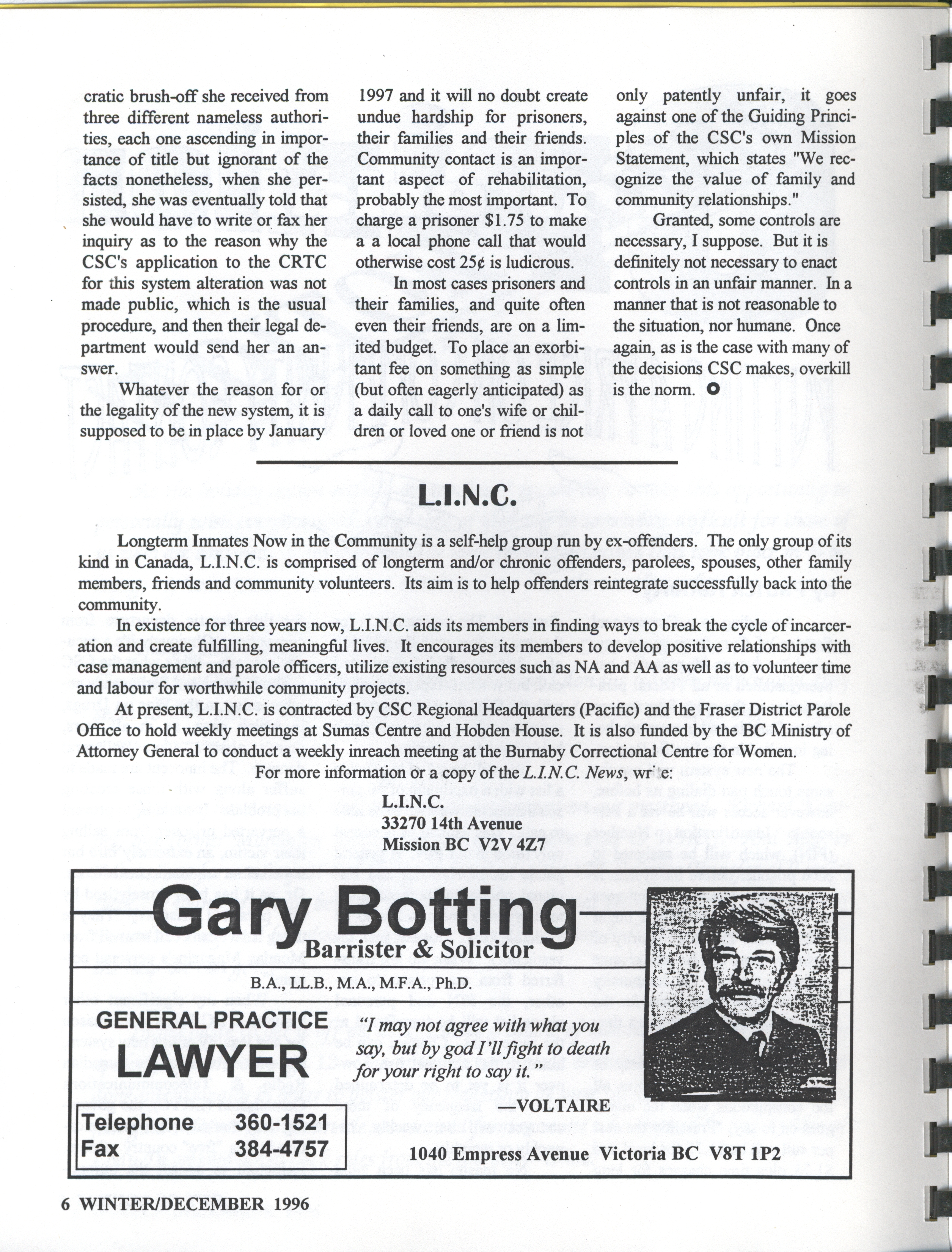 A non-profit quarterly publication of the thoughts, feelings, and distinct perspectives of prisoners and visitors by the prisoners at William Head Institution in Victoria, B.C. with the aim of providing a different view to the general public. Edited by Patrick W. Rafferty.