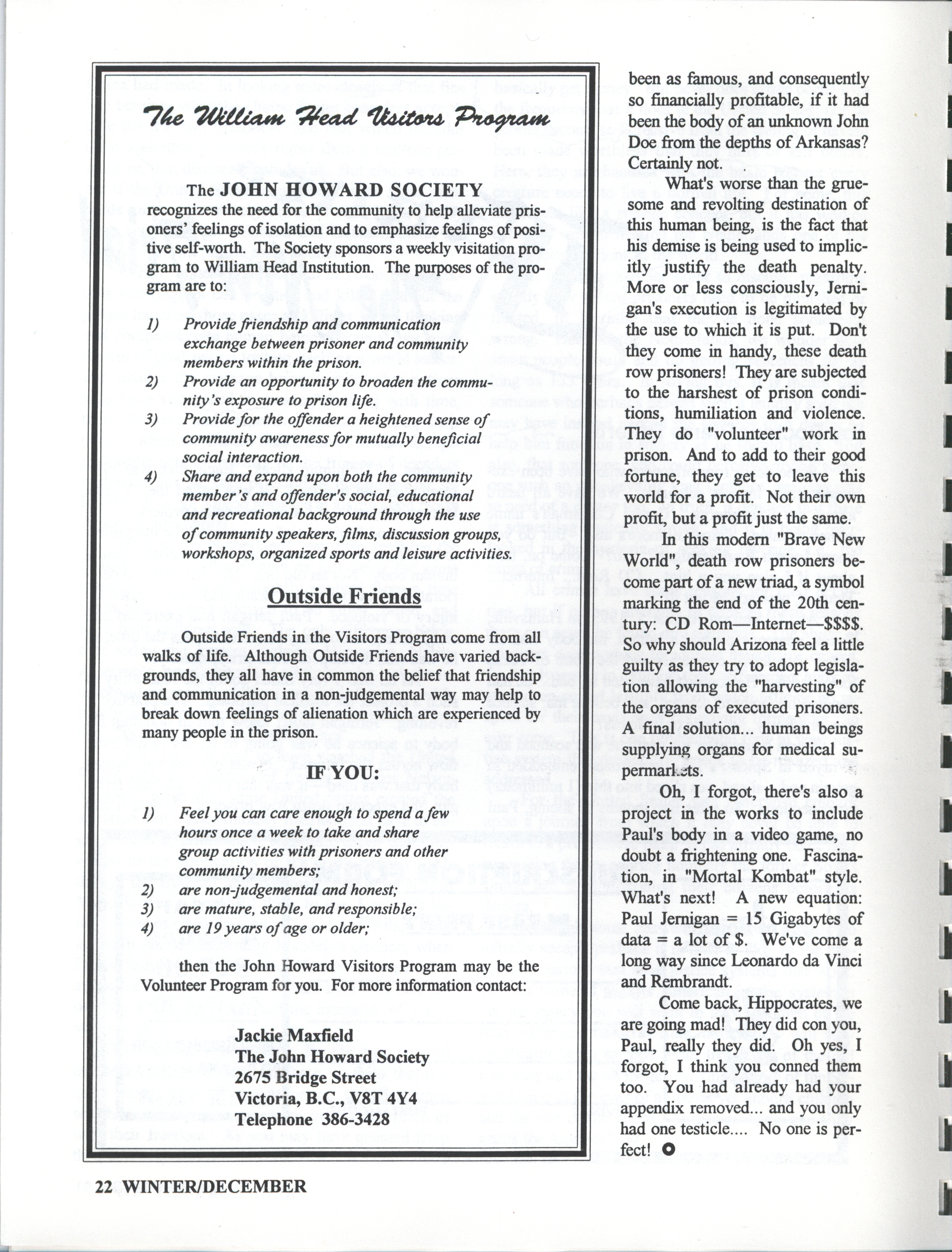 A non-profit quarterly publication of the thoughts, feelings, and distinct perspectives of prisoners and visitors by the prisoners at William Head Institution in Victoria, B.C. with the aim of providing a different view to the general public. Edited by Patrick W. Rafferty.