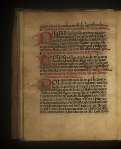 - "Modern foliation in pencil, top outer recto, 1-33 (collation i10 [-5 -7; cancelled with no apparent loss of text; neat stubs remain] ii8 iii8 [-2 -3; two leaves lacking with loss of text] iv12 [-1;cancelled with no apparent loss of text; neat stub remains]), horizontal (quire i) or slightly diagonal (quires ii-iii) catchwords with decorative frames, lower inner verso, ruled in lead with full-length vertical bounding lines, copied on every other ruled line, prickings visible in upper, lower, and outer margins (justification 177-198 x 132-144 mm.), written in black ink in a very fine formal Iberian Gothic Rotunda bookhand in twenty-eight to thirty-one long lines, red rubrics with black paraphs, red paraphs, red and black line-fillers, two- to five-line red initials with pen decoration in black and purple, with following word nearly always written in larger, bolder Rotunda script, some of the ink has faded on f. 9, though text remains legible, slight gaps in parchment stitched together in the lower outer corners of ff. 7 and 16, blurred library stamp visible in lower margin of f. 1..... Original wallet binding of limp parchment, with upper cover continuing in a flap that wraps around the fore-edge, binding straps now lacking, with pattern of holes in the lower cover indicating where these straps may once have been attached, sewn on three white leather thongs laced through slits in the spine and upper and lower covers, inscription in dark ink in cursive on upper cover, “Regla de l[a?] Sagrada orden de penitencia de la N[uestra] S[eraphica] P[adre] S[ant] Francisco,” with inscription, “LOC(?) / S,” written over it and a year, “1530,” noted above it in much smaller script, probable pressmark, “[L? or D?] 18,” written on the spine in dark brown ink, a folded fragment from a twelfth-century(?) liturgical manuscript containing musical notation has been used as reinforcement in the fore-edge flap of the upper cover, parchment of binding now stained and slightly curled with a tear over the spine." -- Bookseller's description.