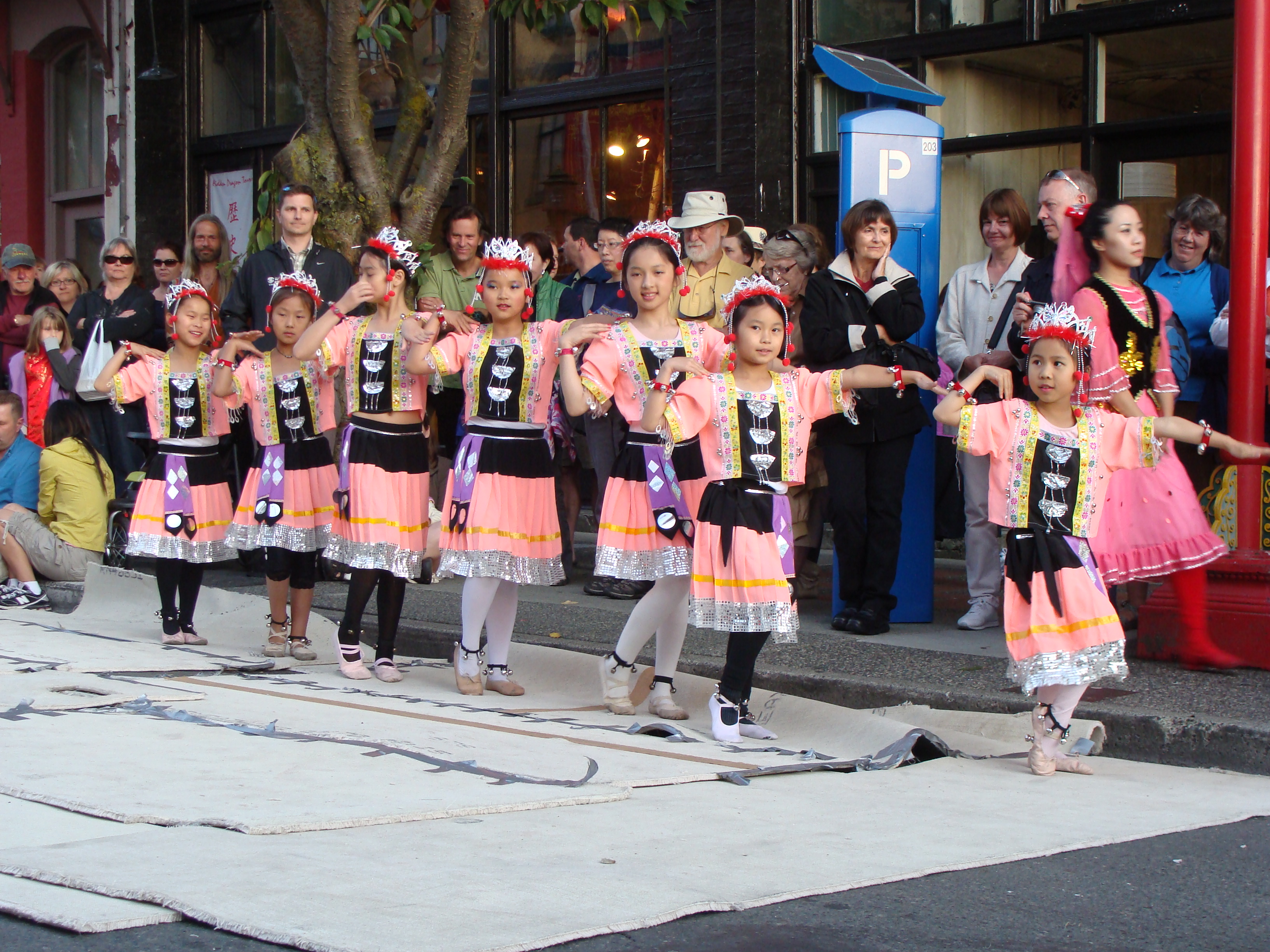 Girls in Chinese folk dance costumes at Night Market, Fisgard Street, Victoria, B.C. In 2011, the Victoria Chinese Commerce Association, in partnership with businesses and individuals in the community, hosted a night market once a month.
