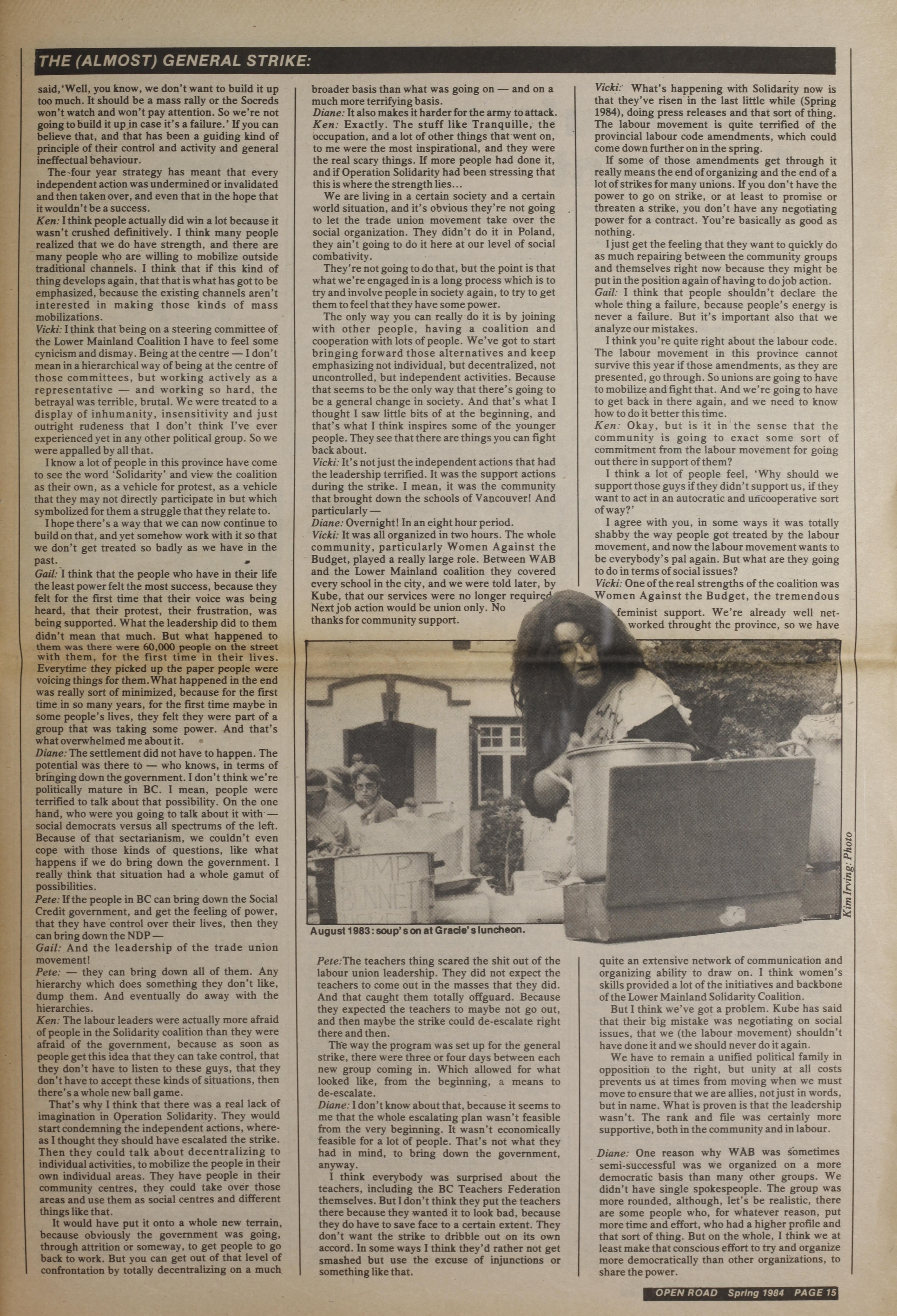 In this issue: Anarchist News. "The Litton bombing: bomb fallout nukes cruise contract"; "Netherlands: Pigs smash Wyers squat"; "Starts hunger strike: Peltier to get new hearing"; "Japan: Anarchist on death row"; "Ken Deyarmond: Thatcher fan arrested"; "The Brinks trial: life terms for BLA members"; "W. Germany" Radikal editors jailed for dissent"; "Native Olympics: run for autonomy". The Vancouver Five. "One trial down; four to go: the conspiracy in the courtroom"; "Ann Hansen: feminist resistance vs. reform"; "Doug Stewart: living in reality". Electronic surveillance: I. "Even the walls have ears". Electronic surveillance: II. "Reach out and tap somebody". The Litton bombing. "The poverty of coffeehouse activism: Litton and the left". Letter from Nicaragua. "The Sandinista Revolution: vanguard leadership and direct democracy". Spain's secret police. "Spain's fascists thriving: rose-tinted fascism" by Max Zwick. Peace movement: Vancouver. "Defusing the anti-nuke movement: ear plugs on" by Bill Horne. Peace movement: Montreal. "The marginals strike back: peace breaks out from behind party lines". The (almost) general strike. "Solidarity inquest: who's afraid of the general strike?". "Noam Chomsky interview: the manufacture of consent". "Augustin Souchy 1892-1984: devoted to the ideals of freedom" by Abe Bluestein. "George Orwell" by George Woodcock. News from Nowhere. Book review. "The invisible dictator: [review of] The social and political thought of Michael Bakunin by Richard Saltman". Roadside Notes.
