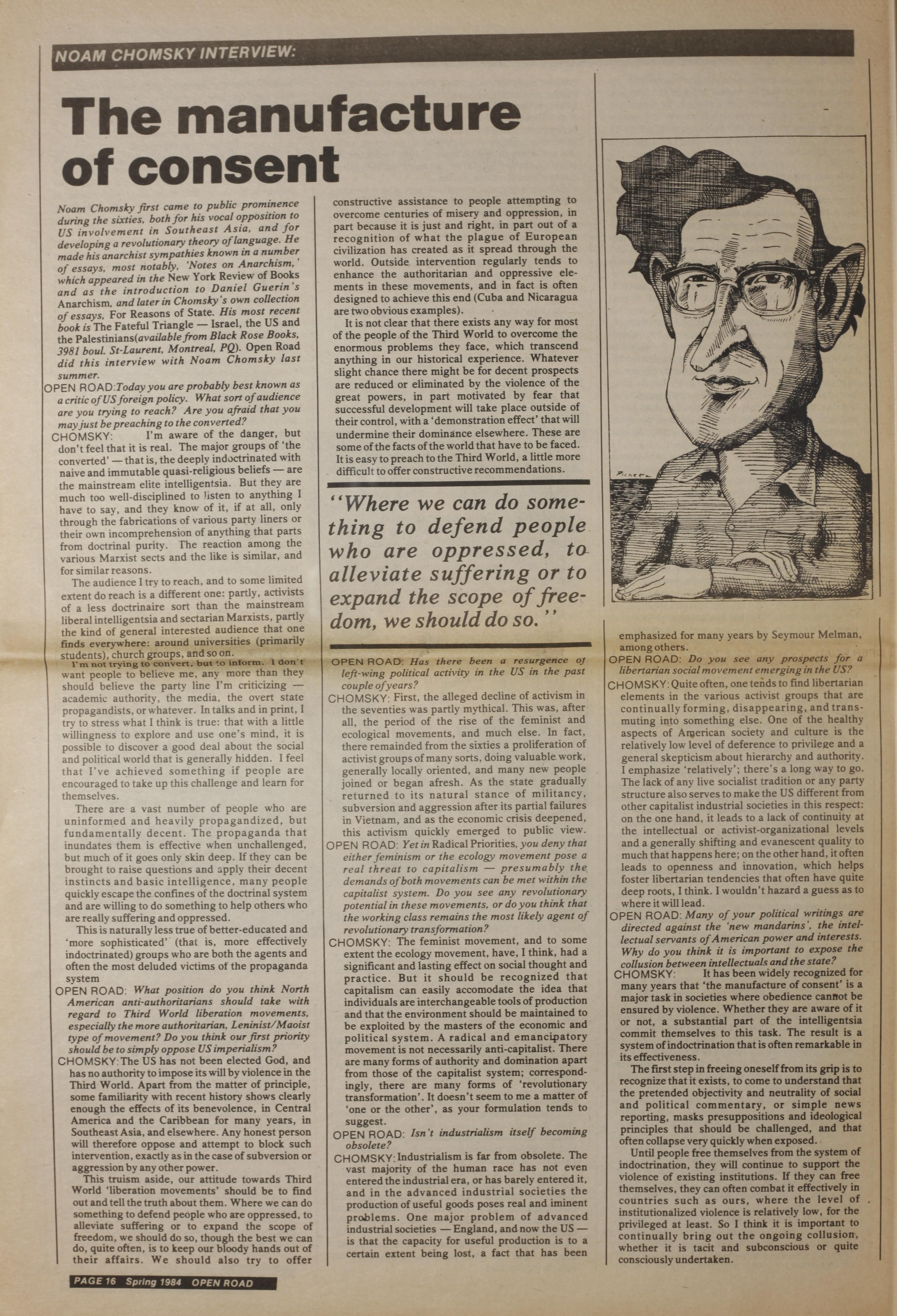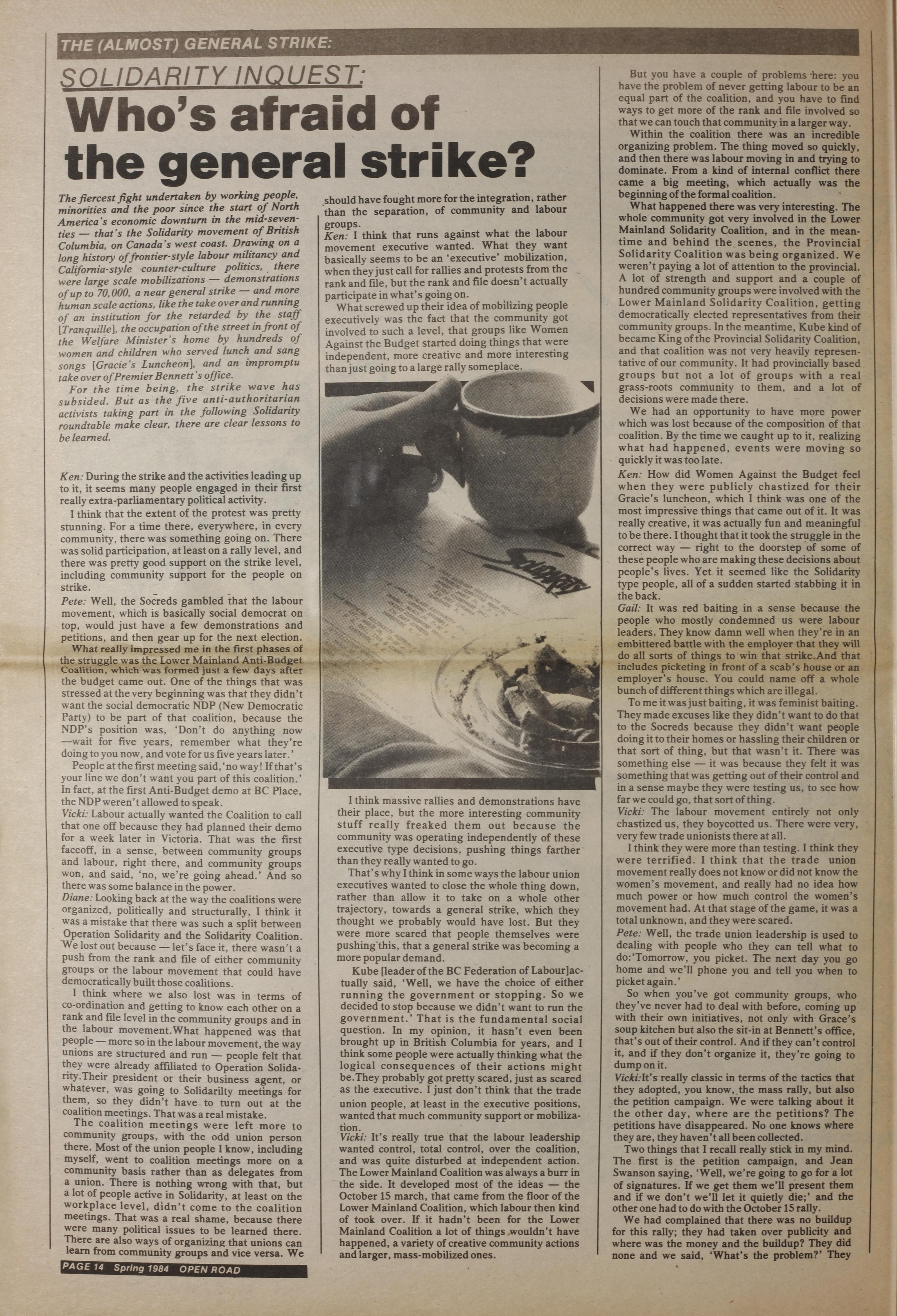 In this issue: Anarchist News. "The Litton bombing: bomb fallout nukes cruise contract"; "Netherlands: Pigs smash Wyers squat"; "Starts hunger strike: Peltier to get new hearing"; "Japan: Anarchist on death row"; "Ken Deyarmond: Thatcher fan arrested"; "The Brinks trial: life terms for BLA members"; "W. Germany" Radikal editors jailed for dissent"; "Native Olympics: run for autonomy". The Vancouver Five. "One trial down; four to go: the conspiracy in the courtroom"; "Ann Hansen: feminist resistance vs. reform"; "Doug Stewart: living in reality". Electronic surveillance: I. "Even the walls have ears". Electronic surveillance: II. "Reach out and tap somebody". The Litton bombing. "The poverty of coffeehouse activism: Litton and the left". Letter from Nicaragua. "The Sandinista Revolution: vanguard leadership and direct democracy". Spain's secret police. "Spain's fascists thriving: rose-tinted fascism" by Max Zwick. Peace movement: Vancouver. "Defusing the anti-nuke movement: ear plugs on" by Bill Horne. Peace movement: Montreal. "The marginals strike back: peace breaks out from behind party lines". The (almost) general strike. "Solidarity inquest: who's afraid of the general strike?". "Noam Chomsky interview: the manufacture of consent". "Augustin Souchy 1892-1984: devoted to the ideals of freedom" by Abe Bluestein. "George Orwell" by George Woodcock. News from Nowhere. Book review. "The invisible dictator: [review of] The social and political thought of Michael Bakunin by Richard Saltman". Roadside Notes.