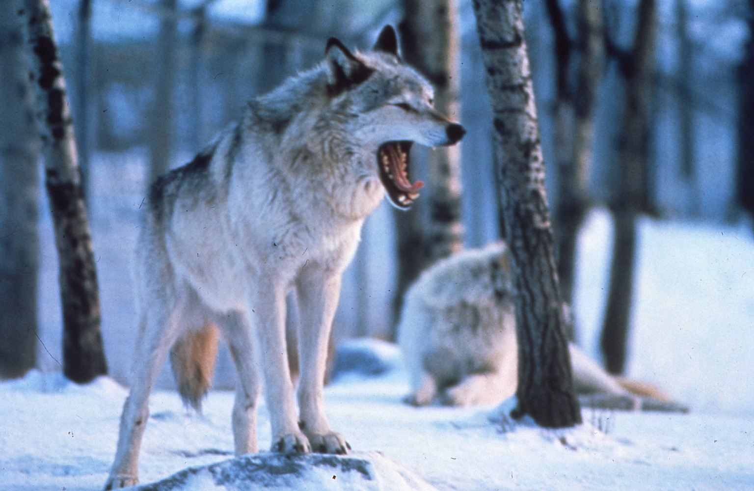 Close-up of a wolf with mouth open and another wolf lying on snow in background. People mentioned: David Mech.