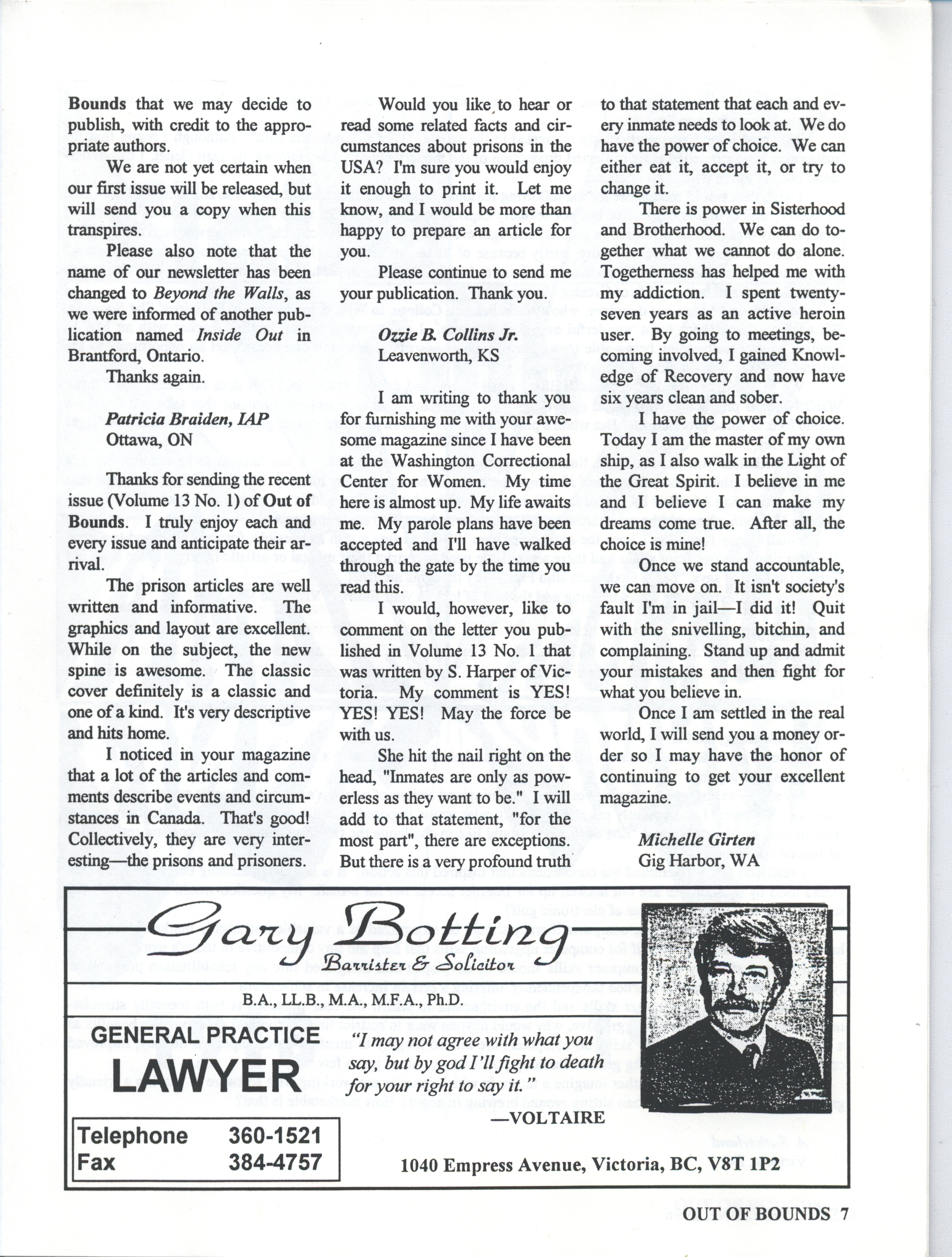 A non-profit quarterly publication of the thoughts, feelings, and distinct perspectives of prisoners and visitors by the prisoners at William Head Institution in Victoria, B.C. with the aim of providing a different view to the general public. Edited by Patrick W. Rafferty.