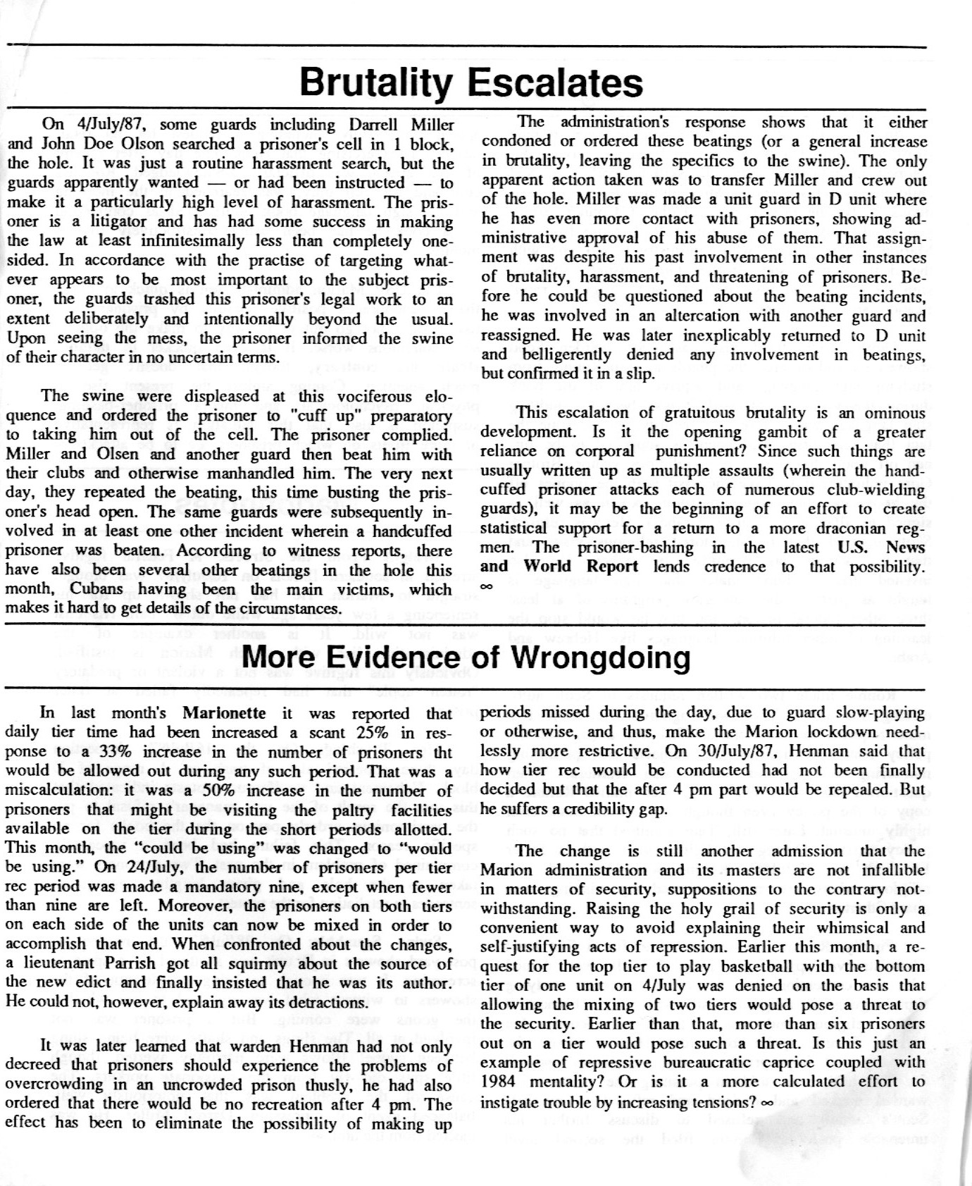 Edited by Bill Dunne. Article topics include: Vicious propaganda, Brutality escalates, More evidence of wrongdoing, sign of the times, Marionnotes.