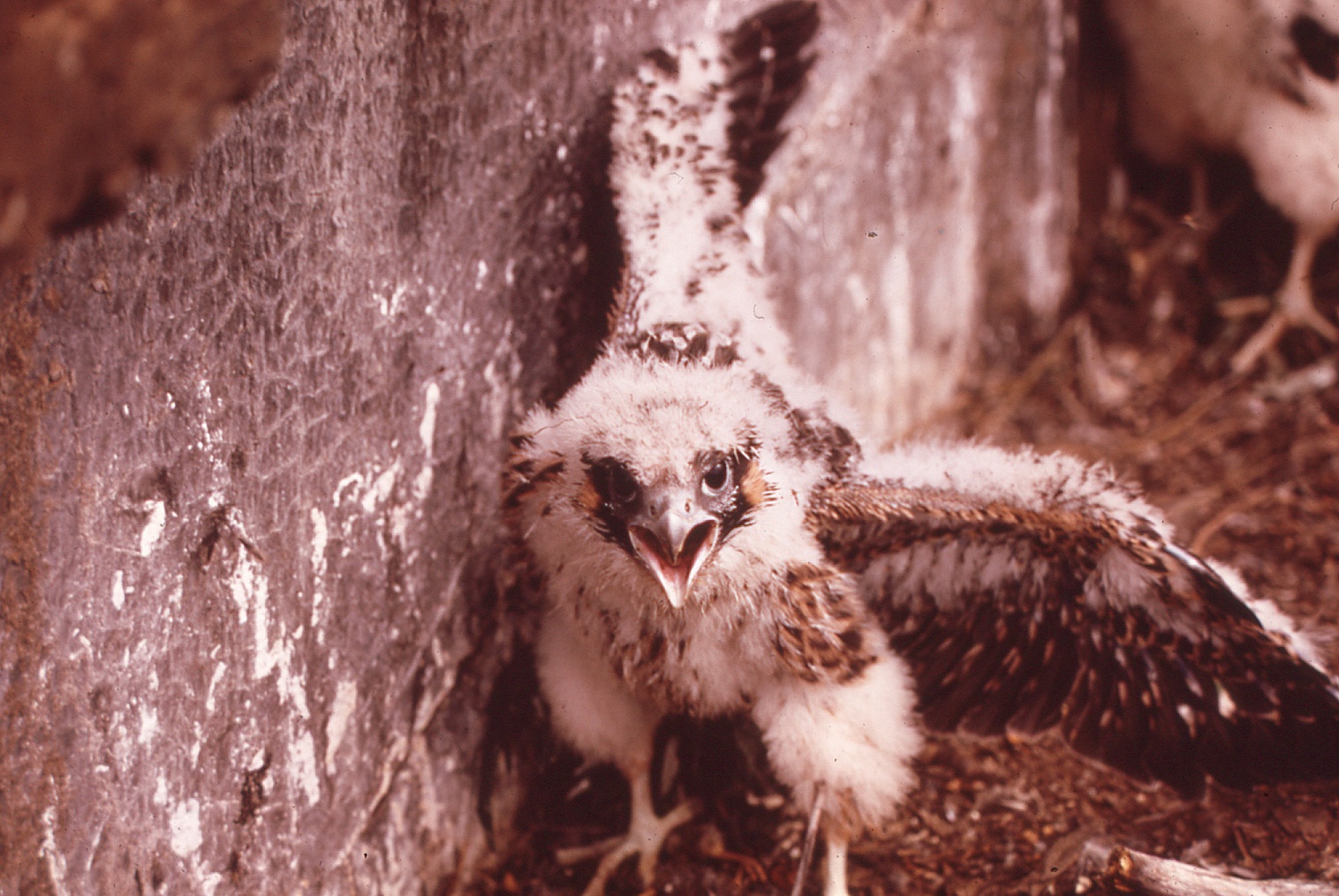 Close-up of a chick, most likely a peregrine. These are slides used in a boreal lecture. There are no notes for them. They appear to be Ian McTaggart-Cowan's photos.