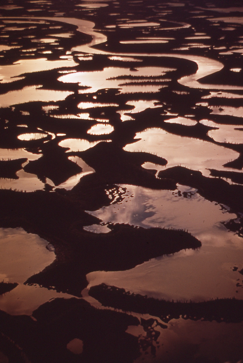 Aerial view of wet marshland at dawn or dusk. These are slides used in a boreal lecture. There are no notes for them. They appear to be Ian McTaggart-Cowan's photos.