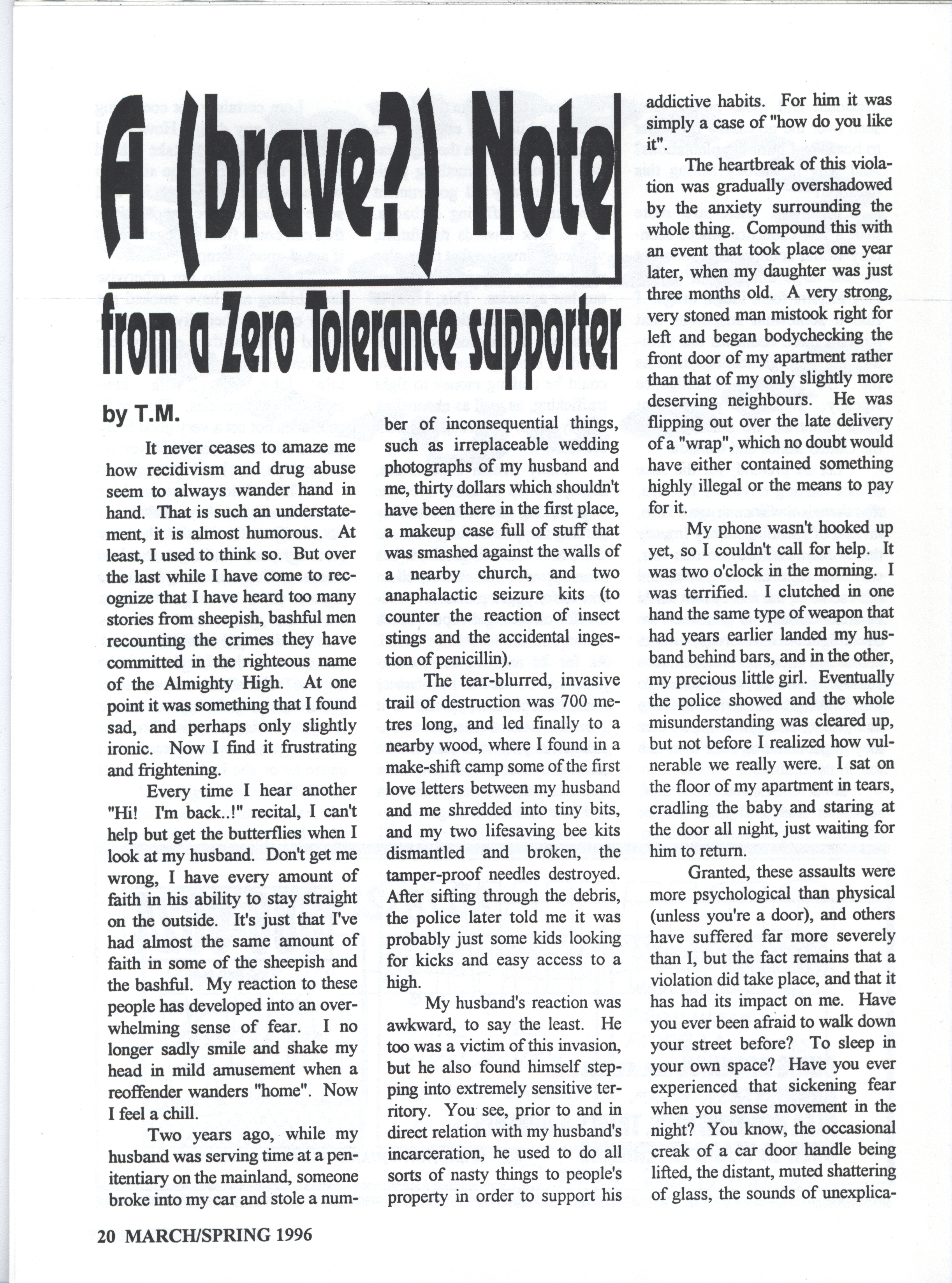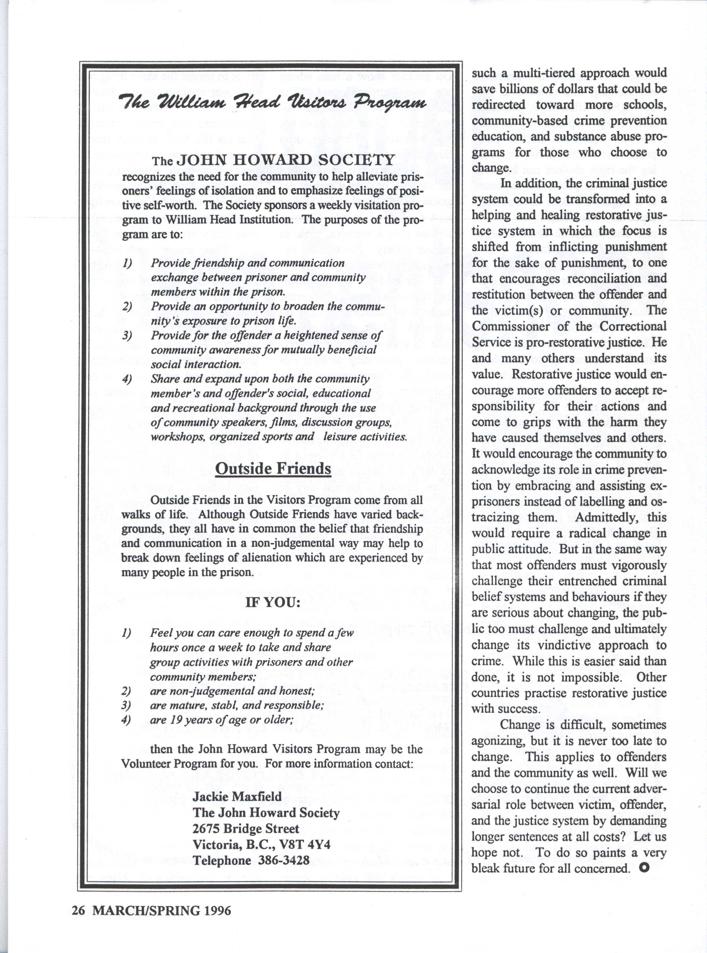A non-profit quarterly publication of the thoughts, feelings, and distinct perspectives of prisoners and visitors by the prisoners at William Head Institution in Victoria, B.C. with the aim of providing a different view to the general public. Edited by Patrick W. Rafferty.