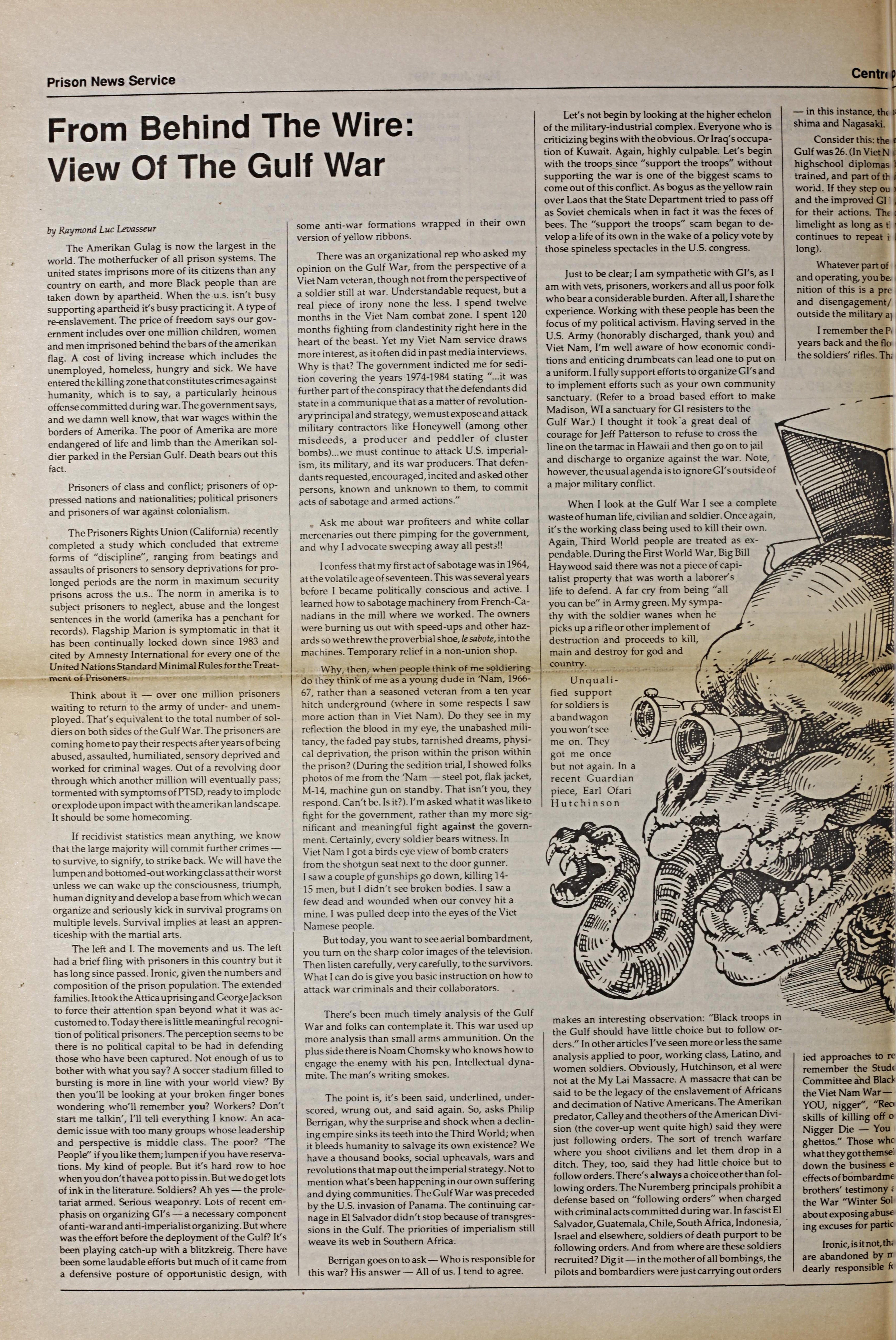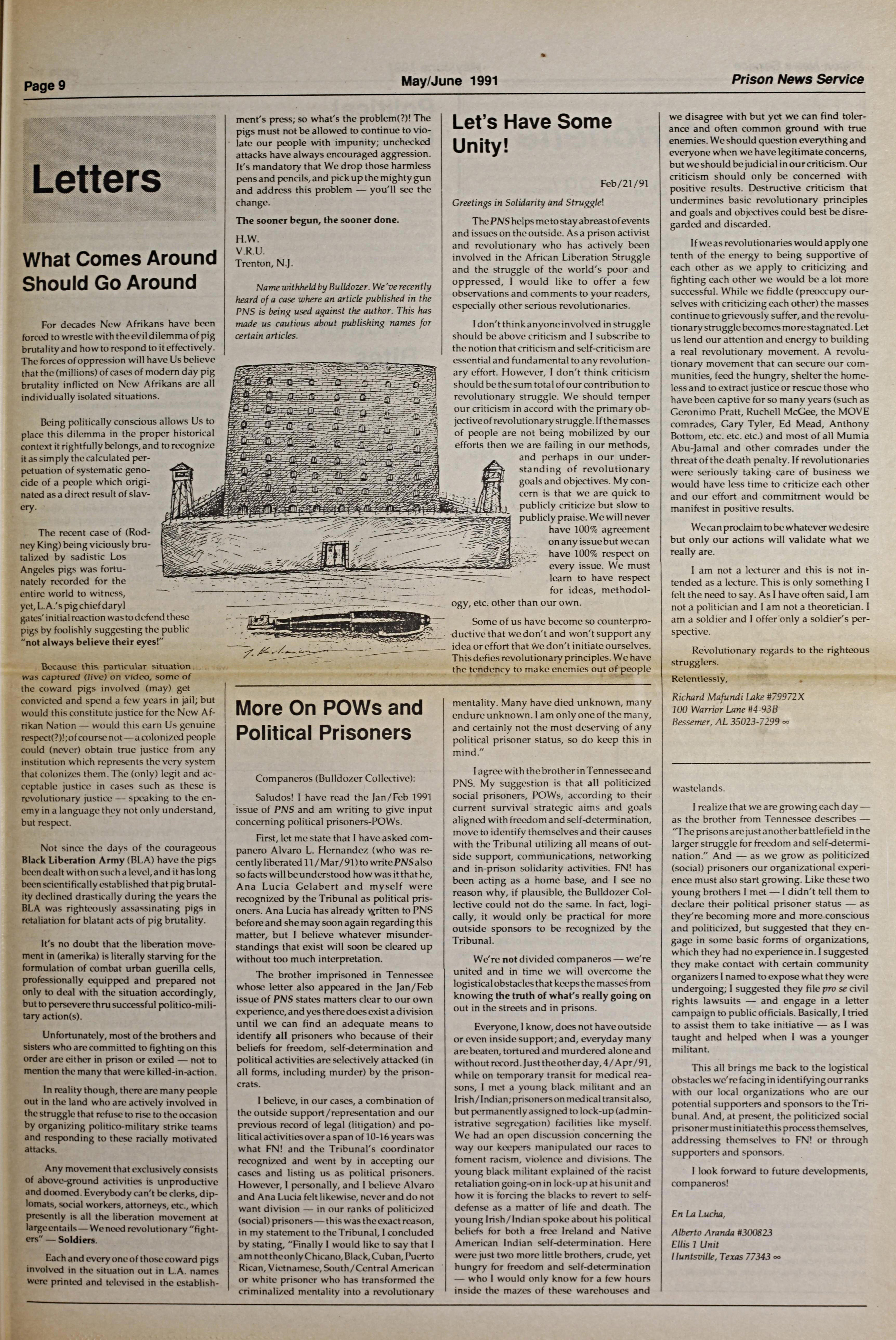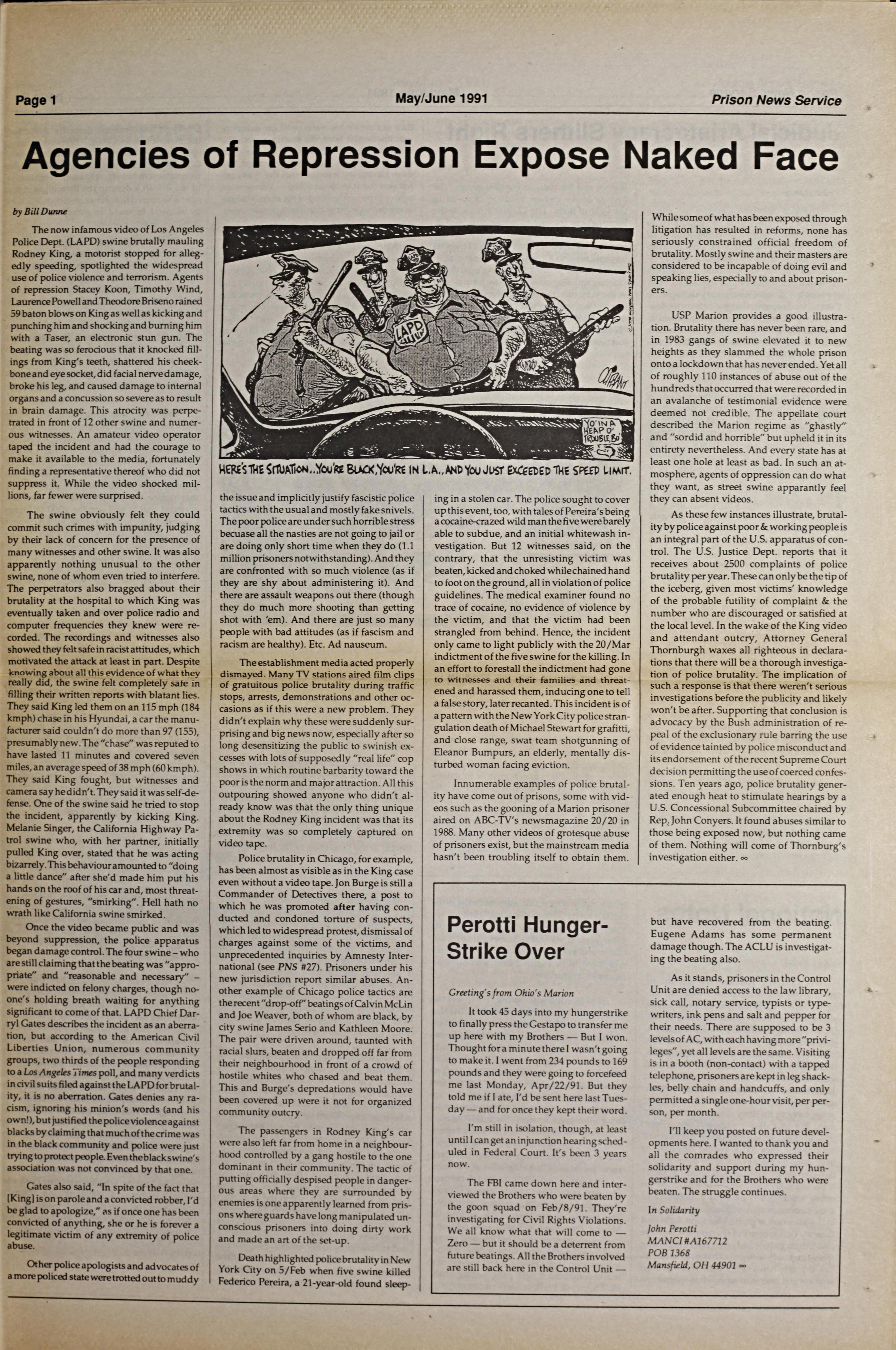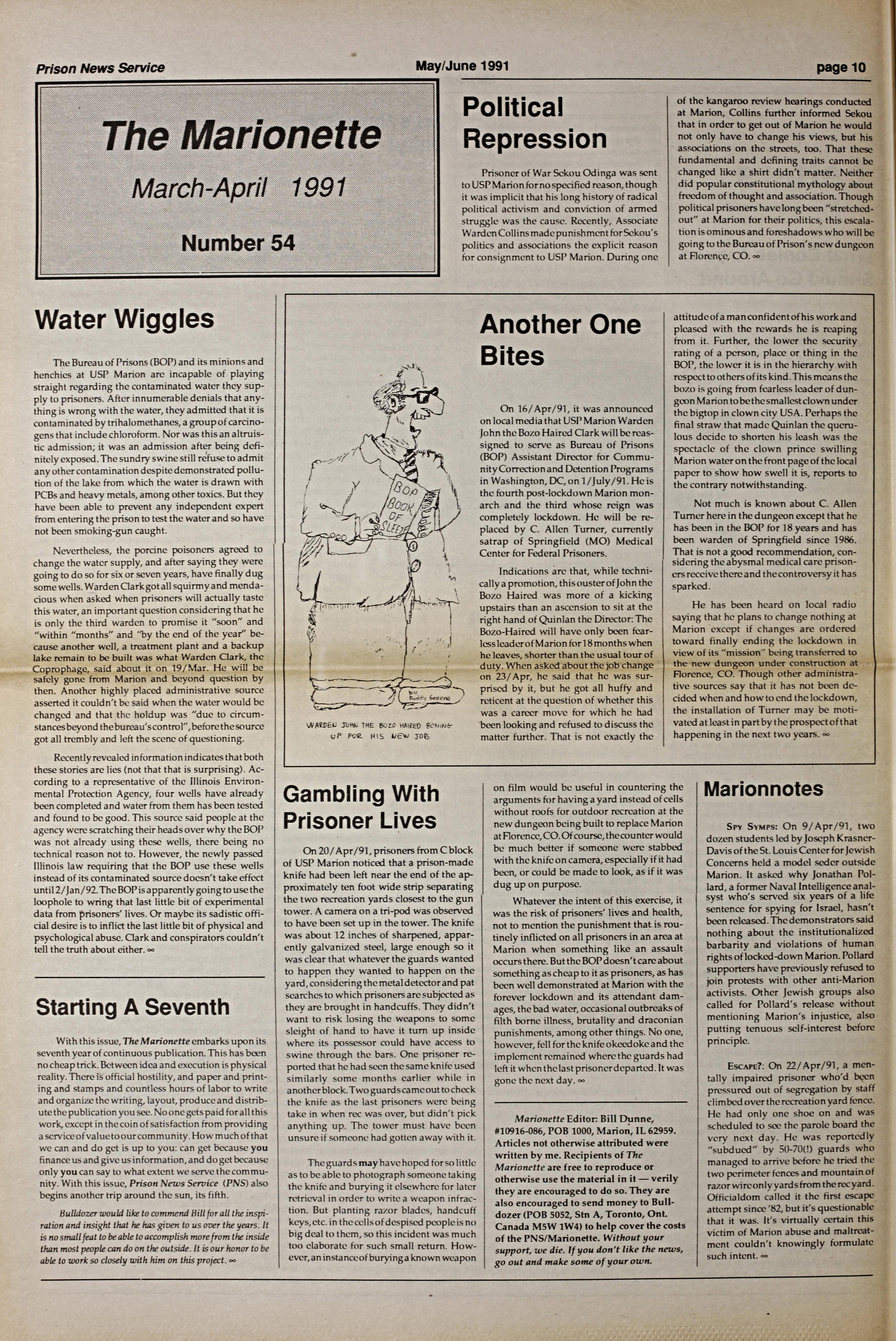 PNS editor: Bulldozer Collective. Article topics include: Los Angeles Police Dept. responsible for the beating of Rodney King ("Agencies of repression expose naked face". by Bill Dunne) -- John Perotti ends hunger strike at Marion after 45 days ("Perotti hungerstrike over") -- U.S. Supreme Court continues its attack on civil liberties ("Judicial aristocracy slithers right", by Bill Dunne) -- Continuing debate on Freedom Now!, following last issue of PNS's FN supplement ("FN supplement commentary", by Bill Dunne) -- Counter-demonstration against fascist rally in Denver to celebrate Hitler's birthday decried as violent by mainstream press ("Plenty left to speak up", by Jennie Vanderwall) -- Legal attacks against poll tax opponents in Britain continue ("British poll tax prisoners", by Bulldozer) -- A short history of the Black Panther Party (BPP) and a call to a new generation to remember those who fought for them ("Lessons from antiquity", by Mumia abu-Jamal) -- "Angola prisoners need support' -- Discussion of whether Michael Stotts, the organizer/editor of Behind the walls is an informer, manipulator and agent of the state ("Michael Stotts, uncovered?", by Larry Giddings) -- Activists calling themselves Direct Action (Ann Hansen, Brent Taylor, Gerry Hannah, Doug Stewart, Julie Belmas), charged in the bombing of a B.C. Hydro sub-station, the bombing of a Litton Industries factory outside of Toronto, and the fire bombing of three outlets of a video chain specializing in violent pornography have been released from prison ("Vancouver 5 released", by Bulldozer) -- Imperialist war in Iraq only benefits the armaments industry ("From behind the wire: view of the Gulf War", by Raymond Luc Levasseur) (Note: p. 6-7 is a double-page spread). Marionette, No. 52, January-February 1991. Editor: Bill Dunne. Article topics include: Contaminated water supply at USP Marion ("Water wiggles") -- Sekou Odinga sent to USP Marion for his radical political activism and known associates ("Political repression") -- USP Marion warden John Clark reassigned to serve as Bureau of Prisons Assistant Director for Community correction and Detention programs in Washington D.C.; new warden is C. Allen Turner ("Another one bites") -- Guards suspected of leaving knife in recreation yard ("Gambling with prisoners lives") -- "Courts used in Canada against the Native struggle", by Jim Campbell.