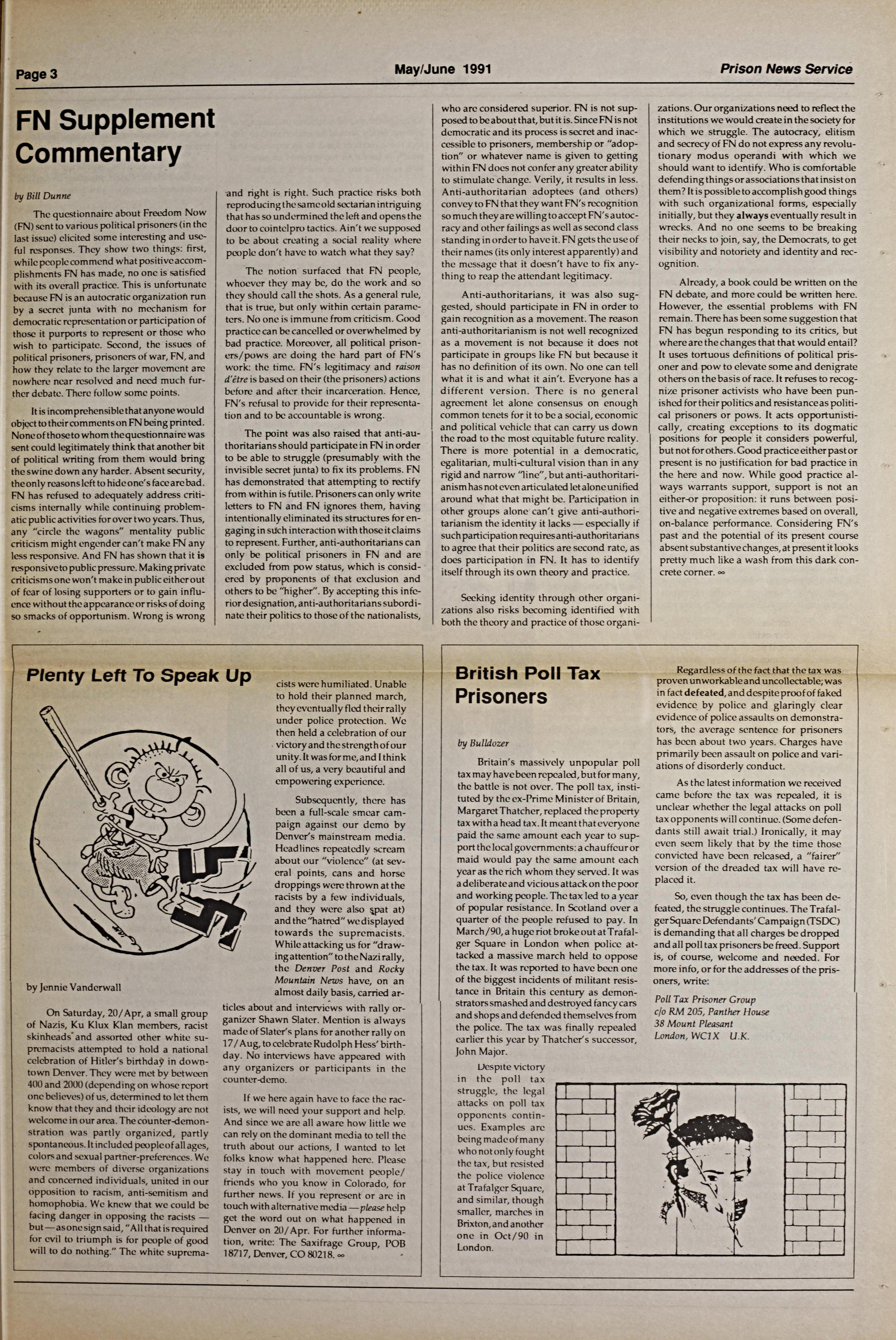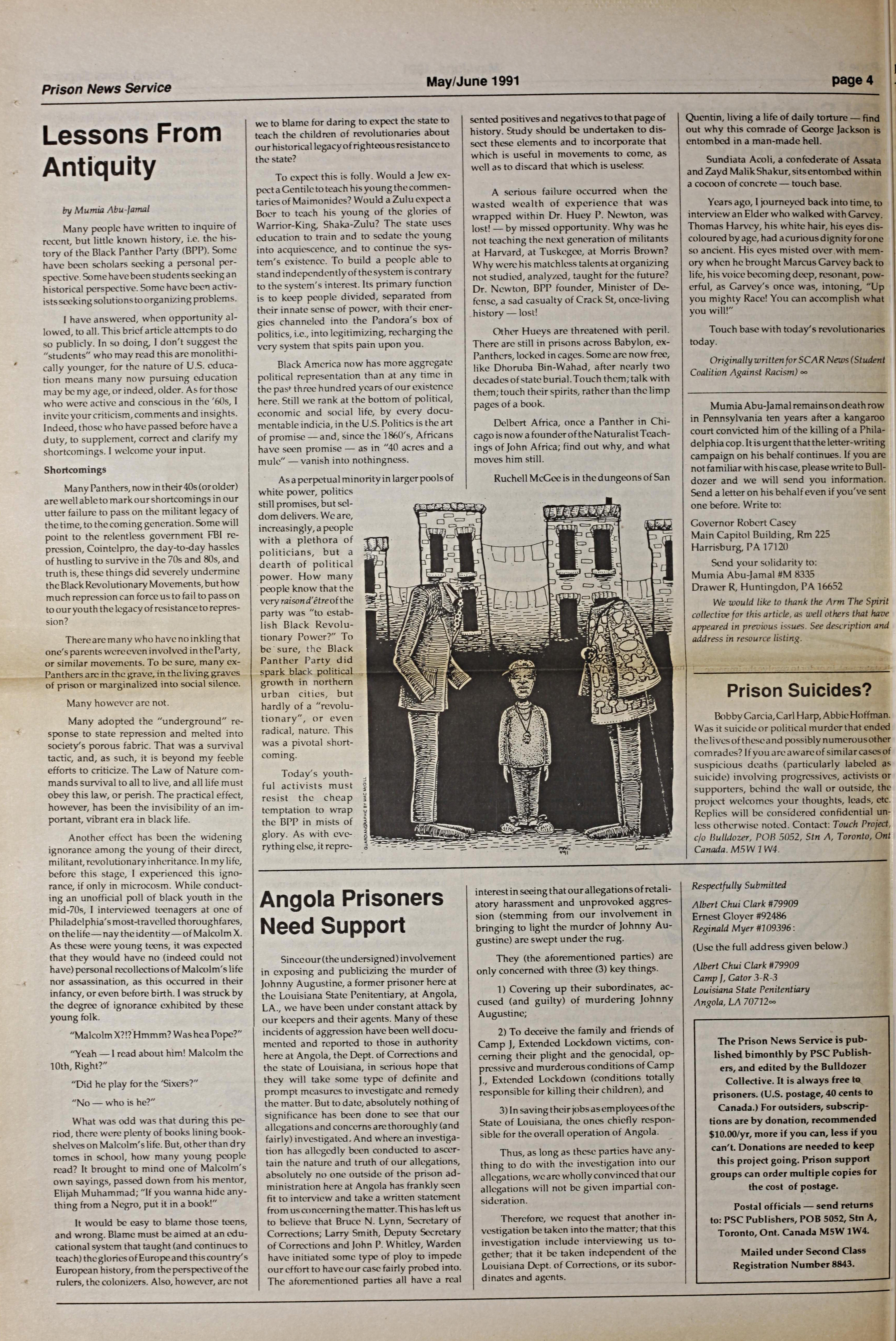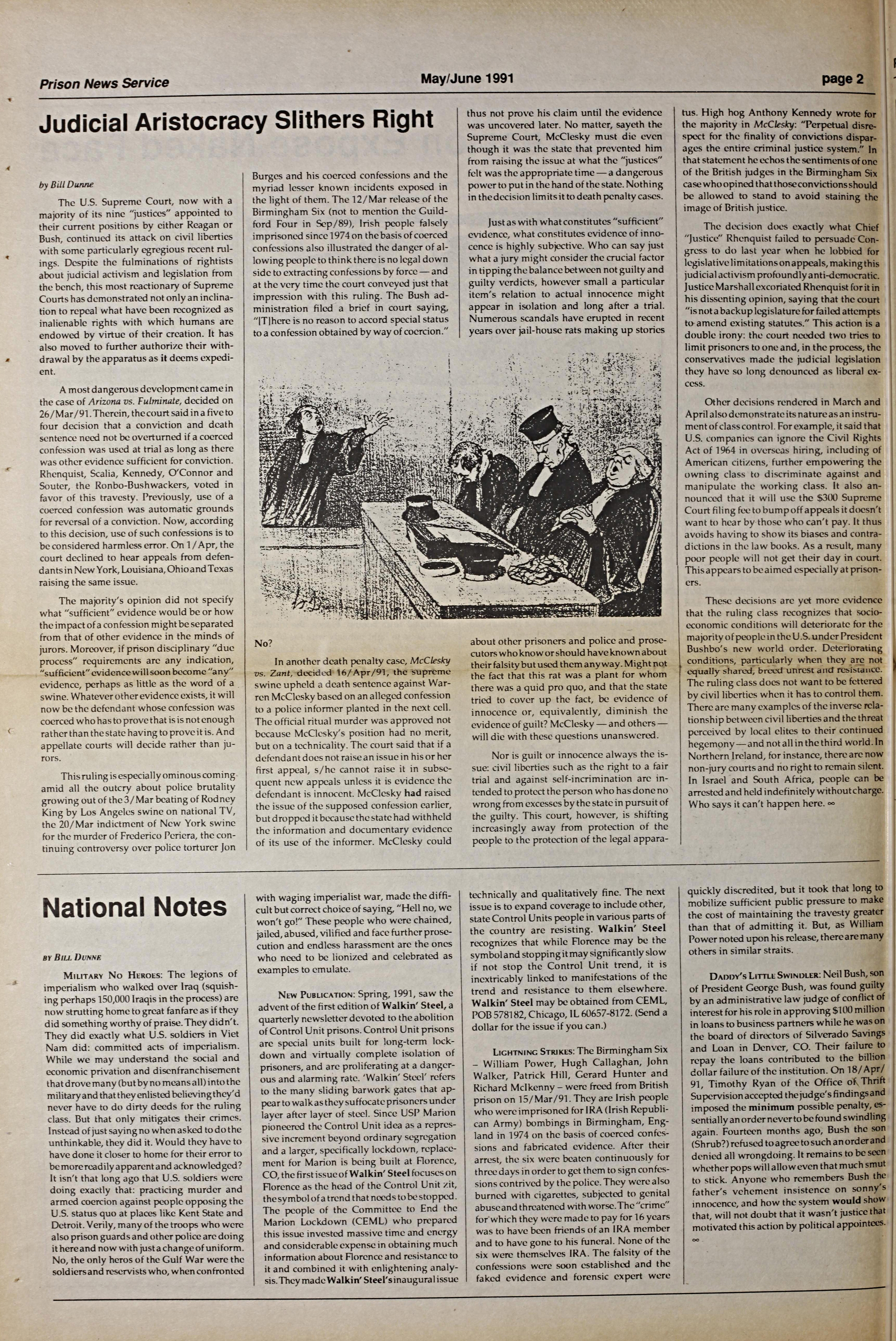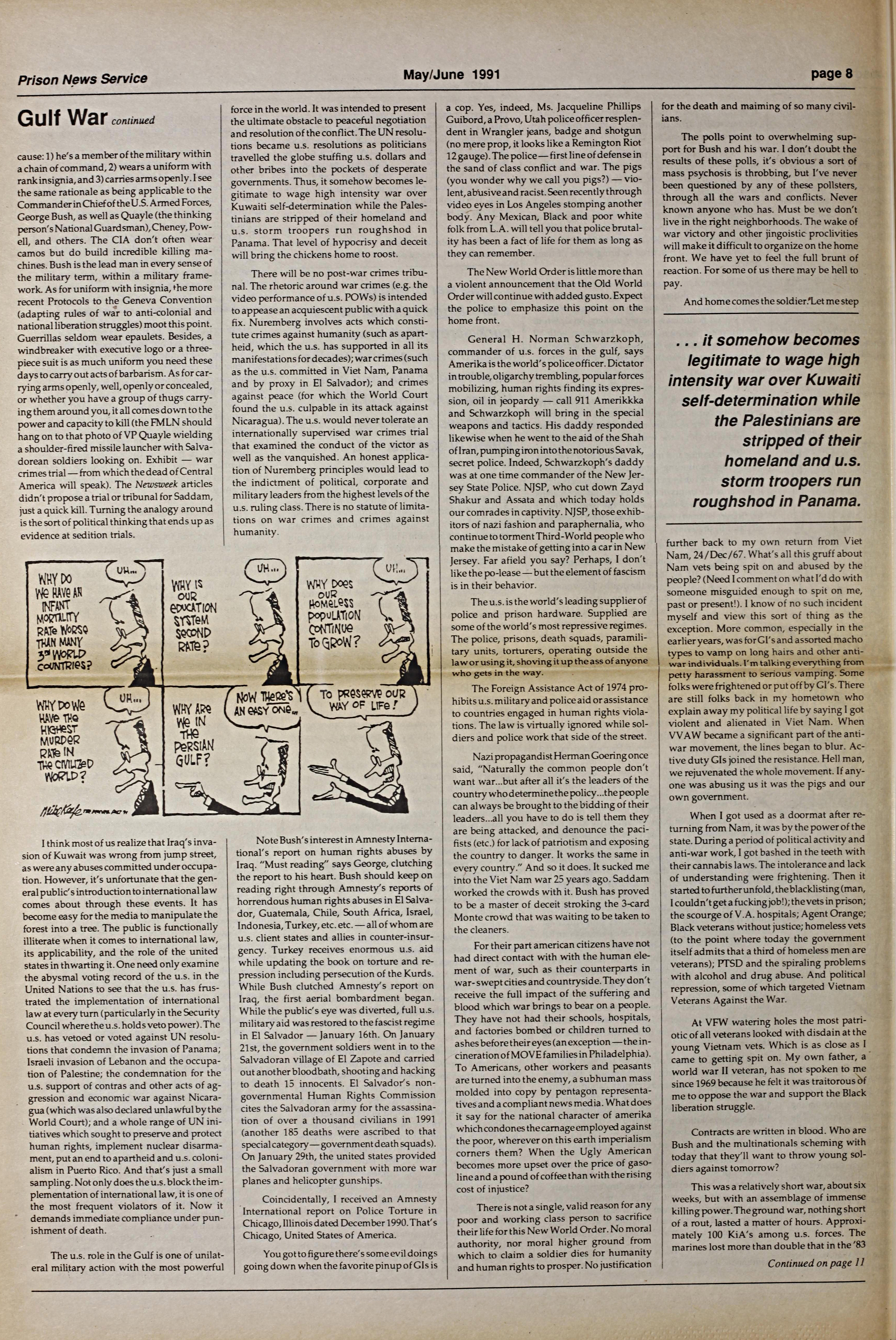 PNS editor: Bulldozer Collective. Article topics include: Los Angeles Police Dept. responsible for the beating of Rodney King ("Agencies of repression expose naked face". by Bill Dunne) -- John Perotti ends hunger strike at Marion after 45 days ("Perotti hungerstrike over") -- U.S. Supreme Court continues its attack on civil liberties ("Judicial aristocracy slithers right", by Bill Dunne) -- Continuing debate on Freedom Now!, following last issue of PNS's FN supplement ("FN supplement commentary", by Bill Dunne) -- Counter-demonstration against fascist rally in Denver to celebrate Hitler's birthday decried as violent by mainstream press ("Plenty left to speak up", by Jennie Vanderwall) -- Legal attacks against poll tax opponents in Britain continue ("British poll tax prisoners", by Bulldozer) -- A short history of the Black Panther Party (BPP) and a call to a new generation to remember those who fought for them ("Lessons from antiquity", by Mumia abu-Jamal) -- "Angola prisoners need support' -- Discussion of whether Michael Stotts, the organizer/editor of Behind the walls is an informer, manipulator and agent of the state ("Michael Stotts, uncovered?", by Larry Giddings) -- Activists calling themselves Direct Action (Ann Hansen, Brent Taylor, Gerry Hannah, Doug Stewart, Julie Belmas), charged in the bombing of a B.C. Hydro sub-station, the bombing of a Litton Industries factory outside of Toronto, and the fire bombing of three outlets of a video chain specializing in violent pornography have been released from prison ("Vancouver 5 released", by Bulldozer) -- Imperialist war in Iraq only benefits the armaments industry ("From behind the wire: view of the Gulf War", by Raymond Luc Levasseur) (Note: p. 6-7 is a double-page spread). Marionette, No. 52, January-February 1991. Editor: Bill Dunne. Article topics include: Contaminated water supply at USP Marion ("Water wiggles") -- Sekou Odinga sent to USP Marion for his radical political activism and known associates ("Political repression") -- USP Marion warden John Clark reassigned to serve as Bureau of Prisons Assistant Director for Community correction and Detention programs in Washington D.C.; new warden is C. Allen Turner ("Another one bites") -- Guards suspected of leaving knife in recreation yard ("Gambling with prisoners lives") -- "Courts used in Canada against the Native struggle", by Jim Campbell.