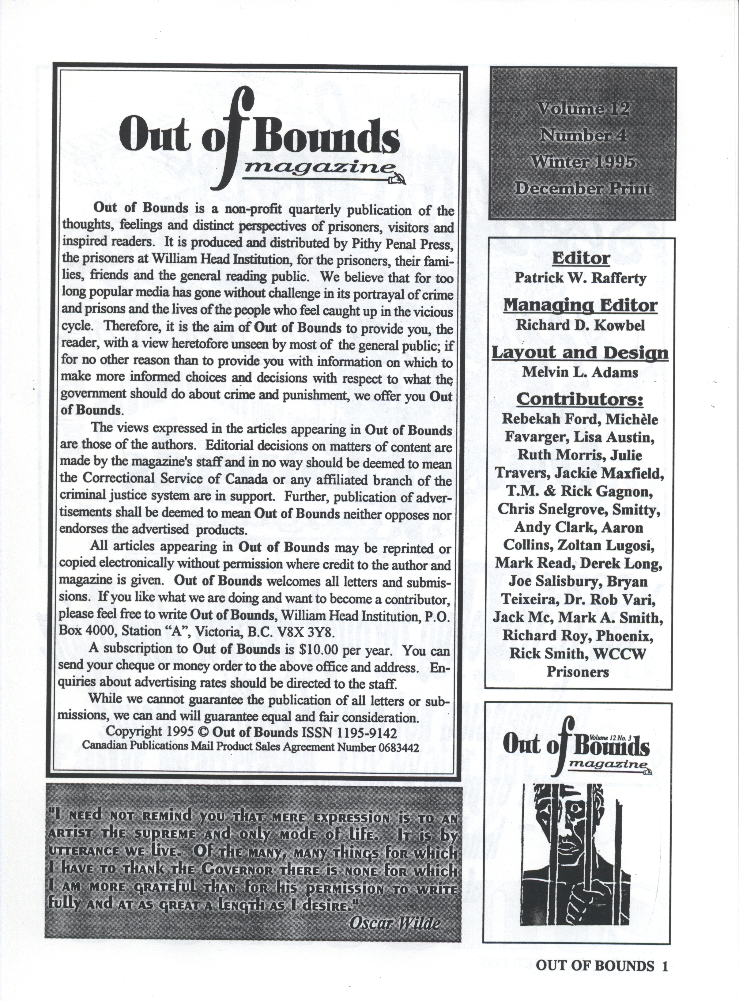 A non-profit quarterly publication of the thoughts, feelings, and distinct perspectives of prisoners and visitors by the prisoners at William Head Institution in Victoria, B.C. with the aim of providing a different view to the general public. Edited by Patrick W. Rafferty.