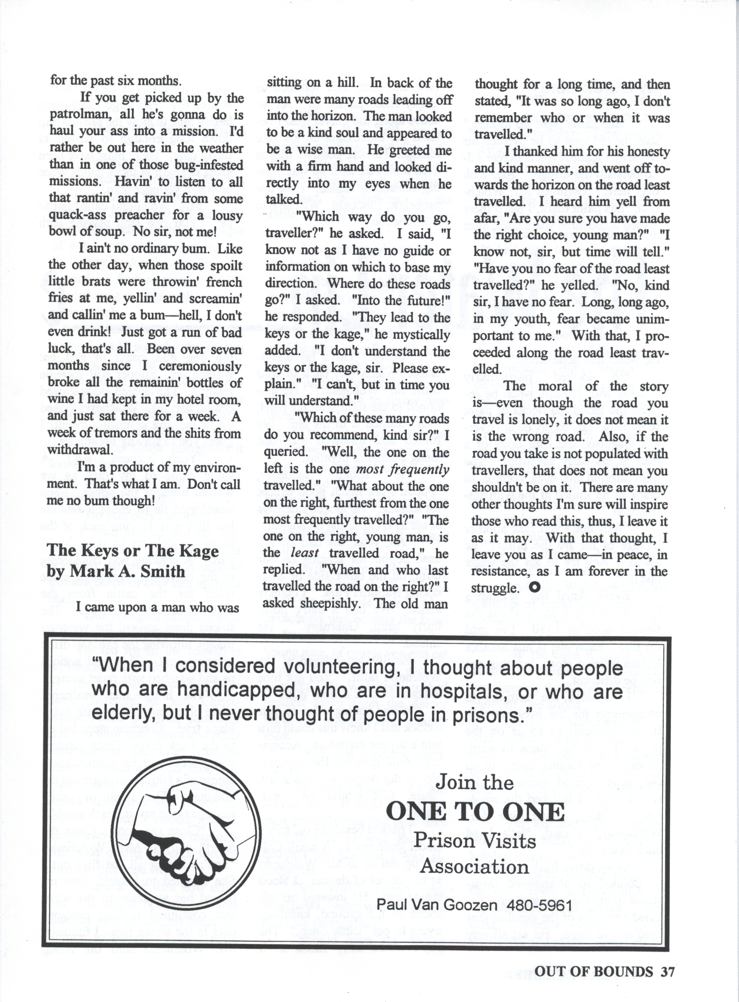 A non-profit quarterly publication of the thoughts, feelings, and distinct perspectives of prisoners and visitors by the prisoners at William Head Institution in Victoria, B.C. with the aim of providing a different view to the general public. Edited by Patrick W. Rafferty.