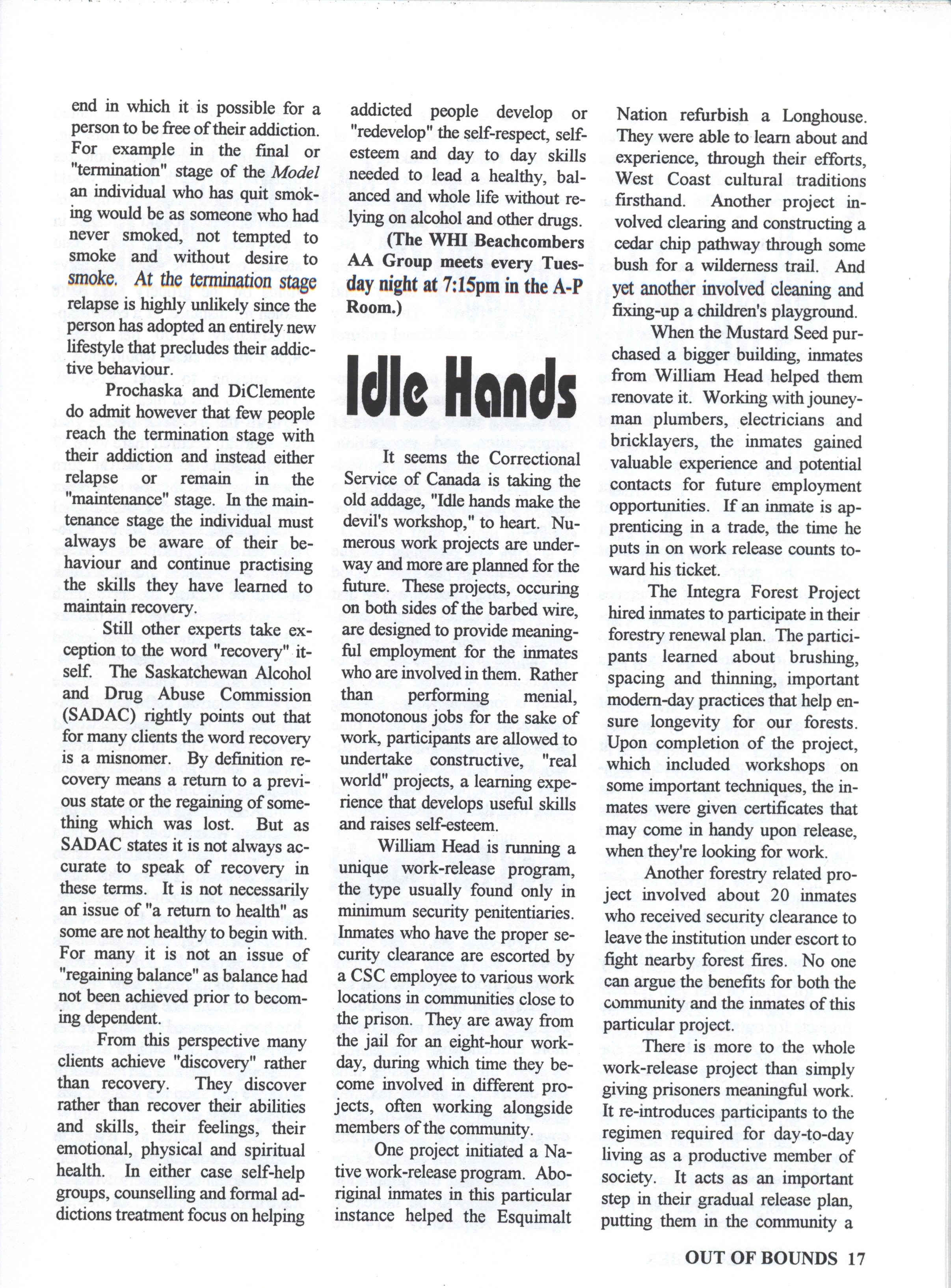 Article topics include: Righteous ones: "what's in it for me?" (editorial) -- Cost to Canadians of prisoner's sentenced for drug related offences -- Announcing the Claire Culhane bursary (University of Northern B.C.) -- William Head Toastmasters Club hosted the Area 8 Canada Day and Humorous Speech Contest -- Work-release programs beneficial to prisoners at William Head -- Pre-Christian religion (Pagans/Wiccans) -- Judicial review: analysis of Section 745 of the Canadian Criminal Code -- Alternatives to prisons exists in other countries: why not in Canada?