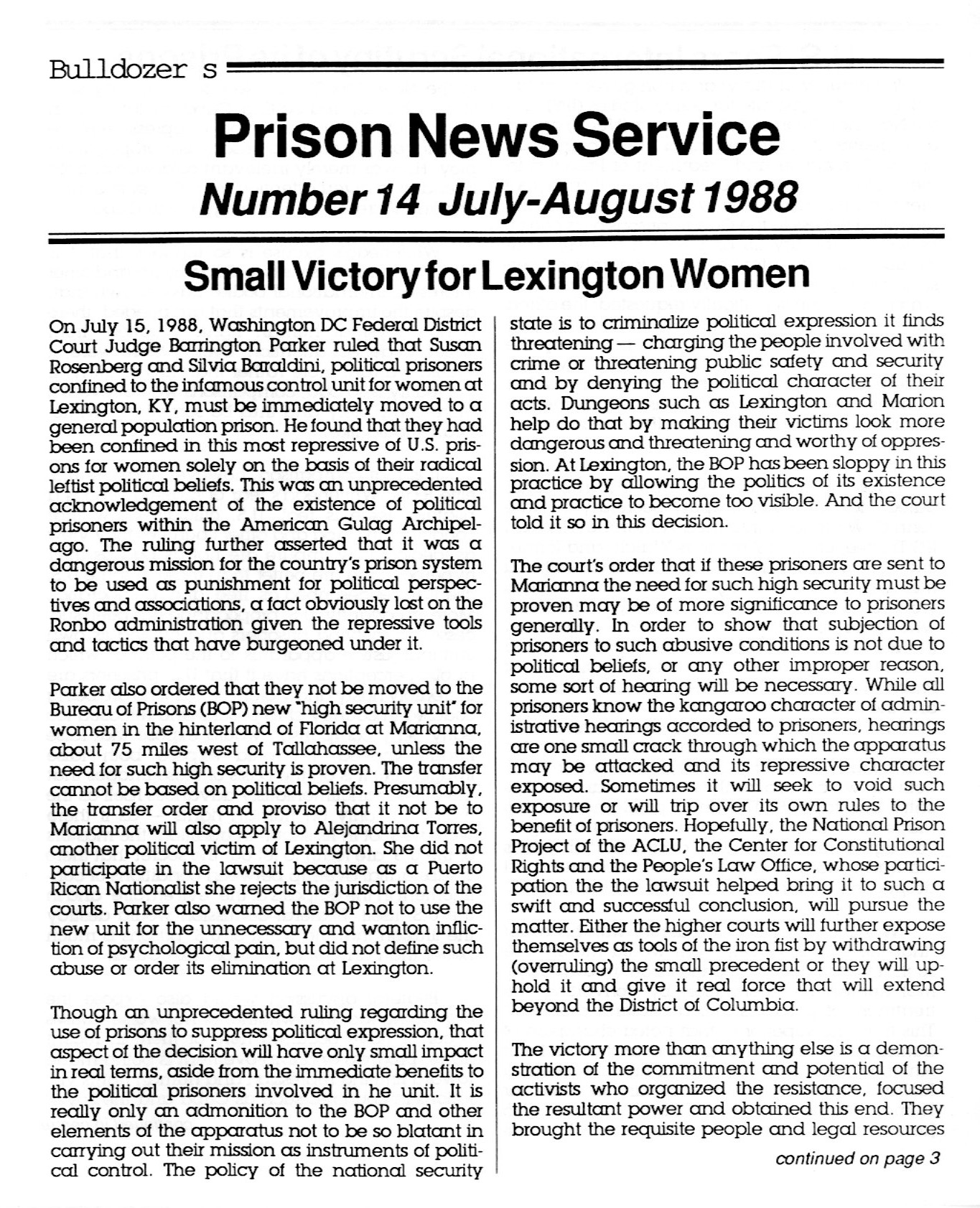 Edited by Bill Dunne. Article topics include: Seventh Circuit Court stumbles over Marion, Marion madness metastacizes, Stealth policy 1988 (by F. Lee Bubba), Marionnotes. (Note: p. 4-5 is a double page spread). PNS No. 14, July-August 1988. Article topics include: Small victory for Lexington women, U.S. fears international scrutiny of its prisons, Atrophic polity (by Kojo Bomani Sabadu)