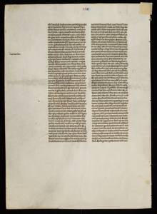 A leaf from a fifteenth century bible. The text is from 1 Kings 7:24-8:33 (Vulgate 3 Kings). Includes the following description: 'A leaf from a fifteenth century bible which shows the great skill of the medieval scribe and the feeling for design and proportion in planning the page. The scribe was forbidden to make any alteration in his work while copying it. Later owners or scribes sometimes added their own additions or corrections. These were known as glosses. There is a gloss on the reverse side (or verso) of the folio and another on the face (or recto) about four inches from the bottom on the ride side, a small VIII in faded ink. 2nd Samuel, VII and VIII.'