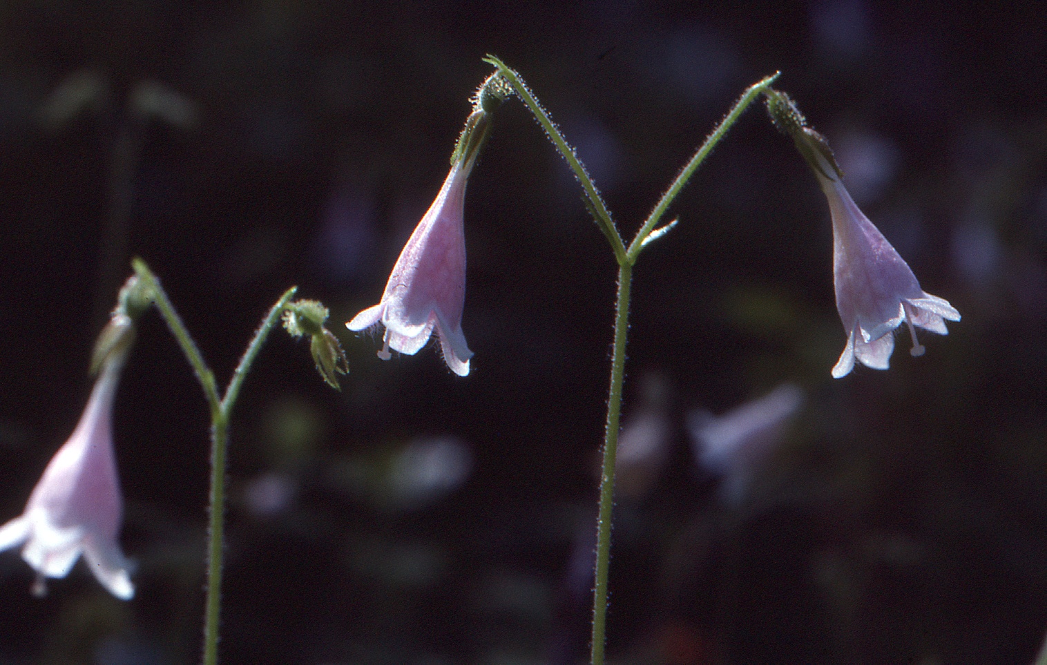 Close-up of pink bell-like flowers in pairs on Y-shaped stalks. Linnaea is a plant genus which has often been classified in the family Caprifoliaceae (the Honeysuckle family) but may be more accurately considered to belong to its own family, Linnaeaceae. Linnaea borealis, also known as twinflower, blooms June through September.
