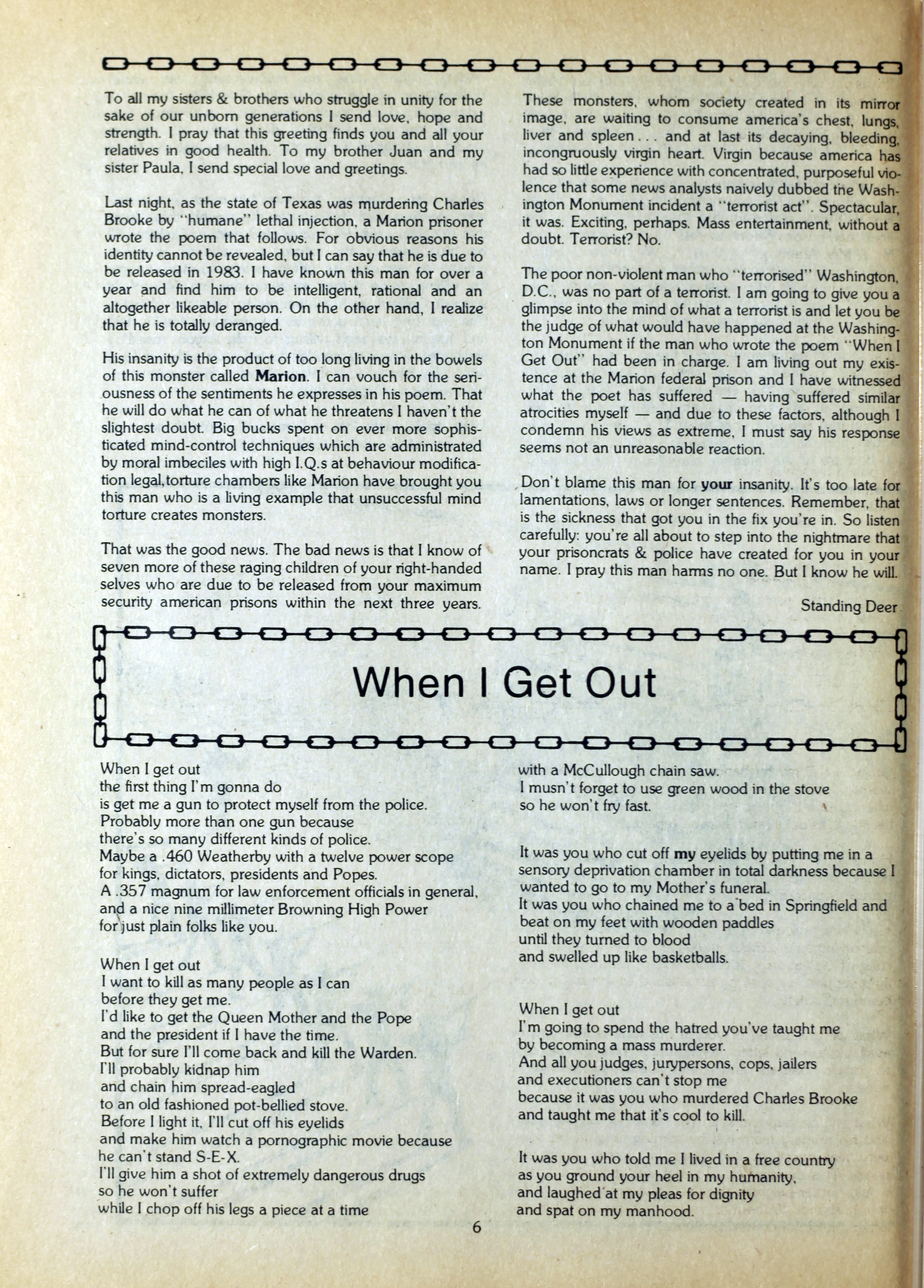 An anarchist publication from Toronto made to support prisoners in various penal institutions. It began in 1980 and featured articles, letters, art, poetry etc. by prisoners and ex-prisoners. By Spring 1997 it had incorporated another journal called the Prison News Service and began to focus more on justice-related issues in Canada, namely: prisons, local jails, refugee detention centres, and First Nations self-determination. In this issue: "Introduction"; "Free the Vancouver Five" [poster title]; "Vancouver Five for life"; "Against the corporate state"; "Southern Buffalo spirit"; "Dakota revenge"; "Arizona State lock down"; "California dreaming"; "Cesspool plunge"; "Report from the Puerto Rican Movement"; "Soldiers of discontent"; "Anarchy can't fight alone"; "Prison, poverty, and power"; "Turtle Island under a cloud"; "Money appeal"; "Survival network"; "Ossining riot"; "Stepping on mocassin"; "Note from Walla Walla"; "Rape is still rape"; "Spiritual feasting"