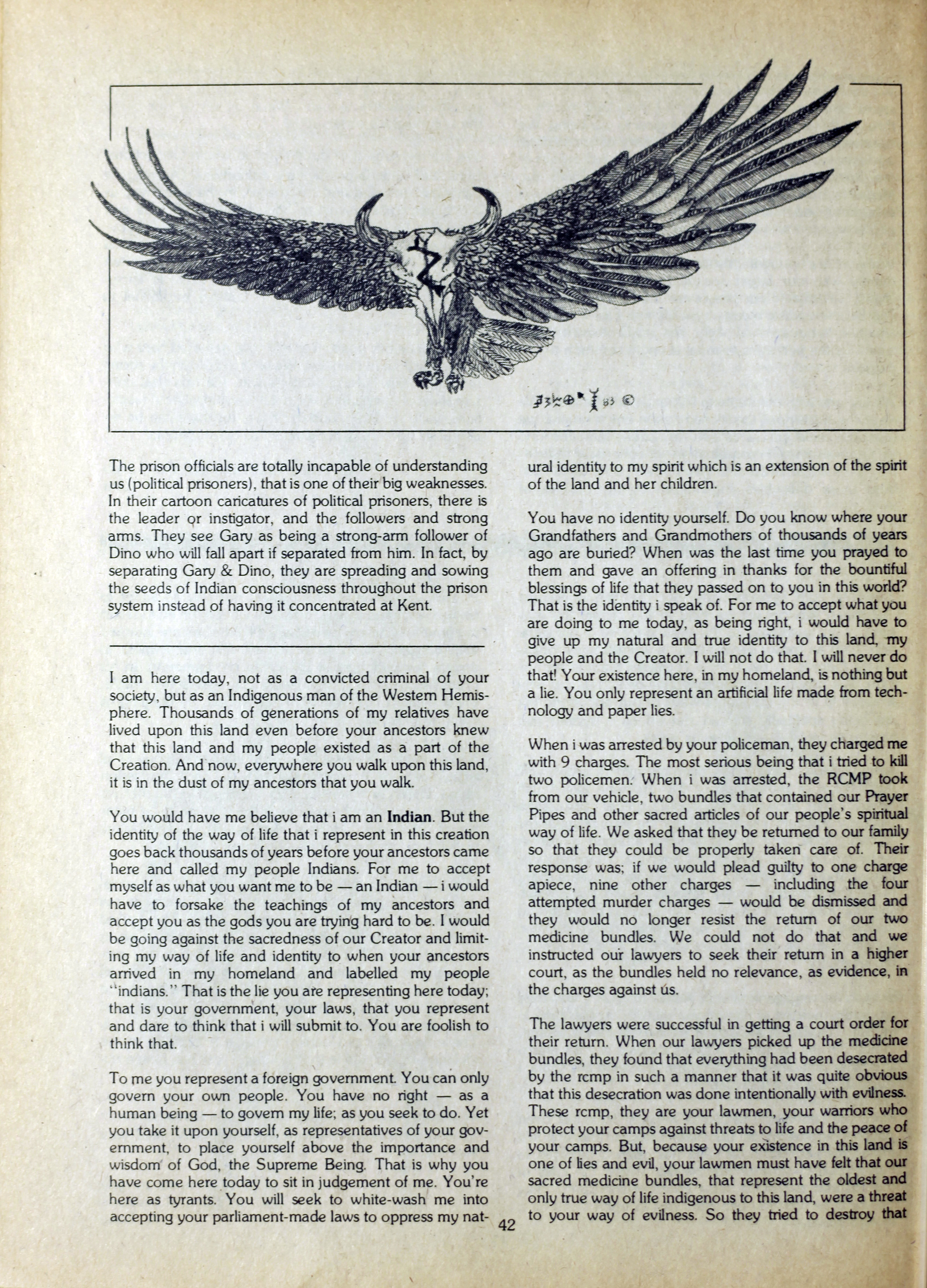 An anarchist publication from Toronto made to support prisoners in various penal institutions. It began in 1980 and featured articles, letters, art, poetry etc. by prisoners and ex-prisoners. By Spring 1997 it had incorporated another journal called the Prison News Service and began to focus more on justice-related issues in Canada, namely: prisons, local jails, refugee detention centres, and First Nations self-determination. In this issue: "Introduction"; "Free the Vancouver Five" [poster title]; "Vancouver Five for life"; "Against the corporate state"; "Southern Buffalo spirit"; "Dakota revenge"; "Arizona State lock down"; "California dreaming"; "Cesspool plunge"; "Report from the Puerto Rican Movement"; "Soldiers of discontent"; "Anarchy can't fight alone"; "Prison, poverty, and power"; "Turtle Island under a cloud"; "Money appeal"; "Survival network"; "Ossining riot"; "Stepping on mocassin"; "Note from Walla Walla"; "Rape is still rape"; "Spiritual feasting"