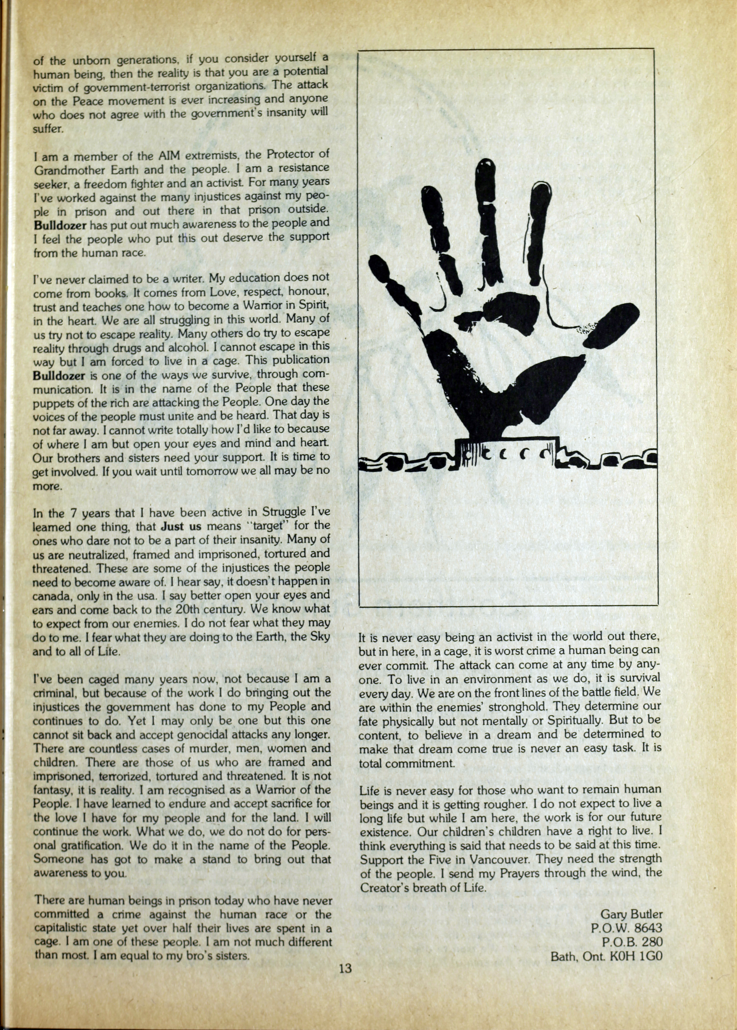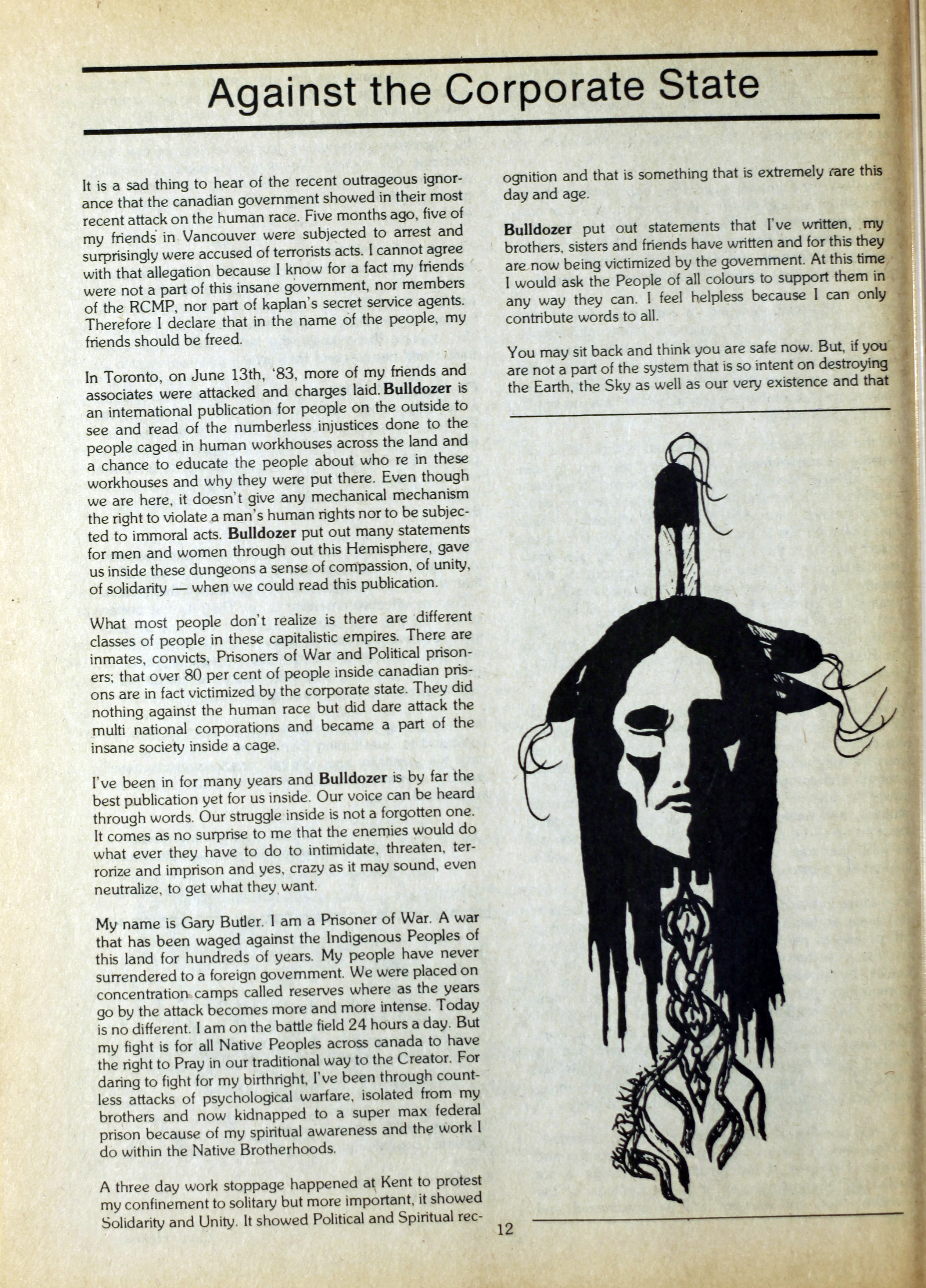 An anarchist publication from Toronto made to support prisoners in various penal institutions. It began in 1980 and featured articles, letters, art, poetry etc. by prisoners and ex-prisoners. By Spring 1997 it had incorporated another journal called the Prison News Service and began to focus more on justice-related issues in Canada, namely: prisons, local jails, refugee detention centres, and First Nations self-determination. In this issue: "Introduction"; "Free the Vancouver Five" [poster title]; "Vancouver Five for life"; "Against the corporate state"; "Southern Buffalo spirit"; "Dakota revenge"; "Arizona State lock down"; "California dreaming"; "Cesspool plunge"; "Report from the Puerto Rican Movement"; "Soldiers of discontent"; "Anarchy can't fight alone"; "Prison, poverty, and power"; "Turtle Island under a cloud"; "Money appeal"; "Survival network"; "Ossining riot"; "Stepping on mocassin"; "Note from Walla Walla"; "Rape is still rape"; "Spiritual feasting"